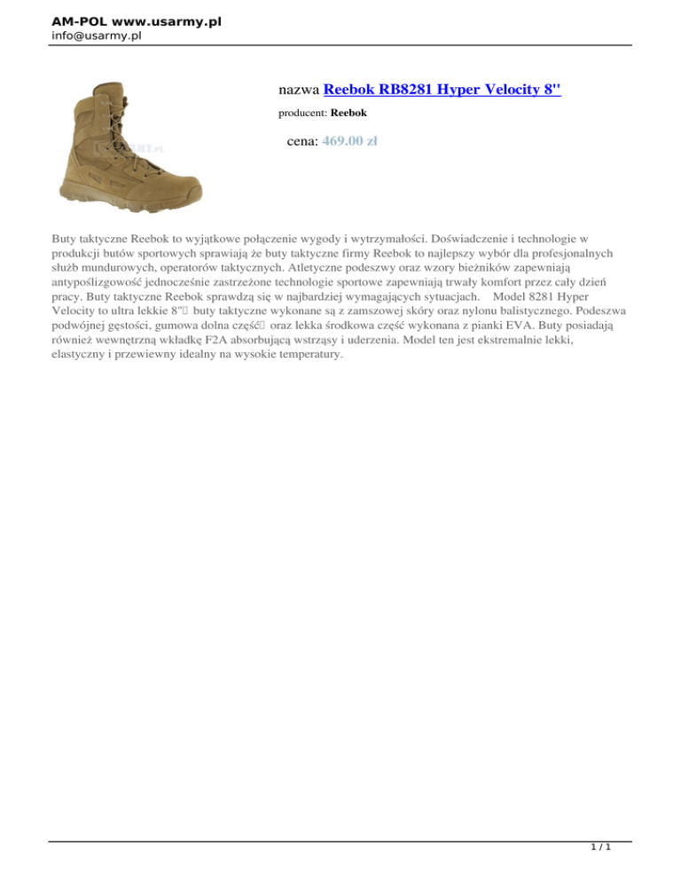 AM-POL www.usarmy.pl [email protected] nazwa Reebok RB8281 Hyper Velocity 8" producent: Reebok cena: 469.00 zł Buty taktyczne Reebok to wyjątkowe połączenie wygody i wytrzymałości. Doświadczenie i technologie w produkcji butów sportowych sprawiają że buty taktyczne firmy Reebok to najlepszy wybór dla profesjonalnych służb mundurowych, operatorów taktycznych. Atletyczne podeszwy oraz wzory bieżników zapewniają antypoślizgowość jednocześnie zastrzeżone technologie sportowe zapewniają trwały komfort przez cały dzień pracy. Buty taktyczne Reebok sprawdzą się w najbardziej wymagających sytuacjach. Model 8281 Hyper Velocity to ultra lekkie 8" buty taktyczne wykonane są z zamszowej skóry oraz nylonu balistycznego. Podeszwa podwójnej gęstości, gumowa dolna część oraz lekka środkowa część wykonana z pianki EVA. Buty posiadają również wewnętrzną wkładkę F2A absorbującą wstrząsy i uderzenia. Model ten jest ekstremalnie lekki, elastyczny i przewiewny idealny na wysokie temperatury. 1/1