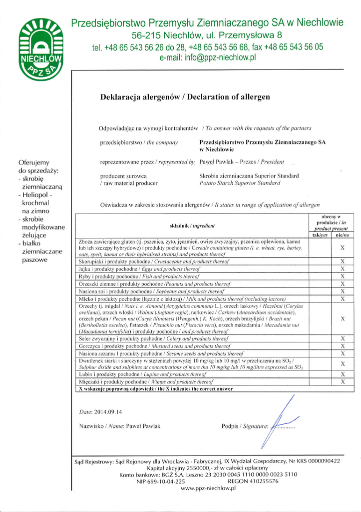Przedsiębiorstwo Przemysłu Ziem n iaczanego SA w N iech lowie 56-215 Niechlów' ul. Przemysłowa B tel. +48 65 543 56 26 do28, +48 65 543 56 68, fax +4B 65 543 56 05 e-mail: [email protected] Deklaracja alergenów / Declaration of allergen odpowiadając na wymogi kontrahentów I To qnswer with the requests of the partners Przedsiębiorstwo Przemyslu Ziemniaczanego SA przedsiębiorstwo / the company w Niechlowie Oferujemy do sprzedaźy: - skrobię ziemniaczaną - Heliopol krochmal na zimno - skrobie modyfikowane żelujące - białko ziemniaczane paszowe reprezentowane przez / represented by Paweł Pawlak _ Prezes / President Skrobia ziemniaczana Superior Standard Potato Starch Superior Stąndtlrd producęnt surowca raw material producer / oświadcza w zakręsie stosowania aIergenów / It stątes in range ofapplication ofallergen obccny w produkcie / i/? sklalni|ł I iryredien ta ldt gs nlcl Zboza zawieraiące gluten (tj' pszenica, zyto,.ięczmień, owies zwyczajny' pszenica oplewiona, kamut lub ich szczępy hybrydowe) i produkty pochodnę / Cereals containiĄg gluten (i. e' wheąt, rye, barIq)' oąts' sDel!' kąm t or their hvbridised strains) and products thereof Skorupiaki i produktY pochodnę / Crustclceans and products thereof Jaika i produktY pochodnę l Eggs ąnd prodtLcts thereof Ryby i produkty pochodnę l Fish and producls thereo/' orzeszki ziemne i produktY pochodne /Peąnuts and products llrcreof Nasiona soi i produkty pochodnę / Soybeąt1s ąnd products thereof Mleko i produkty pochodne (łącznie z laktozą) l Milk and products llrcreof (including lactose) orzęchy ti. migdał / Nuls i' e' Alnond (All|)gdalus communis L')' orzech laskowy l Hazelnut (Coryltts avellana), orzech wloski I Walnlu (Juglans /'egla), nerkowiec / Caslrcu, (Anaccu-ditnt occitlentale), orzech pekan / Pecan nut (Carya illinoiesis (llangenh.) K. Koch\, orzech brazylijski / Brazil nut (Be halletia ercelsa), tjstaszęk l Pistachio nut (Pislclcią vertl), orzęch makadamia / ,Ąy'łcadąnia nu! (Macddamia tenlilblia) i produkty pochodne I and prodtlcts tlrcreof Sęlęr zwyczainy i produkty pochodne / celery ąnd prod cts thereof Gorczyca i produkty pochodnę l Mttstąrd seeds ąnd prod cls lhereof Nasiona sezamu I produkty pochodnę / Sesame seeds and products tlrcreof Dwutlenek siarki i siarczyny w stężeniach powyżej l0 mg/kg lub l0 mg/l w przeliczeniu na So, / Sulphur dixide and sulphites a! concentrations o{ nlore tha l0 ns/ks lub l0 mp/litre expressed as SOl Lubin iprodukty pochodnę l Lupine and prcducts thereaf Mięczaki i produkty pochodne / ||/imps and products thereof x wskrłzuie DoDrawna Dą|e', 20 l4 .09 Nazwisko .| odDowiedź / the x indicatcs the colrect answer 4 / Name: Paweł Pawlak Podpis I Signature: sąd Rejestrowy: Sąd Rejonowy dla Wrocławia - Fabrycznej,lX Wydział Cospodarczy, Nr KRS 0000090422 Kapital akcyjny 255oo0o,- zt W całościopłacony Konto bankowe: BCZ S.A. Leszno 23 2030 0045 I l l0 0000 0023 51 10 RECON 4r 0255576 NtP 699-10-04-225 www.ppz-niechlow.pl X x X x x X X X X x x X X X o