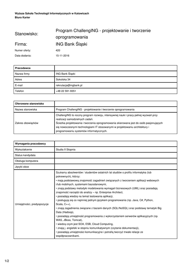Wyższa Szkoła Technologii Informatycznych w Katowicach Biuro Karier Stanowisko: Program ChallengING - projektowanie i tworzenie oprogramowania Firma: ING Bank Śląski Numer oferty: 420 Data dodania: 15-11-2016 Pracodawca Nazwa firmy ING Bank Śląski Adres Sokolska 34 E-mail [email protected] Telefon +48 22 591-9351 Oferowane stanowisko Nazwa stanowiska Program ChallengING - projektowanie i tworzenie oprogramowania ChallengING to roczny program rozwoju, intensywnej nauki i pracy pełnej wyzwań przy Zakres obowiązków realizacji samodzielnych zadań. Ścieżka projektowania i tworzenia oprogramowania skierowana jest do osób pasjonujących się nowoczesnymi technologiami IT stosowanymi w projektowaniu architektury i programowaniu systemów informatycznych. Wymagania pracodawcy Wykształcenie Studia II Stopnia Status kandydata Obsługa komputera Języki obce Szukamy absolwentów / studentów ostatnich lat studiów o profilu informatyka (lub pokrewnych), którzy: • mają podstawową znajomość zagadnień związanych z tworzeniem aplikacji webowych i/lub mobilnych, systemami bazodanowymi, • znają podstawy metodyki modelowania wymagań biznesowych (UML) oraz posiadają znajomość narzędzi do analizy – np. Enterprise Architect, • posiadają wiedzę na temat testowania aplikacji, • posługują się co najmniej jednym językiem programowania (np. Java, C#, Python, Umiejętności, predyspozycje Scala, C++), • znają zagadnienia związane z bazami danych (SQL/NoSQL) oraz podstawy tematyki Big Data (Hadoop), • posiadają umiejętność programowania z wykorzystaniem serwerów aplikacyjnych (np. WAS, JBoss, Tomcat), • wiedzą czym jest SOA, ESB, Cloud Computing, • znają j. angielski w stopniu komunikatywnym (czytanie dokumentacji), • posiadają umiejętności komunikacyjne i potrafią tworzyć trwałe relacje ze współpracownikami. 1/2 Warunki pracy Wymagane dokumenty Formularz aplikacyjny: https://skk.erecruiter.pl//Offer.aspx?oid=2411628&cfg=3b98fe986ed34b308b12efea18c6dcf4&fromSkk=1477376232 Forma umowy umowa o pracę Czas zatrudnienia 1 rok Godzinowy wymiar pracy pełen etat Data rozpoczęcia pracy 0000-00-00 Inne świadczenia Rekrutacja Termin i forma zgłoszenia Sposób kontaktowania się z firmą Formularz aplikacyjny do 20 listopada 2016r. E-mail Oferujemy: Dodatkowe informacje - roczną umowę o pracę z możliwością zatrudnienia po ukończeniu Programu, - atrakcyjne wynagrodzenie i pakiet świadczeń dodatkowych, - możliwość zdobycia doświadczenia, - rozwój kompetencji specjalistycznych i miękkich, - miłą atmosferę pracy. 2/2