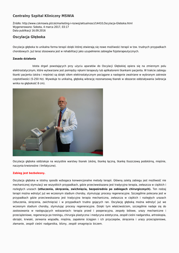 Centralny Szpital Kliniczny MSWiA Źródło: http://www.cskmswia.pl/csk/marketing-i-rozwoj/aktualnosci/14410,Oscylacja-Gleboka.html Wygenerowano: Sobota, 4 marca 2017, 03:17 Data publikacji 16.09.2016 Oscylacja Głęboka Oscylacja głęboka to unikalna forma terapii dzięki której otwierają się nowe możliwości terapii w tzw. trudnych przypadkach chorobowych. Już teraz stosowana jest w rehabilitacji jako uzupełnienie zabiegów fizjoterapeutycznych. Zasada działania Istota drgań powstających przy użyciu aparatów do Oscylacji Głębokiej opiera się na zmiennym polu elektrostatycznym, które wytwarzane jest pomiędzy rękami terapeuty lub aplikatoremi tkankami pacjenta. W trakcie zabiegu tkanki pacjenta (skóra i mięśnie) są dzięki siłom elektrostatycznym pociągane a następnie zwalniane w wybranym zakresie częstotliwości (5-250 Hz). Wywołuje to unikalną, głęboką wibrację rezonansową tkanek w obszarze oddziaływania (wibracja wnika na głębokość 8 cm). Oscylacja głęboka oddziałuje na wszystkie warstwy tkanek (skórę, tkankę łączną, tkankę tłuszczową podskórną, mięśnie, naczynia krwionośne i limfatyczne). Zabieg jest bezbolesny. Oscylacja głęboka w istotny sposób wzbogaca konwencjonalne metody terapii. Główną zaletą zabiegu jest możliwość nie mechanicznej stymulacji we wszystkich przypadkach, gdzie przeciwwskazana jest tradycyjna terapia, zwłaszcza w ciężkich i rozległych urazach (stłuczenia, skręcenia, zwichnięcia, bezpośrednio po zabiegach chirurgicznych). Ten rodzaj terapii można wdrożyć już we wczesnym stadium choroby, stymulując procesy regeneracyjne. Szczególnie polecana jest w przypadkach gdzie przeciwwskazana jest tradycyjna terapia mechaniczna, zwłaszcza w ciężkich i rozległych urazach (stłuczenia, skręcenia, zwichnięcia) i w przypadkach trudno gojących ran. Oscylację głęboką można wdrożyć już we wczesnym stadium choroby, stymulując procesy regeneracyjne. Dzięki tym właściwościom, szczególnie nadaje się do zastosowania w następujących wskazaniach: terapia przed i pooperacyjna, zespoły bólowe, urazy mechaniczne i przeciążeniowe, regeneracja po treningu, chirurgia plastyczna i medycyna estetyczna, zespół cieśni nadgarstka, artroskopia, obrzęki, krwiaki, zerwania wiązadła, mięśnia, zapalenie ścięgien i ich przyczepów, skręcenia i urazy przeciążeniowe, złamanie, zespół cieśni nadgarstka, blizny, zespół smagnięcia biczem. Zakład Usprawniania Leczniczego Informacja o zapisach na zabieg Oscylacji Głębokiej tel. (22) 508 15 22; Szp. Pan Adam Witek - specjalista fizjoterapeuta Zakład Usprawnienia Leczniczego CSK MSWiA Drukuj Generuj PDF Powiadom znajomego Wstecz