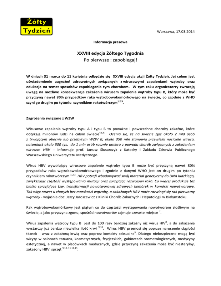 Warszawa, 17.03.2014 Informacja prasowa XXVIII edycja Żółtego Tygodnia Po pierwsze : zapobiegaj! W dniach 31 marca do 11 kwietnia odbędzie się XXVIII edycja akcji Żółty Tydzień. Jej celem jest uświadomienie zagrożeń zdrowotnych związanych z wirusowymi zapaleniami wątroby oraz edukacja na temat sposobów zapobiegania tym chorobom. W tym roku organizatorzy zwracają uwagę na możliwe konsekwencje zakażenia wirusem zapalenia wątroby typu B, który może być przyczyną nawet 80% przypadków raka wątrobowokomórkowego na świecie, co zgodnie z WHO czyni go drugim po tytoniu czynnikiem rakotwórczym1,2,3. Zagrożenia związane z WZW Wirusowe zapalenia wątroby typu A i typu B to poważne i powszechne choroby zakaźne, które dotykają milionów ludzi na całym świecie4,5,6. Ocenia się, że na świecie żyje około 2 mld osób z trwającym obecnie lub przebytym WZW B, około 350 mln stanowią przewlekli nosiciele wirusa, natomiast około 500 tys. do 1 mln osób rocznie umiera z powodu chorób związanych z zakażeniem wirusem HBV – informuje prof. Janusz Ślusarczyk z Katedry i Zakładu Zdrowia Publicznego Warszawskiego Uniwersytetu Medycznego. Wirus HBV wywołujący wirusowe zapalenie wątroby typu B może być przyczyną nawet 80% przypadków raka wątrobowokomórkowego i zgodnie z danymi WHO jest on drugim po tytoniu czynnikiem rakotwórczym 1,2,3. HBV potrafi wbudowywać swój materiał genetyczny do DNA ludzkiego, zwiększając częstość występowania mutacji oraz sprzyjając rozwojowi raka. Co więcej produkuje też białka sprzyjające tzw. transformacji nowotworowej zdrowych komórek w komórki nowotworowe. Tak więc nawet u chorych bez marskości wątroby, a zakażonych HBV może rozwinąć się rak pierwotny wątroby - wyjaśnia doc. Jerzy Jaroszewicz z Kliniki Chorób Zakaźnych i Hepatologii w Białymstoku. Rak wątrobowokomórkowy jest piątym co do częstości występowania nowotworem złośliwym na świecie, a jako przyczyna zgonu, spośród nowotworów zajmuje czwarte miejsce 7. Wirus zapalenia wątroby typu B jest do 100 razy bardziej zakaźny niż wirus HIV8, a do zakażenia wystarczy już bardzo niewielka ilość krwi 9,10. Wirus HBV przenosi się poprzez naruszenie ciągłości tkanek wraz z zakażoną krwią oraz poprzez kontakty seksualne9. Dlatego niebezpieczne mogą być wizyty w salonach tatuażu, kosmetycznych, fryzjerskich, gabinetach stomatologicznych, medycyny estetycznej, a nawet w placówkach medycznych, gdzie przyczyną zakażenia może być niesterylny, zakażony HBV sprzęt 9,10, 11,12,13. Osoby dorosłe zakażone wirusem zapalenia wątroby typu B mogą nie być świadome swojej choroby, ponieważ szacuje się, że około 50% przypadków przebiega bezobjawowo14. Prawda jest taka, że większość przypadków zakażeń wykrywamy przypadkowo. Czy to przy okazji badań kontrolnych, czy też pobytu w szpitalu z innych przyczyn. Tak więc zdecydowana większość pacjentów o swoim zakażeniu nie wie - zwraca uwagę doc. Jaroszewicz i przypomina, że niestety nie ma obecnie terapii umożliwiającej skuteczne i całkowite pozbycie się wirusa WZW typu B z organizmu osoby zakażonej: Niestety przy obecnym stanie wiedzy nie jest możliwe kompletne usunięcie wirusa z organizmu, ponieważ pozostaje on w małych ilościach w zakażonych komórkach wątrobowych, nawet jeżeli jest niewykrywalny we krwi. Z tego powodu rekomendowaną metodą profilaktyki WZW typu B są szczepienia. Szczepienie przeciw WZW B ma kluczowe znaczenie w prewencji pierwotnego raka wątroby. Jest to pierwsza szczepionka opracowana przez naukowców, która ma działanie przeciwnowotworowe i jedna z dwóch istniejących na świecie, poza szczepieniem przeciwko wirusowi ludzkiego brodawczaka, który wywołuje raka szyjki macicy. – podsumowuje doc. Jaroszewicz. Szczepionka przeciw WZW typu B ma doskonały profil bezpieczeństwa oraz skuteczności. Od roku 1982, gdy została wprowadzona, na całym świecie zostało już podanych ponad miliard dawek15. Kto powinien się zaszczepić przeciwko WZW typu B? „Szczepienie przeciw WZW B należy zalecić wszystkim osobom dorosłym, które dotychczas były nieszczepione” – mówi profesor Ślusarczyk. W Polsce obowiązkowe szczepienia przeciwko WZW typu B wśród niemowląt zostały wprowadzone w 1994 roku, zatem wszystkie osoby urodzone wcześniej oraz te, które do tej pory nie zaszczepiły się, powinny w trosce o własne zdrowie rozważyć taką możliwość16. Szczepienie jest szczególnie zalecane osobom, które ze względu na tryb życia lub wykonywane zajęcia są narażone na zakażenia związane z uszkodzeniem ciągłości tkanek lub osobom, które mają kontakty seksualne z nieznanymi partnerami15,17,18. Zaleca się je również przewlekle chorym o wysokim ryzyku zakażenia, z chorobami przebiegającymi z niedoborem odporności, w tym leczonym immunosupresyjnie, chorym z cukrzycą oraz pacjentom dializowanym17. Nie zapominajmy o WZW typu A Podczas akcji Żółty Tydzień mówimy także o profilaktyce wirusowego zapalenia wątroby typu A, zwanego potocznie przez pacjentów „żółtaczką pokarmową”19 lub „chorobą brudnych rąk” 20,21. Do zakażenia może dojść poprzez bezpośredni kontakt z osobą chorą lub spożycie zakażonej wirusem HAV żywności lub wody (również w postaci kostki lodu, np. w drinku) 11,22,23 . Najskuteczniejszą formą profilaktyki WZW typu A są szczepienia ochronne19,23. Po pierwsze: zapobiegaj! Punkty szczepień biorące udział w akcji Żółty Tydzień, oferują szczepionki skojarzone zabezpieczające jednocześnie przed zachorowaniem na WZW typu B i typu A, jak również szczepionki monowalentne zabezpieczające przed jedną z tych chorób. Standardowy schemat szczepienia składa się z trzech dawek – pierwszą podaje się w dowolnym terminie, drugą po upływie miesiąca, natomiast trzecią po upływie pół roku od przyjęcia pierwszej dawki. Tylko w przypadku szczepienia prz