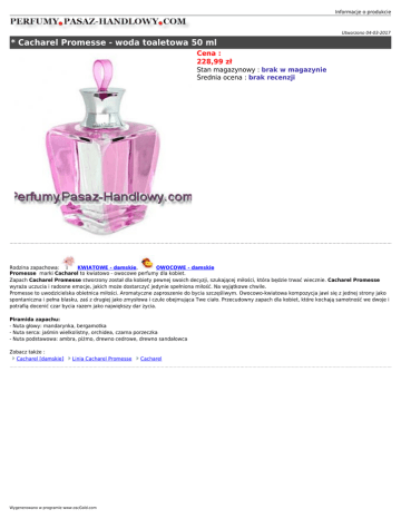 Informacje o produkcie Utworzono 04-03-2017 * Cacharel Promesse - woda toaletowa 50 ml Cena : 228,99 zł Stan magazynowy : brak w magazynie Średnia ocena : brak recenzji Rodzina zapachowa: KWIATOWE - damskie, OWOCOWE - damskie Promesse marki Cacharel to kwiatowo - owocowe perfumy dla kobiet. Zapach Cacharel Promesse stworzony został dla kobiety pewnej swoich decyzji, szukającej miłości, która będzie trwać wiecznie. Cacharel Promesse wyraża uczucia i radosne emocje, jakich może dostarczyć jedynie spełniona miłość. Na wyjątkowe chwile. Promesse to uwodzicielska obietnica miłości. Aromatyczne zaproszenie do bycia szczęśliwym. Owocowo-kwiatowa kompozycja jawi się z jednej strony jako spontaniczna i pełna blasku, zaś z drugiej jako zmysłowa i czule obejmująca Twe ciało. Przecudowny zapach dla kobiet, które kochają samotność we dwoje i potrafią docenić czar bycia razem jako największy dar życia. Piramida zapachu: - Nuta głowy: mandarynka, bergamotka - Nuta serca: jaśmin wielkolistny, orchidea, czarna porzeczka - Nuta podstawowa: ambra, piżmo, drewno cedrowe, drewno sandałowca Zobacz także : Cacharel [damskie] Linia Cacharel Promesse Wygenerowano w programie www.oscGold.com Cacharel