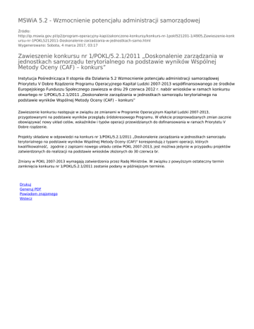 MSWiA 5.2 - Wzmocnienie potencjału administracji samorządowej Źródło: http://ip.mswia.gov.pl/ip2/program-operacyjny-kapi/zakonczone-konkursy/konkurs-nr-1pokl521201-1/4905,Zawieszenie-konk ursu-nr-1POKL5212011-Doskonalenie-zarzadzania-w-jednostkach-samo.html Wygenerowano: Sobota, 4 marca 2017, 03:17 Zawieszenie konkursu nr 1/POKL/5.2.1/2011 „Doskonalenie zarządzania w jednostkach samorządu terytorialnego na podstawie wyników Wspólnej Metody Oceny (CAF) – konkurs” Instytucja Pośrednicząca II stopnia dla Działania 5.2 Wzmocnienie potencjału administracji samorządowej Priorytetu V Dobre Rządzenie Programu Operacyjnego Kapitał Ludzki 2007-2013 współfinansowanego ze środków Europejskiego Funduszu Społecznego zawiesza w dniu 29 czerwca 2012 r. nabór wniosków w ramach konkursu otwartego nr 1/POKL/5.2.1/2011 „Doskonalenie zarządzania w jednostkach samorządu terytorialnego na podstawie wyników Wspólnej Metody Oceny (CAF) – konkurs” Zawieszenie konkursu następuje w związku ze zmianami w Programie Operacyjnym Kapitał Ludzki 2007-2013, przygotowanymi na podstawie wyników przeglądu śródokresowego Programu. W efekcie przeprowadzanych zmian zacznie obowiązywać nowy układ celów, wskaźników i typów operacji przewidzianych do dofinansowania w ramach Priorytetu V Dobre rządzenie. Projekty składane w odpowiedzi na konkurs nr 1/POKL/5.2.1/2011 „Doskonalenie zarządzania w jednostkach samorządu terytorialnego na podstawie wyników Wspólnej Metody Oceny (CAF)" korespondują z typami operacji, których kwalifikowalność, zgodnie z zapisami nowego układu celów POKL 2007-2013, jest możliwa jedynie w przypadku projektów zatwierdzonych do realizacji na podstawie wniosków złożonych do 30 czerwca br. Zmiany w POKL 2007-2013 wymagają zatwierdzenia przez Radę Ministrów. W związku z powyższym ostateczny termin zamknięcia konkursu nr 1/POKL/5.2.1/2011 zostanie podany w późniejszym terminie. Drukuj Generuj PDF Powiadom znajomego Wstecz