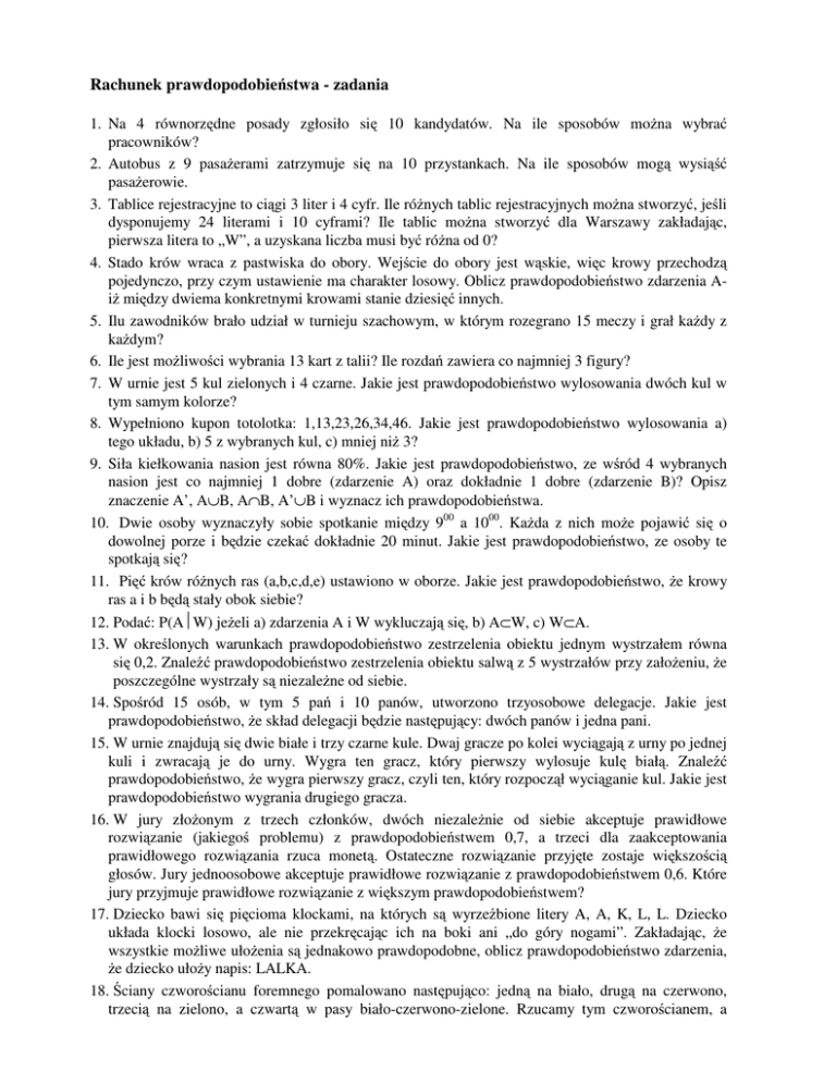 Rachunek prawdopodobieństwa - zadania 1. Na 4 równorzędne posady zgłosiło się 10 kandydatów. Na ile sposobów moŜna wybrać pracowników? 2. Autobus z 9 pasaŜerami zatrzymuje się na 10 przystankach. Na ile sposobów mogą wysiąść pasaŜerowie. 3. Tablice rejestracyjne to ciągi 3 liter i 4 cyfr. Ile róŜnych tablic rejestracyjnych moŜna stworzyć, jeśli dysponujemy 24 literami i 10 cyframi? Ile tablic moŜna stworzyć dla Warszawy zakładając, pierwsza litera to „W”, a uzyskana liczba musi być róŜna od 0? 4. Stado krów wraca z pastwiska do obory. Wejście do obory jest wąskie, więc krowy przechodzą pojedynczo, przy czym ustawienie ma charakter losowy. Oblicz prawdopodobieństwo zdarzenia AiŜ między dwiema konkretnymi krowami stanie dziesięć innych. 5. Ilu zawodników brało udział w turnieju szachowym, w którym rozegrano 15 meczy i grał kaŜdy z kaŜdym? 6. Ile jest moŜliwości wybrania 13 kart z talii? Ile rozdań zawiera co najmniej 3 figury? 7. W urnie jest 5 kul zielonych i 4 czarne. Jakie jest prawdopodobieństwo wylosowania dwóch kul w tym samym kolorze? 8. Wypełniono kupon totolotka: 1,13,23,26,34,46. Jakie jest prawdopodobieństwo wylosowania a) tego układu, b) 5 z wybranych kul, c) mniej niŜ 3? 9. Siła kiełkowania nasion jest równa 80%. Jakie jest prawdopodobieństwo, ze wśród 4 wybranych nasion jest co najmniej 1 dobre (zdarzenie A) oraz dokładnie 1 dobre (zdarzenie B)? Opisz znaczenie A’, A∪B, A∩B, A’∪B i wyznacz ich prawdopodobieństwa. 10. Dwie osoby wyznaczyły sobie spotkanie między 900 a 1000. KaŜda z nich moŜe pojawić się o dowolnej porze i będzie czekać dokładnie 20 minut. Jakie jest prawdopodobieństwo, ze osoby te spotkają się? 11. Pięć krów róŜnych ras (a,b,c,d,e) ustawiono w oborze. Jakie jest prawdopodobieństwo, Ŝe krowy ras a i b będą stały obok siebie? 12. Podać: P(AW) jeŜeli a) zdarzenia A i W wykluczają się, b) A⊂W, c) W⊂A. 13. W określonych warunkach prawdopodobieństwo zestrzelenia obiektu jednym wystrzałem równa się 0,2. Znaleźć prawdopodobieństwo zestrzelenia obiektu salwą z 5 wystrzałów przy załoŜeniu, Ŝe poszczególne wystrzały są niezaleŜne od siebie. 14. Spośród 15 osób, w tym 5 pań i 10 panów, utworzono trzyosobowe delegacje. Jakie jest prawdopodobieństwo, Ŝe skład delegacji będzie następujący: dwóch panów i jedna pani. 15. W urnie znajdują się dwie białe i trzy czarne kule. Dwaj gracze po kolei wyciągają z urny po jednej kuli i zwracają je do urny. Wygra ten gracz, który pierwszy wylosuje kulę białą. Znaleźć prawdopodobieństwo, Ŝe wygra pierwszy gracz, czyli ten, który rozpoczął wyciąganie kul. Jakie jest prawdopodobieństwo wygrania drugiego gracza. 16. W jury złoŜonym z trzech członków, dwóch niezaleŜnie od siebie akceptuje prawidłowe rozwiązanie (jakiegoś problemu) z prawdopodobieństwem 0,7, a trzeci dla zaakceptowania prawidłowego rozwiązania rzuca monetą. Ostateczne rozwiązanie przyjęte zostaje większością głosów. Jury jednoosobowe akceptuje prawidłowe rozwiązanie z prawdopodobieństwem 0,6. Które jury przyjmuje prawidłowe rozwiązanie z większym prawdopodobieństwem? 17. Dziecko bawi się pięcioma klockami, na których są wyrzeźbione litery A, A, K, L, L. Dziecko układa klocki losowo, ale nie przekręcając ich na boki ani „do góry nogami”. Zakładając, Ŝe wszystkie moŜliwe ułoŜenia są jednakowo prawdopodobne, oblicz prawdopodobieństwo zdarzenia, Ŝe dziecko ułoŜy napis: LALKA. 18. Ściany czworościanu foremnego pomalowano następująco: jedną na biało, drugą na czerwono, trzecią na zielono, a czwartą w pasy biało-czerwono-zielone. Rzucamy tym czworościanem, a następnie patrzymy, jaki kolor pojawił się na ściance, na którą upadł. Zbadać, czy zdarzenia polegające na pojawieniu się ściany mającej chociaŜby częściowo, kolor biały – B, czerwony – C, zielony – Z, są niezaleŜne parami. 19. W pudełku znajduje się 15 piłek do tenisa, w tym 9 starych. Z pudełka wybrano 3 piłki, którymi grano. Obliczyć prawdopodobieństwo uŜycia tylko piłek starych. 20. Mamy dwie urny X i Y. Urna X zawiera jedną kulę białą i jedną czerwoną. Urna Y zawiera dwie kule białe i trzy czerwone. Z urny X wylosowano kulę, przełoŜono ją do urny Y, a następnie wylosowano kulę z urny Y. Obliczyć prawdopodobieństwo zdarzeń: 1) obie kule były tego samego koloru, 2) z urny Y wylosowano kulę białą. 21. Wiadomo, Ŝe 5 % wszystkich męŜczyzn i 0,25 % wszystkich kobiet to daltoniści. Spośród grupy 60 męŜczyzn i 400 kobiet wybrano losowo jedną osobę. Jakie jest prawdopodobieństwo wylosowania męŜczyzny pod warunkiem wylosowania osoby, która jest daltonistą? 22. Piętnaście zestawów egzaminacyjnych zawiera po trzy pytania kaŜdy, przy czym pytania nie powtarzają się. Jakie jest prawdopodobieństwo, Ŝe uczeń zda egzamin, jeśli zna odpowiedź na 35 pytań, a do tego, Ŝeby zdać egzamin, wystarczy odpowiedzieć na dwa pytania z zestawu. 23. Z klas A i B moŜe pojechać na wycieczkę tylko jedna osoba, którą wybiera się losowo w następujący sposób: rzuca się trzy razy monetą i jeŜeli wypadną same orły, to losuje się uczestnika wycieczki z klasy A, a w pozostałych przypadkach z klasy B. Obliczyć prawdopodobieństwo tego, Ŝe na wycieczkę pojedzie chłopiec, wiedząc, Ŝe w klasie A jest 20 dziewcząt i 10 chłopców, a w klasie B- 15 dziewcząt i 15 chłopców. 24. Grupa psów składa się z trzech ras w proporcji 5 : 3 : 1. Umaszczenie czarne zdarza się u tych ras odpowiednio z częstością: 5%, 3% i 2%. Jakie jest prawdopodobieństwo: a) wylosowania czarnego psa, b) tego, Ŝe wylosowany czarny pies pochodzi z rasy pierwszej? 25. Prawdopodobieństwo kupienia dobrej puszki w sklepie jest równe 95%. Sklep zaopatruje się u dwóch dostawców, przy czym pierwszy dostarcza 30% towaru o wadliwości 10%. Jakie jest prawdopodobieństwo 
