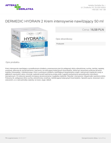 Apteka Derlatka Sp. j. Ul. Źródłowa 20, 25-335 Kielce +48 530 145 138 DERMEDIC HYDRAIN 2 Krem intensywnie nawilżający 50 ml Cena: 16,58 PLN Opis słownikowy Producent Opis produktu Krem intensywnie nawilżający o przedłużonym działaniu, przeznaczony jest do pielęgnacji skóry odwodnionej, suchej, cienkiej, napiętej, wrażliwej, skłonnej do zaczerwienienia i pieczenia, nie tolerującej tradycyjnych kosmetyków. Może być stosowany podczas leczenia trądziku różowatego i młodzieńczego. Krem o potrójnym działaniu nawilżającym bezpośrednio wiąże i zatrzymuje cząsteczki wody w głębokich warstwach skóry, chroniąc naskórek przed nadmierną utratą wody. Łagodzi podrażnienia spowodowane czynnikami zewnętrznymi. W widoczny sposób zmniejsza zaczerwienienia i wygładza naskórek. Rezultat: intensywnie i długotrwale nawilżona skóra. Polecany do: pielęgnacji skóry suchej, odwodnionej, wrażliwej, nietolerującej tradycyjnych kosmetyków. Sposób uzycia: stosować rano i wieczorem, a w razie potrzeby częściej, na twarz, szyję i dekolt. Plik wygenerowano: 04-03-2017 Powered by TCPDF (www.tcpdf.org) Oprogramowanie sklepu: AptusShop