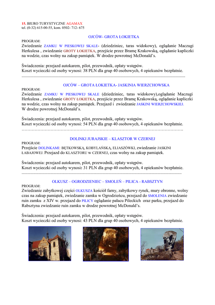 15. BIURO TURYSTYCZNE AGAMAX tel. (0-32) 615-00-55, kom. 0502- 712- 675 OJCÓW- GROTA ŁOKIETKA PROGRAM: Zwiedzanie ZAMKU W PIESKOWEJ SKALE- (dziedziniec, taras widokowy), oglądanie Maczugi Herkulesa , zwiedzanie GROTY ŁOKIETKA, przejście przez Bramę Krakowską, oglądanie kapliczki na wodzie, czas wolny na zakup pamiątek. W drodze powrotnej McDonald’s. Świadczenia: przejazd autokarem, pilot, przewodnik, opłaty wstępów. Koszt wycieczki od osoby wynosi: 38 PLN dla grup 40 osobowych, 4 opiekunów bezpłatnie. ....................................................................................................................................................... OJCÓW – GROTA ŁOKIETKA- JASKINIA WIERZCHOWSKA PROGRAM: Zwiedzanie ZAMKU W PIESKOWEJ SKALE (dziedziniec, taras widokowy),oglądanie Maczugi Herkulesa , zwiedzanie GROTY ŁOKIETKA, przejście przez Bramę Krakowską, oglądanie kapliczki na wodzie, czas wolny na zakup pamiątek. Przejazd i zwiedzanie JASKINI WIERZCHOWSKIEJ. W drodze powrotnej McDonald’s. Świadczenia: przejazd autokarem, pilot, przewodnik, opłaty wstępów. Koszt wycieczki od osoby wynosi: 54 PLN dla grup 40 osobowych, 4 opiekunów bezpłatnie. …………………………………………………………………………………………………. DOLINKI JURAJSKIE – KLASZTOR W CZERNEJ PROGRAM: Przejście DOLINKAMI: BĘTKOWSKĄ, KOBYLAŃSKĄ, ELIASZÓWKI, zwiedzanie JASKINI ŁABAJOWEJ. Przejazd do KLASZTORU w CZERNEJ, czas wolny na zakup pamiątek. Świadczenia: przejazd autokarem, pilot, przewodnik, opłaty wstępów. Koszt wycieczki od osoby wynosi: 31 PLN dla grup 40 osobowych, 4 opiekunów bezpłatnie. ................................................................................................................................................................. OLKUSZ – OGRODZIENIEC – SMOLEŃ – PILICA - RABSZTYN PROGRAM: Zwiedzanie zabytkowej części OLKUSZA kościół farny, zabytkowy rynek, mury obronne, wolny czas na zakup pamiątek, zwiedzanie zamku w Ogrodzieńcu, przejazd do SMOLENIA zwiedzanie ruin zamku z XIV w. przejazd do PILICY oglądanie pałacu Pileckich oraz parku, przejazd do Rabsztyna zwiedzanie ruin zamku w drodze powrotnej McDonald’s. Świadczenia: przejazd autokarem, pilot, przewodnik, opłaty wstępów. Koszt wycieczki od osoby wynosi: 43 PLN dla grup 40 osobowych, 4 opiekunów bezpłatnie.