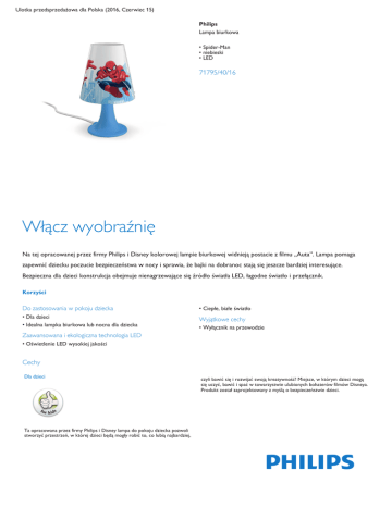 Ulotka przedsprzedażowa dla Polska (2016, Czerwiec 15) Philips Lampa biurkowa • Spider-Man • niebieski • LED 71795/40/16 Włącz wyobraźnię Na tej opracowanej przez firmy Philips i Disney kolorowej lampie biurkowej widnieją postacie z filmu „Auta”. Lampa pomaga zapewnić dziecku poczucie bezpieczeństwa w nocy i sprawia, że bajki na dobranoc stają się jeszcze bardziej interesujące. Bezpieczna dla dzieci konstrukcja obejmuje nienagrzewające się źródło światła LED, łagodne światło i przełącznik. Korzyści Do zastosowania w pokoju dziecka • Ciepłe, białe światło • Dla dzieci • Idealna lampka biurkowa lub nocna dla dziecka • Wyłącznik na przewodzie Wyjątkowe cechy Zaawansowana i ekologiczna technologia LED • Oświetlenie LED wysokiej jakości Cechy Dla dzieci Ta opracowana przez firmy Philips i Disney lampa do pokoju dziecka pozwoli stworzyć przestrzeń, w której dzieci będą mogły robić to, co lubią najbardziej, czyli bawić się i rozwijać swoją kreatywność! Miejsce, w którym dzieci mogą się uczyć, bawić i spać w towarzystwie ulubionych bohaterów filmów Disneya. Produkt został zaprojektowany z myślą o bezpieczeństwie dzieci. Oświetlenie LED wysokiej jakości Lampka nocna dla dziecka Technologia LED zastosowana w tej lampie to wyjątkowe rozwiązanie opracowane przez firmę Philips. Natychmiast się włącza, pozwala na uzyskanie optymalnej wydajności oświetlenia oraz podkreśla i ożywia kolory w pokoju dziecka. Ta opracowana przez firmy Philips i Disney lampa do pokoju dziecka idealnie pasuje na stolik nocny lub na biurko. Rzuca miękkie, ciepłe i białe światło idealne do wieczornych czynności, takich jak czytanie książek lub opowiadanie bajek na dobranoc. Znajdująca się zawsze pod ręką lampa, którą można łatwo włączyć, zapewnia dzieciom większe poczucie bezpieczeństwa w nocy. Ciepłe, białe światło Wyłącznik na przewodzie Światło może mieć różne temperatury barwowe oznaczane za pomocą jednostek zwanych kelwinami (K). Lampy o niskiej wartości kelwinów zapewniają ciepłe, bardziej przytulne światło, natomiast lampy o wysokiej wartości kelwinów dają chłodne, bardziej pobudzające światło. Ta lampa rzuca ciepłe, białe światło zapewniające przytulny nastrój. Dyskretnie umieszczony na przewodzie przycisk umożliwia łatwe włączanie i wyłączanie lampy. Specyfikacje Prosimy pamiętać, że jest to ulotka przedsprzedażowa. Treść ulotki jest zgodna z naszą najlepszą wiedzą w momencie publikacji i w odniesieniu do danego kraju (podane powyżej). Treść ulotki może ulec zmianie bez powiadomienia. Firma Philips nie ponosi odpowiedzialności za treść ulotki. Stylistyka i wykończenie Materiał Kolor syntetyk niebieski Dodatkowe funkcje/akcesoria w zestawie Wyłącznik na przewodzie Diody LED w zestawie TAK TAK 24,4 cm 14 cm 14 cm Dane techniczne Zasilanie sieciowe Liczba źródeł światła Moc źródła światła w zestawie Łączna moc strumienia świetlnego oprawy w lumenach Oprawa z możliwością przyciemniania Klasa ochronności Tak TAK IP20 ochrona przed przedmiotami powyżej 12,5 mm brak ochrony przed wodą III — bezpieczne, bardzo niskie napięcie Serwis Wymiary i waga produktu Wysokość Długość Szerokość LED Wbudowane źródło światła LED Współczynnik IP Przedział 220–240 V 1 2,3 W 220 lm Nie Gwarancja 2 lata Wymiary i waga opakowania Wysokość Długość Szerokość 23,4 cm 14,3 cm 14,3 cm Różne Opracowano z myślą o Styl Typ Pokój dziecka Pełen ekspresji Lampa biurkowa Dane wkrótce ulegną zmianie 2016, Czerwiec 15 Dane wkrótce ulegną zmianie 2016, Czerwiec 15 Version: 1.0.1 EAN: 8718696130384 © 2016 Koninklijke Philips Electronics N.V. Wszelkie prawa zastrzeżone Dane mogą ulec zmianie bez uprzedniego powiadomienia. Znak towarowy jest własnością Koninklijke Philips Electronics N.V. lub odpowiednich podmiotów . www.philips.com