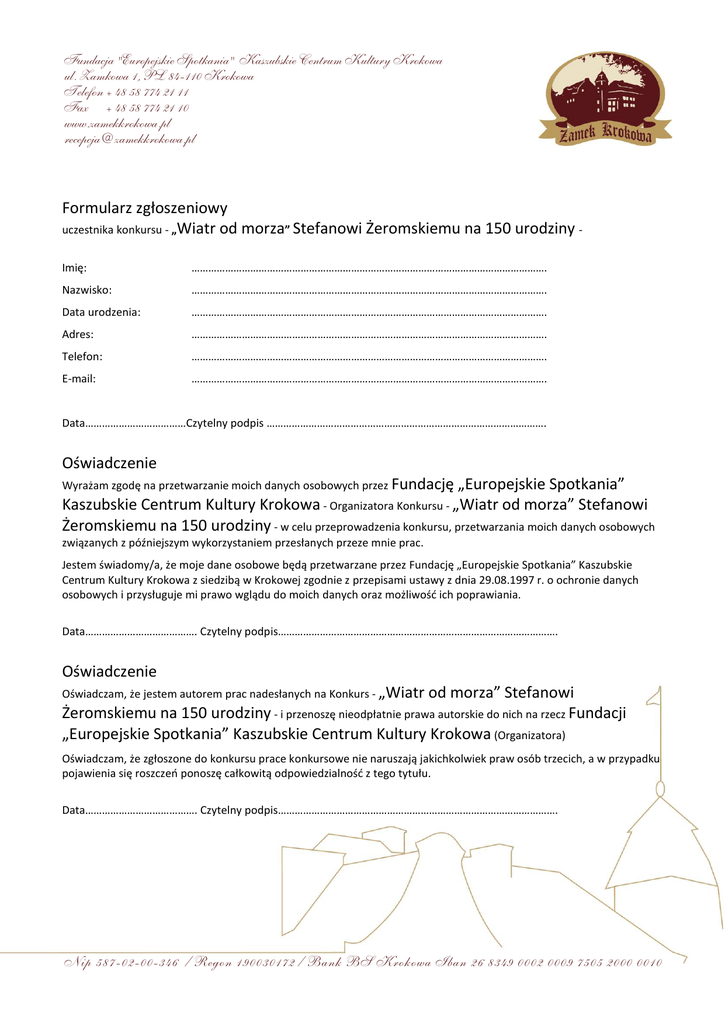 Fundacja "Europejskie Spotkania" Kaszubskie Centrum Kultury Krokowa ul. Zamkowa 1, PL 84-110 Krokowa Telefon + 48 58 774 21 11 Fax + 48 58 774 21 10 www.zamekkrokowa.pl recepcja@ zamekkrokowa.pl Formularz zgłoszeniowy uczestnika konkursu - „Wiatr od morza” Stefanowi Żeromskiemu na 150 urodziny Imię: ………………………………………………………………………………………………………………. Nazwisko: ………………………………………………………………………………………………………………. Data urodzenia: ………………………………………………………………………………………………………………. Adres: ………………………………………………………………………………………………………………. Telefon: ………………………………………………………………………………………………………………. E-mail: ………………………………………………………………………………………………………………. Data………………………………Czytelny podpis ………………………………………………………………………………………. Oświadczenie Wyrażam zgodę na przetwarzanie moich danych osobowych przez Fundację „Europejskie Spotkania” Kaszubskie Centrum Kultury Krokowa ‐ Organizatora Konkursu - „Wiatr od morza” Stefanowi Żeromskiemu na 150 urodziny - w celu przeprowadzenia konkursu, przetwarzania moich danych osobowych związanych z późniejszym wykorzystaniem przesłanych przeze mnie prac. Jestem świadomy/a, że moje dane osobowe będą przetwarzane przez Fundację „Europejskie Spotkania” Kaszubskie Centrum Kultury Krokowa z siedzibą w Krokowej zgodnie z przepisami ustawy z dnia 29.08.1997 r. o ochronie danych osobowych i przysługuje mi prawo wglądu do moich danych oraz możliwość ich poprawiania. Data…………………………………. Czytelny podpis………………………………………………………………………………………. Oświadczenie Oświadczam, że jestem autorem prac nadesłanych na Konkurs - „Wiatr od morza” Stefanowi Żeromskiemu na 150 urodziny - i przenoszę nieodpłatnie prawa autorskie do nich na rzecz Fundacji „Europejskie Spotkania” Kaszubskie Centrum Kultury Krokowa (Organizatora) Oświadczam, że zgłoszone do konkursu prace konkursowe nie naruszają jakichkolwiek praw osób trzecich, a w przypadku pojawienia się roszczeń ponoszę całkowitą odpowiedzialność z tego tytułu. Data…………………………………. Czytelny podpis………………………………………………………………………………………. Nip 587-02-00-346 / Regon 190030172 / Bank BS Krokowa Iban 26 8349 0002 0009 7505 2000 0010