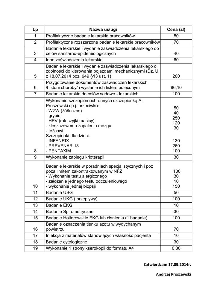 Lp Nazwa usługi Cena (zł) 1 Profilaktyczne badanie lekarskie