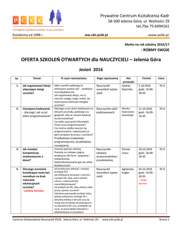 Prywatne Centrum Kształcenia Kadr 58-500 Jelenia Góra, ul. Wolności 29 tel./fax 75 6494161 Kształcimy od 1998 r. ww.cdn.pckk.pl www.pckk.pl Motto na rok szkolny 2016/17 - RÓBMY SWOJE OFERTA SZKOLEŃ OTWARTYCH dla NAUCZYCIELI – Jelenia Góra Jesień 2016 Lp. Temat O czym rozmawiamy Kogo zapraszamy 1. Jak organizować lekcje włączające mózgi uczniów? Nauczycieli wszystkich typów szkół 2. Oswajamy kodowanie - dlaczego i jak uczyć dzieci programowania? Jakie czynniki wpływają na efektywne uczenia się? - podejście neurodydaktyczne Jak organizować lekcje, na co zwracać uwagę, czego unikać, by wykorzystać potencjał mózgów uczniów? Dlaczego uczyć dzieci kodowania na lekcjach przyrody, polskiego czy geografii, albo w ramach edukacji wczesnoszkolnej? Czy tylko nauczyciel informatyki może uczyć programowania? Czy można szybko nauczyć się programowania i wykorzystać je jako narzędzie do pracy z uczniami? Kto prowadzi Jolanta Ratyńska Termin Cena 5.10.2016 godz. 16.0018.30 70 zł Nauczyciele szkół podstawowych Monika KoprowskaSawzdargo 11.10.2016 godz. 16.0018.30 70 zł Przykładowe środowisko programistyczne, przykładowe rozwiązania. 3. Jak rozwijać kompetencje matematyczne u dzieci? Uczenie poprzez zabawę Pomysły na ciekawe zajęcia, propozycje dla form: grupowej i indywidualnej Dobór/dostosowanie gier do celów dydaktycznych Nauczyciele edukacji wczesnoszkolnej i przedszkolnej Dorota Liszcz 18.10.2016 godz. 16.0018.30 70 zł 4. Dlaczego ocenianie kształtujące może być remedium na brak sukcesów edukacyjnych uczniów? - zmiana terminu Jak praktycznie wdrażać i rozwijać strategie OK? Jak efektywnie korzystać z technik i narzędzi OK, żeby uczeń odniósł sukces, a nauczyciel był usatysfakcjonowany? Jak podejść do OK, żeby ułatwić sobie pracę i pomóc uczniom? Szkolenie poprowadzi praktyk, który pokaże połączenie strategii OK z aktualną wiedzą o tym jak uczy się mózg oraz przykłady jak poświęcony na wdrożenie OK czas, przekłada się na to, że praca będzie łatwiejsza i efektywniejsza w przyszłości. Nauczycieli wszystkich typów szkół Agnieszka Engler 26.10.2016 godz. 16.0018.30 - nowy termin 70 zł Centrum Doskonalenia Nauczycieli PCKK, Jelenia Góra, ul. Wolności 29, www.cdn.pckk.pl Strona 1 5. Uzależnienia behawioralne wśród dzieci i młodzieży Uzależnienia od sieci, gier komputerowych, komórek, jedzenia mają wspólny mianownik. Jakie symptomy mogą sygnalizować uzależnienie? Jak bezkonfliktowo rozmawiać o tym z uczniem, a jak z rodzicami? Jak stawiać granice i przestrzegać reguł? Kompetencje nauczyciela, a rola i odpowiedzialność rodzica Nauczycieli wszystkich typów szkół i placówek, Pedagogów szkolnych Bogusława UłanowiczPęcherczyk 26.10.2016 godz.16.0018.30 70 zł 6. Dobry start – praktyczne ćwiczenia usprawniające funkcje percepcyjnomotoryczne u dzieci Ćwiczenia usprawniające funkcje percepcyjno-motoryczne, które możne realizować: - w ramach przygotowania dzieci do podjęcia nauki szkolnej, w okresie poprzedzającym naukę czytania i pisania - dla uczniów klas pierwszych, podczas lekcji, a także w formie zajęć śródlekcyjnych Rodzaje ćwiczeń – ćwiczenia ruchowe, ruchowo-słuchowe, ruchowo-słuchowo-wzrokowe oraz harmonizujące wszystkie funkcje psychomotoryczne Praktyczne zapoznanie z rodzajami ćwiczeń i wzorami graficznymi – kreślenie wzorów literopodobnych i grafomotorycznych Zabawy i ćwiczenia muzycznoruchowe Nauczycieli szkół podstawowych i przedszkoli Bożena Piotrowska 8.11.2016 godz. 16.00 – 19.00 80 zł 7. Oswajamy kodowanie - dlaczego i jak uczyć dzieci programowania? Dlaczego uczyć dzieci kodowania na lekcjach przyrody, polskiego czy geografii, albo w ramach edukacji wczesnoszkolnej? Czy tylko nauczyciel informatyki może uczyć programowania? Czy można szybko nauczyć się programowania i wykorzystać je jako narzędzie do pracy z uczniami? Nauczyciele szkół podstawowych Monika KoprowskaSawzdargo 9.11..2016 godz.16.0018.30 70 zł 8. Dziecko z problemem logopedycznym Nauczycieli przedszkoli, opiekunki dziecięce, rodziców Jolanta Krudys 15.11.2016 godz. 16.0018.30 70 zł 9. Praca z dzieckiem z Zespołem Aspergera i Autyzmem w szkole masowej i przedszkolu Dlaczego warto korygować wady wymowy u dzieci? Jakie ćwiczenia należy wykonywać by pomóc dziecku z problemem logopedycznym? Cele szkolenia: nabycie przez Uczestników szkolenia aktualnej wiedzy na temat autyzmu i zespołu Aspergera u dzieci, zrozumienie trudnych zachowań uczniów, poznanie techniki pracy z nimi, a także praktyczne wskazówki, nabycie umiejętności posługiwania się specjalnymi metodami i formami pracy podczas Pedagogów, psychologów, nauczycieli edukacji wczesnoszkolnej, nauczycieli przedmiotowców, wychowawców i tych wszystkich którzy pracują lub mają zamiar pracować z dziećmi z zespołem Ewelina Pieprzak 16.11.2016 godz. 16.0018.30 70 zł Centrum Doskonalenia Nauczycieli PCKK, Jelenia Góra, ul. Wolności 29, www.cdn.pckk.pl Strona 2 10. Rytmika i tańce integracyjne jako metody rozwijania twórczej aktywności ruchowej dzieci w wieku przedszkolnym i wczesnoszkolnym 11. Zaburzenia łaknienia I własnego wizerunku u nastolatków 12. Elementy muzykoterapii w pracy z dziećmi nadpobudliwymi ruchowo 13. Jak skutecznie i efektywnie pracować z dzieckiem z nadpobudliwością psychoruchową, czyli sposoby na dziecko z ADHD w szkole i przedszkolu - zmiana terminu 14. Przemoc w sieci prowadzenia zajęć z dziećmi z ZA i Autyzmem otworzenie się na nowe prądy edukacyjne, dostosowane do ich potrzeb Rytmika i jej cele – metoda J. Dalcroze’a Gra na instrumentach perkusyjnych, proste aranżacje rytmiczne utworów Improwizacje muzyczno-ruchowe, układy ruchowe do piosenek (wykorzystanie i tworzenie własnych układów ruchowych) Zabawy rozwijające aktywność ruchową Proste ruchy taktowania Rozwój i usprawnianie zdolności intelektualnych (w tym koncentracji uwagi, 