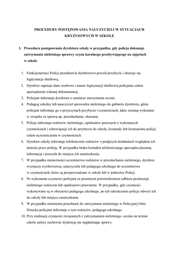 PROCEDURY POSTĘPOWANIA NAUCZYCIELI W SYTUACJACH KRYZYSOWYCH W SZKOLE I. Procedura postępowania dyrektora szkoły w przypadku, gdy policja dokonuje zatrzymania nieletniego sprawcy czynu karalnego przebywającego na zajęciach w szkole. 1. Funkcjonariusz Policji przedstawia dyrektorowi powód przybycia i okazuje się legitymacja służbową. 2. Dyrektor zapisuje dane osobowe i numer legitymacji służbowej policjanta celem sporządzenia własnej dokumentacji. 3. Policjant informuje dyrektora o zamiarze zatrzymania ucznia. 4. Pedagog szkolny lub nauczyciel sprowadza nieletniego do gabinetu dyrektora, gdzie policjant informuje go o przyczynach przybycia i czynnościach, jakie zostaną wykonane w związku ze sprawą np. przesłuchanie, okazanie. 5. Policja informuje rodziców nieletniego, opiekunów prawnych o wykonanych czynnościach i zobowiązuje ich do przybycia do szkoły, komendy lub komisariatu policji, celem uczestniczenia w czynnościach. 6. Dyrektor szkoły informuje telefonicznie rodziców o podjętych działaniach względem ich dziecka przez policję. W przypadku braku kontaktu telefonicznego sporządza pisemną informację i przesyła do miejsca ich zamieszkania. 7. W przypadku niemożności uczestnictwa rodziców w przesłuchaniu nieletniego, dyrektor wyznacza wychowawcę, nauczyciela lub pedagoga szkolnego do uczestnictwa w czynnościach, które są przeprowadzane w szkole lub w jednostce Policji. 8. Po wykonaniu czynności policjant za pisemnym potwierdzeniem odbioru przekazuje nieletniego rodzicom lub opiekunowi prawnemu. W przypadku, gdy czynności wykonywane są w obecności pedagoga szkolnego, po ich zakończeniu policja odwozi ich do szkoły lub miejsca zamieszkania. 9. W przypadku zaistnienia przesłanek do zatrzymania nieletniego w Policyjnej Izbie Dziecka policjant informuje o tym rodziców, pedagoga szkolnego. 10. Przy realizacji czynności związanych z zatrzymaniem nieletniego- ucznia na terenie szkoły należy zachować dyskrecję nie nagłaśniając sprawy. II. Procedura postępowania nauczyciela w przypadku uzyskania informacji, że uczeń który, nie ukończył 18 lat, używa alkoholu lub innych środków w celu wprowadzenia się w stan odurzenia, uprawia nierząd, bądź przejawia inne zachowania świadczące o demoralizacji 1 1. Nauczyciel przekazuje uzyskaną informację wychowawcy klasy. 2. Wychowawca informuje o fakcie pedagoga/psychologa szkolnego i dyrektora szkoły. 3. Wychowawca wzywa do szkoły rodziców (prawnych opiekunów) ucznia i przekazuje im uzyskaną informację. Przeprowadza rozmowę z rodzicami oraz uczniem, w ich obecności. W przypadku potwierdzenia informacji, zobowiązuje ucznia do zaniechania negatywnego postępowania, rodziców zaś bezwzględnie do szczególnego nadzoru nad dzieckiem. W toku interwencji profilaktycznej może zaproponować rodzicom skierowanie dziecka do specjalistycznej placówki i udział dziecka w programie terapeutycznym. 4. Jeżeli rodzice odmawiają współpracy lub nie stawiają się do szkoły, a nadal z wiarygodnych źródeł napływają informacje o przejawach demoralizacji ich dziecka, dyrektor szkoły pisemnie powiadamia o zaistniałej sytuacji sąd rodzinny lub policję (specjalistę ds. nieletnich). 5. Podobnie, w sytuacji gdy, szkoła wykorzysta wszystkie dostępne jej środki oddziaływań wychowawczych, (rozmowa z rodzicami, ostrzeżenie ucznia, spotkania z pedagogiem, psychologiem, itp.), a ich zastosowanie nie przynosi oczekiwanych rezultatów, dyrektor szkoły powiadamia sąd rodzinny lub policję. Dalszy tok postępowania leży w kompetencji tych instytucji. 6. Jeżeli zachowania świadczące o demoralizacji przejawia uczeń który ukończył 18 lat, a nie jest to udział w działalności grup przestępczych czy popełnienie przestępstwa, to postępowanie nauczyciela powinno być określone przez wewnętrzny regulamin szkoły. 7. W przypadku uzyskania informacji o popełnieniu przez ucznia, który ukończył 17 lat, przestępstwa ściganego z urzędu lub jego udziału w działalności grup przestępczych, zgodnie z art. 304 § 2 kodeksu postępowania karnego, dyrektor szkoły jako przedstawiciel instytucji jest obowiązany niezwłocznie zawiadomić o tym prokuratora lub policję. 1 Naruszanie zasad współżycia społecznego, popełnienie czynu zabronionego, systematyczne uchylanie się od obowiązku szkolnego lub obowiązku nauki, włóczęgostwo, udział w działalności grup przestępczych – art.4 §1 ustawy o postępowaniu w sprawach nieletnich III. Procedura postępowania w przypadku, gdy nauczyciel podejrzewa, że na terenie szkoły znajduje się uczeń będący pod wpływem alkoholu lub narkotyków 1. Działania uprzedzające: a) Sporządzenie listy symptomów używania, nadużywania środków odurzających (pedagog szkolny) b) Zaproszenie specjalisty w tej dziedzinie, omówienie skutecznych metod reagowania, c) Korzystanie z licznych programów edukacyjno-wychowawczych, profilaktycznych. d) Opracowanie listy teleadresowej lokalnych organizacji, placówek zajmujących się udzielaniem pomocy młodzieży używającej środków odurzających, rodzinom, bliskim. e) Dokonywanie badań przesiewowych pod kątem używania środków odurzających. 2. Działania interwencyjne a) Powiadamia o swoich przypuszczeniach wychowawcę klasy. b) Odizolowuje ucznia od reszty klasy, ale ze względów bezpieczeństwa nie pozostawia go samego; stwarza warunki, w których nie będzie zagrożone jego życie ani zdrowie. c) Wzywa lekarza w celu stwierdzenia stanu trzeźwości lub odurzenia, ewentualnie udzielenia pomocy medycznej. d) Zawiadamia o tym fakcie dyrektora szkoły oraz rodziców/opiekunów, których zobowiązuje do niezwłocznego odebrania ucznia ze szkoły. Gdy rodzice/opiekunowie odmówią odebrania dziecka, o pozostaniu ucznia w szkole, czy przewiezieniu do placówki służby zdrowia, albo przekazaniu go do dyspozycji funkcjonariuszom policji - decyduje lekarz, po ustaleniu aktualnego stanu zdrowia
