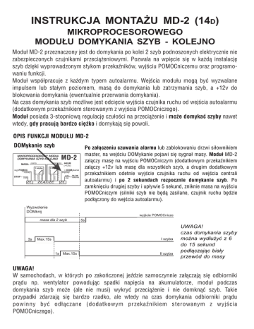 INSTRUKCJA MONTA¯U MD-2 (14D) MIKROPROCESOROWEGO MODU£U DOMYKANIA SZYB - KOLEJNO Modu³ MD-2 przeznaczony jest do domykania po kolei 2 szyb podnoszonych elektrycznie nie zabezpieczonych czujnikami przeci¹¿eniowymi. Pozwala na wpiêcie siê w ka¿d¹ instalacjê szyb dziêki wyprowadzonym stykom przekaŸników, wyjœciu POMOCniczemu oraz programowaniu funkcji. Modu³ wspó³pracuje z ka¿dym typem autoalarmu. Wejœcia modu³u mog¹ byæ wyzwalane impulsem lub sta³ym poziomem, mas¹ do domykania lub zatrzymania szyb, a +12v do blokowania domykania (ewentualnie przerwania domykania). Na czas domykania szyb mo¿liwe jest odciêcie wyjœcia czujnika ruchu od wejœcia autoalarmu (dodatkowym przekaŸnikiem sterowanym z wyjœcia POMOCniczego). Modu³ posiada 3-stopniow¹ regulacjê czu³oœci na przeci¹¿enie i mo¿e domykaæ szyby nawet wtedy, gdy pracuj¹ bardzo ciê¿ko i domykaj¹ siê powoli. OPIS FUNKCJI MODU£U MD-2 DOMykanie szyb MIKROPROCESOROWY MODU£ DOMYKANIA SZYB KOLEJNO MASA czarny MD-2 czerwony I szyba AKUM (+12V) II szyba DOMykanie wyj.POMOC br¹zowy Z£¥CZE zielony fioletowy pomarañ. niebieski pomarañ. Z£. fioletowy ró¿owy STOP - bia³y Po za³¹czeniu czuwania alarmu lub zablokowaniu drzwi si³ownikiem master, na wejœciu DOMykanie pojawi siê sygna³ masy. Modu³ MD-2 za³¹czy masê na wyjœciu POMOCniczym (dodatkowym przekaŸnikiem za³¹czy +12v lub masê dla wszystkich szyb, a drugim dodatkowym przekaŸnikiem odetnie wyjœcie czujnika ruchu od wejœcia centrali autoalarmu) i po 2 sekundach rozpocznie domykanie szyb. Po zamkniêciu drugiej szyby i up³ywie 5 sekund, zniknie masa na wyjœciu POMOCniczym (silniki szyb nie bêd¹ zasilane, czujnik ruchu bêdzie pod³¹czony do wejœcia autoalarmu). ¿ó³toziel. + BLOK owanie Z£. Wyzwolenie DOMknij wyjœcie POMOCnicze masa dla 2 szyb 3s 5s I szyba Max.15s 1s Max.15s II szyba UWAGA! czas domykania szyby mo¿na wyd³u¿yæ z 6 do 15 sekund pod³¹czaj¹c bia³y przewód do masy UWAGA! W samochodach, w których po zakoñczonej jeŸdzie samoczynnie za³¹czaj¹ siê odbiorniki pr¹du np. wentylator powoduj¹c spadki napiêcia na akumulatorze, modu³ podczas domykania szyb mo¿e (ale nie musi) wykryæ przeci¹¿enie i nie domkn¹æ szyb. Takie przypadki zdarzaj¹ siê bardzo rzadko, ale wtedy na czas domykania odbiorniki pr¹du powinny byæ od³¹czane (dodatkowym przekaŸnikiem sterowanym z wyjœcia POMOCniczego). STOP (zatrzymanie szyb) MD-2 MIKROPROCESOROWY MODU£ DOMYKANIA SZYB KOLEJNO czarny MASA AKUM (+12V) czerwony I szyba II szyba DOMykanie wyj.POMOC br¹zowy zielony ¿ó³toziel. fioletowy pomarañ. niebieski Z£. fioletowy pomarañ. ró¿owy STOP - bia³y + BLOK owanie Z£. Z£¥CZE Zatrzymanie szyb (przerwanie domykania) nast¹pi, gdy na wejœciu STOP pojawi siê sygna³ masy - po wy³¹czeniu czuwania alarmu. Zakoñczenie domykania szyb nast¹pi po ponownym wywo³aniu DOMknij. Jeœli wejœcie STOP (przewód bia³y) bêdzie pod³¹czone na sta³e - lub przez styki si³ownika master - do masy, to funkcja STOP nie bêdzie dzia³aæ, natomiast wyd³u¿y siê czas domykania szyb. BLOKowanie domykania lub przerwanie domykania Funkcja przydatna, gdy modu³ raz ma domykaæ szyby a innym MIKROPROCESOROWY MODU£ razem nie. Jeœli ma nie domykaæ trzeba na chwilê podaæ +12v DOMYKANIA SZYB KOLEJNO MD-2 MASA na wejœcie BLOKowanie i nastêpnie - w ci¹gu 15 sekund wyj.POMOC DOMykanie wysterowaæ wejœcie DOMykanie (szyby pozostan¹ niezamkniêSTOP + te). Z£. Z£¥CZE Z£. W przypadku pod³¹czenia wejœcia BLOKowanie do +12v po stacyjce, po przekrêceniu kluczyka w stacyjce (np. w czasie jazdy) modu³ nie bêdzie domyka³ szyb, pomimo wysterowania wejœcia DOMknij. czarny czerwony I szyba br¹zowy zielony ¿ó³toziel. fioletowy pomarañ. niebieski fioletowy pomarañ. ró¿owy bia³y AKUM (+12V) II szyba BLOK owanie PRZYK£ADY POD£¥CZENIA MODU£U Z WYKORZYSTANIEM WSZYSTKICH FUNKCJI Przyk³ad I Domykanie 2 szyb po kolei - sterowanie silnikiem na jednym przewodzie (+12v) CZUJNIK +12V wyjœcie czerwony M +U CENTRALA AUTOALARMU STOP masa przy otwieraniu +12V M A ST +12V +U DOMykanie masa przy zamykaniu ER M max. 20A bezp. +12V akum. br¹zowy y ow cz rañ ma po max. 20A bezp. ¿ó³to-zielony pomarañczowy BLOK owanie +12V np. po stacyjce M STEROWNIK CENT. ZAMKA. np. ST-31 Silnik mechanizmu szyby +U - Przewód do silnika na którym przy zamykaniu szyby pojawia siê +12V Przyk³ad II Domykanie 2 szyb po kolei - sterowanie silnikiem na dwóch przewodach (sterowanie mas¹ kolejno, a +12v jednoczeœnie dla dwóch silników szyb) POMOC PRZEKANIK DODATKOWY do za³¹czania +12v 20A od³¹czanie czujnika ruchu pomar. br¹zowy czarny pomar. +12V akum. czerwony BLOK owanie ¿ó³to-zielony DOMykanie masa przy zamykaniu CENTRALA AUTOALARMU czerwony -U M -U STEROWNIK CENT. ZAMKA. np. ST-31 M A ST ER M max. 20A bezp. STOP masa przy otwieraniu max. 20A bezp. +12V np. po stacyjce CZUJNIK wyjœcie M Silnik mechanizmu szyby -U - Przewód do silnika na którym przy zamykaniu szyby pojawia siê masa BARDZO WA¯NE !!! Przed sprawdzeniem domykania warto sprawdziæ stan na³adowania akumulatora (nowe samochody sprzedawane w salonach najczêœciej maj¹ roz³adowane akumulatory) i ewentualnie do³adowaæ. W codziennej eksploatacji nie ma to ju¿ znaczenia. Modu³ MD-2 mo¿na zastosowaæ w ka¿dym samochodzie dziêki regulacji czu³oœci na przeci¹¿enie. Przy monta¿u modu³u w nowych samochodach pêtelka czerwona pozostaje zwarta (czu³oœæ standardowa np. dla Renault Kangoo). W kilkuletnich samochodach i nie do³adowanych akumulatorach lub przy klinuj¹cych siê szybach konieczne jest zmniejszenie czu³oœci przecina siê pêtelkê czerwon¹ i pêtelkê szar¹ (wewn¹trz modu³u - trzeba otworzyæ modu³). Przy dobrym akumulatorze, gdy modu³ MD-2 nie reaguje na spadek napiêcia, mo¿na zmieniæ próg zadzia³ania przeci¹¿enia (zwiêkszyæ czu³oœæ) przecinaj¹c czerwon¹ pêtelkê. pêtelka szara pêtelka czerwona Z£. Z£¥CZE Z£. 