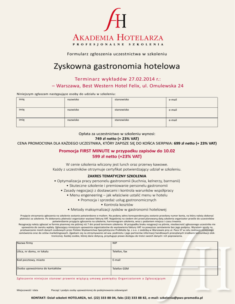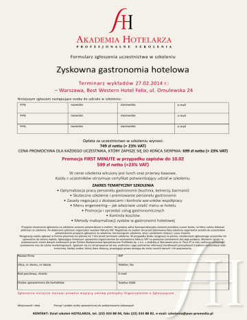 Formularz zgłoszenia uczestnictwa w szkoleniu Zyskowna gastronomia hotelowa Terminarz wykładów 27.02.2014 r.: – Warszawa, Best Western Hotel Felix, ul. Omulewska 24 Niniejszym zgłaszam następujące osoby do udziału w szkoleniu: imię nazwisko stanowisko e-mail imię nazwisko stanowisko e-mail imię nazwisko stanowisko e-mail Opłata za uczestnictwo w szkoleniu wynosi: 749 zł netto (+ 23% VAT) CENA PROMOCYJNA DLA KAŻDEGO UCZESTNIKA, KTÓRY ZAPISZE SIĘ DO KOŃCA SIERPNIA: 699 zł netto (+ 23% VAT) Promocja FIRST MINUTE w przypadku zapisów do 10.02 599 zł netto (+23% VAT) W cenie szkolenia wliczony jest lunch oraz przerwy kawowe. Każdy z uczestników otrzymuje certyfikat potwierdzający udział w szkoleniu. ZAKRES TEMATYCZNY SZKOLENIA • Optymalizacja pracy personelu gastronomii (kuchnia, kelnerzy, barmanii) • Skuteczne szkolenie i premiowanie personelu gastronomii • Zasady negocjacji z dostawcami i kontrola warunków współpracy • Menu engeneering – jak właściwie ustalić menu w hotelu • Promocja i sprzedaż usług gastronomicznych • Kontrola kosztów • Metody maksymalizacji zysków w gastronomii hotelowej Przyjęcie otrzymania zgłoszenia na szkolenie zostanie potwierdzone e-mailem. Na podany adres korespondencyjny zostanie przesłany numer konta, na który należy dokonać płatności za szkolenie. Po dokonaniu płatności organizator wystawi fakturę VAT. Najpóźniej na siedem dni przed planowaną datą szkolenia organizator prześle do uczestników potwierdzenie przyjęcia zgłoszenia na szkolenie, harmonogram szkolenia, wraz z podaniem miejsca i czasu trwania. Rezygnację należy zgłaszać w formie pisemnej nie później niż 7 dni przed terminem szkolenia. W przypadku braku rezygnacji na piśmie, nieobecność zgłoszonego uczestnika nie upoważnia do zwrotu wpłaty. Zgłaszający niniejszym upoważnia organizatorów do wystawienia faktury VAT na powyższe zamówienie bez jego podpisu. Wyrażam zgodę na przetwarzanie moich danych osobowych przez Polskie Wydawnictwa Specjalistyczne ProMedia Sp. z o.o. z siedzibą w Warszawie przy ul. Paca 37 w celu realizacji niniejszego zamówienia oraz do celów marketingowych. Zgadzam się na otrzymywanie od ww. podmiotu i jego partnerów informacji handlowych przesyłanych środkami komunikacji elektronicznej. Każdej osobie, której dane dotyczą, przysługuje prawo dostępu do treści swoich danych i ich poprawiania. Nazwa firmy NIP Ulica, nr domu, nr lokalu Telefon, fax Kod pocztowy, miasto E-mail Osoba upoważniona do kantaktów Telefon GSM Zgłoszenie niniejsze sta n ow i p raw n i e w i ą ż ą c ą u m owę p o m i ę d zy O rga n i zato re m a Z g ła sza j ą c y m Miejscowość i data Pieczęć i podpis osoby upoważnionej do podejmowania zobowiązań KONTAKT: Dział szkoleń HOTELARZA, tel. (22) 333 88 04, faks (22) 333 88 82, e-mail: [email protected]