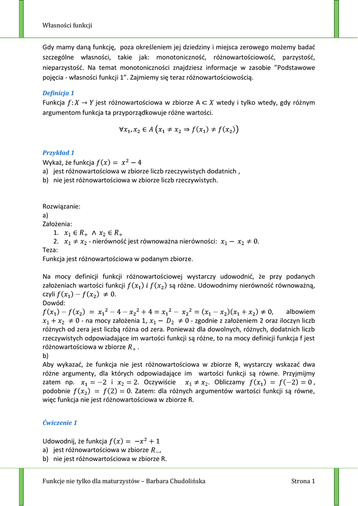 Własności funkcji Gdy mamy daną funkcję, poza określeniem jej dziedziny i miejsca zerowego możemy badad szczególne własności, takie jak: monotonicznośd, różnowartościowośd, parzystośd, nieparzystośd. Na temat monotoniczności znajdziesz informacje w zasobie ”Podstawowe pojęcia - własności funkcji 1”. Zajmiemy się teraz różnowartościowością. Definicja 1 Funkcja jest różnowartościowa w zbiorze A wtedy i tylko wtedy, gdy różnym argumentom funkcja ta przyporządkowuje różne wartości. Przykład 1 Wykaż, że funkcja a) jest różnowartościowa w zbiorze liczb rzeczywistych dodatnich , b) nie jest różnowartościowa w zbiorze liczb rzeczywistych. Rozwiązanie: a) Założenia: 1. 2. - nierównośd jest równoważna nierówności: Teza: Funkcja jest różnowartościowa w podanym zbiorze. . Na mocy definicji funkcji różnowartościowej wystarczy udowodnid, że przy podanych założeniach wartości funkcji są różne. Udowodnimy nierównośd równoważną, czyli . Dowód: albowiem - na mocy założenia 1, - zgodnie z założeniem 2 oraz iloczyn liczb różnych od zera jest liczbą różna od zera. Ponieważ dla dowolnych, różnych, dodatnich liczb rzeczywistych odpowiadające im wartości funkcji są różne, to na mocy definicji funkcja f jest różnowartościowa w zbiorze . b) Aby wykazad, że funkcja nie jest różnowartościowa w zbiorze R, wystarczy wskazad dwa różne argumenty, dla których odpowiadające im wartości funkcji są równe. Przyjmijmy zatem np. i . Oczywiście . Obliczamy , podobnie . Zatem: dla różnych argumentów wartości funkcji są równe, więc funkcja nie jest różnowartościowa w zbiorze R. Ćwiczenie 1 Udowodnij, że funkcja a) jest różnowartościowa w zbiorze , b) nie jest różnowartościowa w zbiorze R. Funkcje nie tylko dla maturzystów – Barbara Chudolińska Strona 1 Własności funkcji Mając wykresy, możemy łatwo określid, która z funkcji jest różnowartościowa. Poniższe wykresy stanowią ilustrację problemu. W przypadku funkcji różnowartościowej dowolna prosta o równaniu przecina wykres co najwyżej w jednym punkcie (patrz rys.1.1). Jeśli funkcja nie jest różnowartościowa, istnieją proste równoległe do osi x (przynajmniej jedna), które przecinają wykres funkcji w więcej niż jednym punkcie (rys.1.2). Rys.1.1 Wykres funkcji różnowartościowej Rys.1.2 Wykres funkcji, która nie jest różnowartościowa Z różnowartościowością związane jest istnienie funkcji odwrotnej do danej. Definicja 2 Jeśli funkcja element jest różnowartościowa i odwzorowuje zbiór X na zbiór Y, to funkcję określoną następująco: dla dowolnego wartością taki, że , nazywamy funkcją odwrotną do funkcji f. jest jedyny Funkcję, która ma funkcję odwrotną, nazywamy odwracalną. Funkcją odwrotną do funkcji jest funkcja . Aby otrzymad wzór funkcji odwrotnej do funkcji należy: wyznaczyd x w zależności od y, zamienid zmienne – aby można było narysowad wykresy w tym samym układzie współrzędnych. Przykład 2 Wyznacz funkcję odwrotną do funkcji Przekształcamy wzór i narysuj obydwa wykresy. ; Funkcje nie tylko dla maturzystów – Barbara Chudolińska Strona 2 Własności funkcji otrzymujemy kolejno: , , teraz zamieniamy zmienne, otrzymujemy wzór funkcji odwrotnej : . Poniżej znajduje się ilustracja przykładu: Rys.1.3 Wykresy funkcji i To, co łatwo zauważyd na powyższym rysunku, że wykresy funkcji: danej i odwrotnej są symetryczne względem prostej y =x zachodzi nie tylko dla przypadku wyżej omówionego, ale dla dowolnej pary funkcji wzajemnie odwrotnych. Rys.1.4 Jeszcze jedna para wykresów funkcji wzajemnie odwrotnych. Funkcje nie tylko dla maturzystów – Barbara Chudolińska Strona 3 Własności funkcji Ćwiczenie 2 Zbadaj, czy funkcja jest różnowartościowa. Jeśli tak, to wyznacz funkcję do niej odwrotną. Kolejne własności, które omówimy, to parzystośd i nieparzystośd funkcji. Definicja 3 Funkcja jest parzysta w zbiorze wtedy i tylko wtedy gdy dla każdej liczby należącej do dziedziny funkcji, liczba przeciwna również należy do dziedziny tej funkcji oraz wartości funkcji dla danego argumentu x i dla argumentu przeciwnego są równe. Symbolicznie możemy zapisać: Funkcja f jest parzysta w zbiorze Rys.1.5 Wykres funkcji parzystej Z definicji wynika, że wykres dowolnej funkcji parzystej jest symetryczny względem osi y. Zatem, aby sporządzid wykres funkcji parzystej, wystarczy narysowad wykres dla argumentów nieujemnych a następnie przekształcid go przez symetrię względem osi y. Przykład 3 Wykaż, że a) funkcja b) funkcja c) funkcja jest parzysta w zbiorze liczb rzeczywistych nie jest parzysta w — nie jest parzysta w zbiorze — Funkcje nie tylko dla maturzystów – Barbara Chudolińska , . Strona 4 Własności funkcji Rozwiązanie: a) Dziedziną funkcji jest zbiór liczb rzeczywistych , zatem dla dowolnego argumentu argument przeciwny . Wystarczy więc sprawdzid, czy . Obliczamy więc: . Zatem na mocy definicji funkcja jest parzysta w zbiorze . b) Dziedziną funkcji jest zbiór — , zatem istnieje element należący do dziedziny, który nie ma w tej dziedzinie elementu przeciwnego. Jest nim np. argument – 3 lub 4. Wobec tego funkcja nie jest parzysta w zbiorze — , c) Dziedzina jest zbiorem symetrycznym względem zera, zatem dowolny argument posiada w niej element do siebie przeciwny. Sprawdzamy, czy . Otrzymujemy: , . Zatem funkcja nie jest parzysta, ponieważ nie jest spełniony jeden z warunków definicji. Ćwiczenie 3 Wykaż, ze funkcja: a) funkcja jest parzysta w zbiorze liczb rzeczywistych nie jest parzysta w — b) funkcja c) funkcja nie jest parzysta w zbiorze — , . Definicja 4 Funkcję nazywamy nieparzystą w zbiorze wtedy i tylko wtedy gdy dla każdej liczby należącej do dziedziny funkcji, liczba przeciwna również należy do dziedziny tej funkcji oraz wartości funkcji dla danego argumentu x i dla argumentu przeciwnego są liczbami