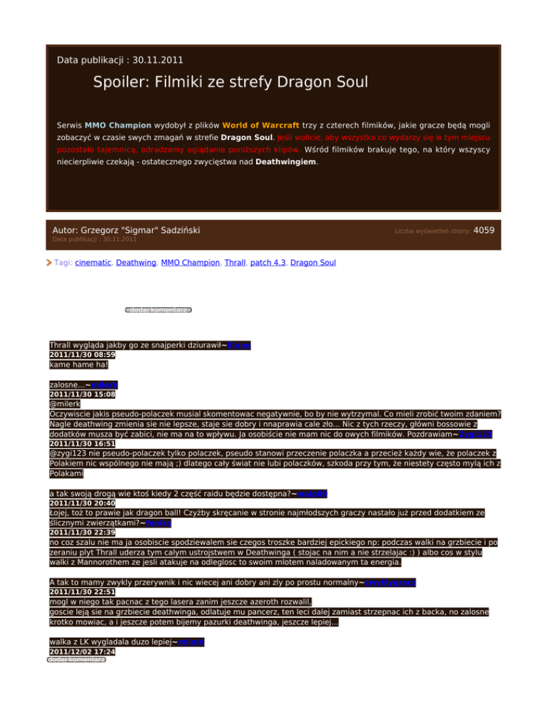 Data publikacji : 30.11.2011 Spoiler: Filmiki ze strefy Dragon Soul Serwis MMO Champion wydobył z plików World of Warcraft trzy z czterech filmików, jakie gracze będą mogli zobaczyć w czasie swych zmagań w strefie Dragon Soul. Jeśli wolicie, aby wszystko co wydarzy się w tym miejscu pozostało tajemnicą, odradzamy oglądanie poniższych klipów. Wśród filmików brakuje tego, na który wszyscy niecierpliwie czekają - ostatecznego zwycięstwa nad Deathwingiem. Autor: Grzegorz "Sigmar" Sadziński Liczba wyświetleń strony: 4059 Data publikacji : 30.11.2011 Tagi: cinematic, Deathwing, MMO Champion, Thrall, patch 4.3, Dragon Soul Komentarz (7) dodaj komentarz Thrall wygląda jakby go ze snajperki dziurawił~Elune 2011/11/30 08:59 kame hame ha! zalosne...~milerk 2011/11/30 15:08 @milerk Oczywiscie jakis pseudo-polaczek musial skomentowac negatywnie, bo by nie wytrzymal. Co mieli zrobić twoim zdaniem? Nagle deathwing zmienia sie nie lepsze, staje sie dobry i nnaprawia cale zło... Nic z tych rzeczy, główni bossowie z dodatków musza być zabici, nie ma na to wpływu. Ja osobiście nie mam nic do owych filmików. Pozdrawiam~Zygi123 2011/11/30 16:51 @zygi123 nie pseudo-polaczek tylko polaczek, pseudo stanowi przeczenie polaczka a przecież każdy wie, że polaczek z Polakiem nic wspólnego nie mają ;) dlatego cały świat nie lubi polaczków, szkoda przy tym, że niestety często mylą ich z Polakami a tak swoją drogą wie ktoś kiedy 2 część raidu będzie dostępna?~walp00 2011/11/30 20:40 Łojej, toż to prawie jak dragon ball! Czyżby skręcanie w stronie najmłodszych graczy nastało już przed dodatkiem ze ślicznymi zwierzątkami?~feniks 2011/11/30 22:39 no coz szalu nie ma ja osobiscie spodziewalem sie czegos troszke bardziej epickiego np: podczas walki na grzbiecie i po zeraniu plyt Thrall uderza tym calym ustrojstwem w Deathwinga ( stojac na nim a nie strzelajac :) ) albo cos w stylu walki z Mannorothem ze jesli atakuje na odleglosc to swoim mlotem naladowanym ta energia. A tak to mamy zwykly przerywnik i nic wiecej ani dobry ani zly po prostu normalny~zwyklygracz 2011/11/30 22:51 mogl w niego tak pacnac z tego lasera zanim jeszcze azeroth rozwalil, goscie leją sie na grzbiecie deathwinga, odlatuje mu pancerz, ten leci dalej zamiast strzepnac ich z backa, no zalosne krotko mowiac, a i jeszcze potem bijemy pazurki deathwinga, jeszcze lepiej... walka z LK wygladala duzo lepiej~milerk 2011/12/02 17:24 dodaj komentarz Pozostałe nowości Zapowiedź zmian w klasach - Mnich Legion wkroczył w fazę alfa testów w czasie których dostępna jest póki co jedynie lokacja startowa łowców demonów, a my przyglądamy się temu, jakich zmian doczeka się klasa, która stosunkowo niedawno pojawiła się w World of Warcraft. Oto co na najnowszy dodatek Blizzard przygotował dla mnichów.Data publikacji: 24.11.20150 Zapowiedź zmian w klasach - Wojownik Po krótkiej przerwie wracamy z tłumaczeniami blogów poświęconych zmianom, jakie pojawią się w klasach w nadchodzącym dodatku do World of Warcraft. Oto czego powinni spodziewać się wojownicy z Azeroth w LegionieData publikacji: 23.11.20150 Zapowiedź zmian w klasach - Szaman Kolejna zapowiedzieć, która pojawiła się jakiś czas temu na łamach oficjalnej strony społecznościowej dotyczy szamana. Największe zmiany w przypadku tej klasy dotknęły totemy oraz system zasobów specjalizacji Elemental oraz EnhancementData publikacji: 16.11.20150 11 urodziny World of Warcraft World of Warcraft obchodzi już swoje 11 urodziny. Z tej okazji Blizzard przygotował kilka zabawek, które powinny wszystkim przypomnieć sam początek przygody w świecie Azeroth - w rolach głównych Edwin VanCleef, Hogger, murlok oraz Windfury (w wersji nadmuchiwanej).Data publikacji: 16.11.20150 Zapowiedź zmian w klasach - Rycerz śmierci Kolejna zapowiedź opublikowana na łamach oficjalnej strony społecznościowej World of Warcraft poświęcona jest klasie rycerzy śmierci. Poniżej znajdziecie informacje między innymi o ujednoliceniu wszystkich run oraz nowej umiejętności specjalizacji Blood, która została zainspirowana Lordem Marrowgarem z Icecrown Citadel.Data publikacji: 15.11.20150 Wszystkie nowości