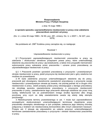 Rozporządzenie Ministra Pracy i Polityki Socjalnej z dnia 15 maja 1996 r. w sprawie sposobu usprawiedliwiania nieobecności w pracy oraz udzielania pracownikom zwolnień od pracy (Dz. U. z dnia 30 maja 1996 r. Nr 60, poz. 281, zmiany: Dz. U. z 2007 r., Nr 227, poz. 1678) Na podstawie art. 2982 Kodeksu pracy zarządza się, co następuje: Rozdział 1 Usprawiedliwianie nieobecności w pracy § 1. Przyczynami usprawiedliwiającymi nieobecność pracownika w pracy są zdarzenia i okoliczności określone przepisami prawa pracy, które uniemożliwiają stawienie się pracownika do pracy i jej świadczenie, a także inne przypadki niemożności wykonywania pracy wskazane przez pracownika i uznane przez pracodawcę za usprawiedliwiające nieobecność w pracy. § 2. 1. Pracownik powinien uprzedzić pracodawcę o przyczynie i przewidywanym okresie nieobecności w pracy, jeżeli przyczyna tej nieobecności jest z góry wiadoma lub możliwa do przewidzenia. 2. W razie zaistnienia przyczyn uniemożliwiających stawienie się do pracy, pracownik jest obowiązany niezwłocznie zawiadomić pracodawcę o przyczynie swojej nieobecności i przewidywanym okresie jej trwania, nie później jednak niż w drugim dniu nieobecności w pracy. Jeżeli przepisy prawa pracy obowiązujące u danego pracodawcy nie określają sposobu zawiadomienia pracodawcy o przyczynie nieobecności pracownika w pracy, zawiadomienia tego pracownik dokonuje osobiście lub przez inną osobę, telefonicznie lub za pośrednictwem innego środka łączności albo drogą pocztową, przy czym za datę zawiadomienia uważa się wtedy datę stempla pocztowego. 3. Niedotrzymanie terminu przewidzianego w ust. 1 może być usprawiedliwione szczególnymi okolicznościami uniemożliwiającymi terminowe dopełnienie przez pracownika obowiązku określonego w tym przepisie, zwłaszcza jego obłożną chorobą połączoną z brakiem lub nieobecnością domowników albo innym zdarzeniem losowym. Przepis ust. 2 stosuje się odpowiednio po ustaniu przyczyn uniemożliwiających terminowe zawiadomienie pracodawcy o przyczynie i okresie nieobecności pracownika w pracy. § 3. Dowodami usprawiedliwiającymi nieobecność w pracy są: 1) zaświadczenie lekarskie o czasowej niezdolności do pracy, wystawione zgodnie z przepisami o orzekaniu o czasowej niezdolności do pracy, 2) decyzja właściwego państwowego inspektora sanitarnego, wydana zgodnie z przepisami o zwalczaniu chorób zakaźnych - w razie odosobnienia pracownika z przyczyn przewidzianych tymi przepisami, 3) oświadczenie pracownika - w razie zaistnienia okoliczności uzasadniających konieczność sprawowania przez pracownika osobistej opieki nad zdrowym dzieckiem do lat 8 z powodu nieprzewidzianego zamknięcia żłobka, przedszkola lub szkoły, do której dziecko uczęszcza, 4) imienne wezwanie pracownika do osobistego stawienia się, wystosowane przez organ właściwy w sprawach powszechnego obowiązku obrony, organ administracji rządowej lub samorządu terytorialnego, sąd, prokuraturę, policję lub organ prowadzący postępowanie w sprawach o wykroczenia - w charakterze strony lub świadka w postępowaniu prowadzonym przed tymi organami, zawierające adnotację potwierdzającą stawienie się pracownika na to wezwanie, 5) oświadczenie pracownika potwierdzające odbycie podróży służbowej w godzinach nocnych, zakończonej w takim czasie, że do rozpoczęcia pracy nie upłynęło 8 godzin, w warunkach uniemożliwiających odpoczynek nocny. Rozdział 2 Zwolnienia od pracy § 4. Pracodawca jest obowiązany zwolnić pracownika od pracy, jeżeli obowiązek taki wynika z Kodeksu pracy, z przepisów wykonawczych do Kodeksu pracy albo z innych przepisów prawa. § 5. Pracodawca jest obowiązany zwolnić od pracy pracownika wezwanego do osobistego stawienia się przed organem właściwym w zakresie powszechnego obowiązku obrony na czas niezbędny w celu załatwienia sprawy będącej przedmiotem wezwania. § 6. Pracodawca jest obowiązany zwolnić pracownika od pracy na czas niezbędny do stawienia się na wezwanie organu administracji rządowej lub samorządu terytorialnego, sądu, prokuratury, policji albo organu prowadzącego postępowanie w sprawach o wykroczenia. § 7. Pracodawca jest obowiązany zwolnić od pracy pracownika wezwanego w celu wykonywania czynności biegłego w postępowaniu administracyjnym, karnym przygotowawczym, sądowym lub przed kolegium do spraw wykroczeń; łączny wymiar zwolnień z tego tytułu nie może przekraczać 6 dni w ciągu roku kalendarzowego. § 8. Pracodawca jest obowiązany zwolnić od pracy pracownika na czas niezbędny do wzięcia udziału w posiedzeniu komisji pojednawczej w charakterze członka tej komisji. Dotyczy to także pracownika będącego stroną lub świadkiem w postępowaniu pojednawczym. § 9. Pracodawca jest obowiązany zwolnić od pracy pracownika na czas niezbędny do przeprowadzania obowiązkowych badań lekarskich i szczepień ochronnych przewidzianych przepisami o zwalczaniu chorób zakaźnych, o zwalczaniu gruźlicy oraz o zwalczaniu chorób wenerycznych. § 10. Pracodawca jest obowiązany zwolnić od pracy pracownika wezwanego w charakterze świadka w postępowaniu kontrolnym prowadzonym przez Najwyższą Izbę Kontroli i pracownika powołanego do udziału w tym postępowaniu w charakterze specjalisty. § 11. 1. Pracodawca jest obowiązany zwolnić od pracy pracownika: 1) będącego członkiem ochotniczej straży pożarnej - na czas niezbędny do uczestniczenia w działaniach ratowniczych i do wypoczynku koniecznego po ich zakończeniu, a także - w wymiarze nie przekraczającym łącznie 6 dni w ciągu roku kalendarzowego - na szkolenie pożarnicze, 2) będącego ratownikiem Górskiego Ochotniczego Pogotowia Ratunkowego - na czas niezbędny do uczestniczenia w akcji ratowniczej i do wypoczynku koniecznego po jej zakończeniu, 2a) będącego członkiem doraźnym Państwowej Komisji Badania Wypadków Kolejowych, ujętym na liś