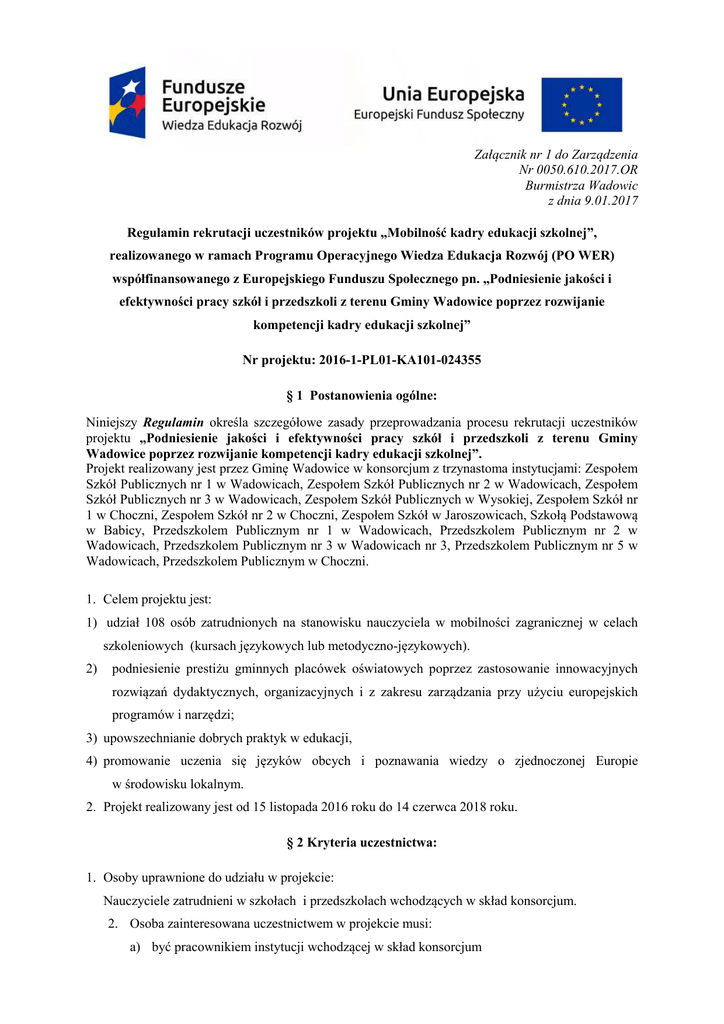 Załącznik nr 1 do Zarządzenia Nr 0050.610.2017.OR Burmistrza Wadowic z dnia 9.01.2017 Regulamin rekrutacji uczestników projektu „Mobilność kadry edukacji szkolnej”, realizowanego w ramach Programu Operacyjnego Wiedza Edukacja Rozwój (PO WER) współfinansowanego z Europejskiego Funduszu Społecznego pn. „Podniesienie jakości i efektywności pracy szkół i przedszkoli z terenu Gminy Wadowice poprzez rozwijanie kompetencji kadry edukacji szkolnej” Nr projektu: 2016-1-PL01-KA101-024355 § 1 Postanowienia ogólne: Niniejszy Regulamin określa szczegółowe zasady przeprowadzania procesu rekrutacji uczestników projektu „Podniesienie jakości i efektywności pracy szkół i przedszkoli z terenu Gminy Wadowice poprzez rozwijanie kompetencji kadry edukacji szkolnej”. Projekt realizowany jest przez Gminę Wadowice w konsorcjum z trzynastoma instytucjami: Zespołem Szkół Publicznych nr 1 w Wadowicach, Zespołem Szkół Publicznych nr 2 w Wadowicach, Zespołem Szkół Publicznych nr 3 w Wadowicach, Zespołem Szkół Publicznych w Wysokiej, Zespołem Szkół nr 1 w Choczni, Zespołem Szkół nr 2 w Choczni, Zespołem Szkół w Jaroszowicach, Szkołą Podstawową w Babicy, Przedszkolem Publicznym nr 1 w Wadowicach, Przedszkolem Publicznym nr 2 w Wadowicach, Przedszkolem Publicznym nr 3 w Wadowicach nr 3, Przedszkolem Publicznym nr 5 w Wadowicach, Przedszkolem Publicznym w Choczni. 1. Celem projektu jest: 1) udział 108 osób zatrudnionych na stanowisku nauczyciela w mobilności zagranicznej w celach szkoleniowych (kursach językowych lub metodyczno-językowych). 2) podniesienie prestiżu gminnych placówek oświatowych poprzez zastosowanie innowacyjnych rozwiązań dydaktycznych, organizacyjnych i z zakresu zarządzania przy użyciu europejskich programów i narzędzi; 3) upowszechnianie dobrych praktyk w edukacji, 4) promowanie uczenia się języków obcych i poznawania wiedzy o zjednoczonej Europie w środowisku lokalnym. 2. Projekt realizowany jest od 15 listopada 2016 roku do 14 czerwca 2018 roku. § 2 Kryteria uczestnictwa: 1. Osoby uprawnione do udziału w projekcie: Nauczyciele zatrudnieni w szkołach i przedszkolach wchodzących w skład konsorcjum. 2. Osoba zainteresowana uczestnictwem w projekcie musi: a) być pracownikiem instytucji wchodzącej w skład konsorcjum b) posiadać wykształcenie pedagogiczne ( nauczyciele, nauczyciele-dyrektorzy, pedagodzy, psychologowie, nauczyciele pracujący w świetlicach, nauczyciele-bibliotekarze) c) być zainteresowana udziałem w mobilności ze względu na cele projektu, d) wyrażać zgodę na modyfikację wykorzystywanego programu nauczania o nowe elementy polecane podczas mobilności. § 3 Zasady rekrutacji: 1. Rekrutacja odbywa się z uwzględnieniem równych szans, w tym zasady równości płci, wieku oraz stażu pracy. 2. Kandydaci, przed złożeniem formularza zgłoszeniowego, zapoznają się z całością niniejszego regulaminu. 3. Projekt zakłada rekrutację 108 uczestników. 4. Niniejszy regulamin dostępny jest na stronie internetowej instytucji wchodzących w skład konsorcjum. 5. Termin składania ankiet rekrutacyjnych trwa do 30 stycznia 2017 roku. Ankiety należy składać do sekretariatu szkoły/przedszkola. Ankiety są do pobrania w sekretariacie szkół/przedszkoli wchodzących w skład konsorcjum, oraz na stronie internetowej tych placówek.. 6. Złożone dokumenty rekrutacyjne są weryfikowane pod względem formalnym, a kandydaci mają możliwość jednokrotnego poprawienia lub uzupełnienia dokumentów formalnych. 7. Za termin złożenia dokumentów rekrutacyjnych przyjmuje się datę złożenia wszystkich wymaganych dokumentów poprawnych formalnie. 8. Wyboru uczestników mobilności zagranicznych Projektu na podstawie analizy dokumentów zgłoszeniowych dokonuje Komisja Rekrutacyjna złożona z przedstawiciela Organu Prowadzącego, przedstawicieli szkół i przedszkoli wchodzących w skład konsorcjum. Komisję Rekrutacyjną powołuje Burmistrz Wadowic. 9. Przyjmuje się następujące kryteria rekrutacji: 1) osobisty rozwój zawodowy uczestnika i podnoszenie kwalifikacji zawodowych poprzez udział w różnych formach doskonalenia (w okresie ostatnich 2 lat szkolnych): Za każdą formę rozwoju zawodowego przyznany będzie 1 pkt (maksymalnie 5pkt). 2) opinia nauczyciela w zakresie dotyczącym celów projektu– na podstawie ankiety rekrutacyjnej: a) dotychczasowe zaangażowanie w realizację dodatkowych działań, mających na celu rozwój zainteresowań uczniów, ich pasji (np. przygotowanie uczniów do konkursów, olimpiad przedmiotowych, prowadzenie zajęć pozalekcyjnych) - (maksymalnie 5pkt); b) gotowości do podnoszenia kompetencji językowych i wdrażania idei uczenia się przez całe życie (maksymalnie 5pkt, c) gotowości do dzielenia się wiedzą i umiejętnościami z gronem pedagogicznym (maksymalnie 5pkt; d) gotowości do udziału w mobilności zagranicznej i chęci wdrażania jej rezultatów(maksymalnie 5pkt; e) gotowości do promowania projektu w środowisku lokalnym (maksymalnie 5pkt). 10. O wyborze kandydata decyduje liczba uzyskanych punktów. 11. W przypadku tej samej liczby punktów o kolejności na liście decyduje kolejność zgłoszeń. 12. Beneficjent projektu (Gmina Wadowice) oraz instytucje wychodzące w skład konsorcjum zobowiązują się do umieszczenia wyników rekrutacji na stronach internetowych szkół /przedszkoli w terminie do dnia 20 lutego 2017 roku 13. Komisja rekrutacyjna sporządza protokół z listą osób, które złożyły dokumenty rekrutacyjne, listą osób zakwalifikowanych i listą osób rezerwowych. 14. Dokumenty złożone przez Kandydatów na uczestników projektu nie podlegają zwrotowi. 15. W przypadku niewystarczającej liczby uczestników związanej np. z rezygnacją, przyczynami losowymi, długotrwałą chorobą nauczyciela zrekrutowanego w etapie I oraz braku na liście rezerwowej odpowiedniej ilości kandydatów ogłasza się rekrutację dodatkową. § 