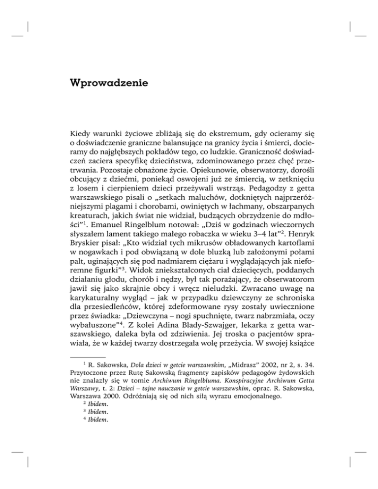 Wprowadzenie Kiedy warunki yciowe zbli aj si do ekstremum, gdy ocieramy si o do wiadczenie graniczne balansuj ce na granicy ycia i mierci, docieramy do najg bszych pok adów tego, co ludzkie. Graniczno do wiadcze zaciera specyfik dzieci stwa, zdominowanego przez ch przetrwania. Pozostaje obna one ycie. Opiekunowie, obserwatorzy, doro li obcuj cy z dzie mi, poniek d oswojeni ju ze mierci , w zetkni ciu z losem i cierpieniem dzieci prze ywali wstrz s. Pedagodzy z getta warszawskiego pisali o „setkach maluchów, dotkni tych najprzeró niejszymi plagami i chorobami, owini tych w achmany, obszarpanych kreaturach, jakich wiat nie widzia , budz cych obrzydzenie do md oci”1. Emanuel Ringelblum notowa : „Dzi w godzinach wieczornych s ysza em lament takiego ma ego robaczka w wieku 3–4 lat”2. Henryk Bryskier pisa : „Kto widzia tych mikrusów ob adowanych kartoflami w nogawkach i pod obwi zan w dole bluzk lub za o onymi po ami palt, uginaj cych si pod nadmiarem ci aru i wygl daj cych jak nieforemne figurki”3. Widok zniekszta conych cia dzieci cych, poddanych dzia aniu g odu, chorób i n dzy, by tak pora aj cy, e obserwatorom jawi si jako skrajnie obcy i wr cz nieludzki. Zwracano uwag na karykaturalny wygl d – jak w przypadku dziewczyny ze schroniska dla przesiedle ców, której zdeformowane rysy zosta y uwiecznione przez wiadka: „Dziewczyna – nogi spuchni te, twarz nabrzmia a, oczy wyba uszone”4. Z kolei Adina Blady-Szwajger, lekarka z getta warszawskiego, daleka by a od zdziwienia. Jej troska o pacjentów sprawia a, e w ka dej twarzy dostrzega a wol prze ycia. W swojej ksi ce R. Sakowska, Dola dzieci w getcie warszawskim, „Midrasz” 2002, nr 2, s. 34. Przytoczone przez Rut Sakowsk fragmenty zapisków pedagogów ydowskich nie znalaz y si w tomie Archiwum Ringelbluma. Konspiracyjne Archiwum Getta Warszawy, t. 2: Dzieci – tajne nauczanie w getcie warszawskim, oprac. R. Sakowska, Warszawa 2000. Odró niaj si od nich si wyrazu emocjonalnego. 2 Ibidem. 3 Ibidem. 4 Ibidem. 1 8 Wprowadzenie wspomnieniowej zapisa a znamienne zdanie: „A na pryczach le a y szkielety dzieci albo ogromne, obrz kni te bry y. I tylko oczy y y. A kto nie widzia takich oczu, takiej twarzy zag odzonego dziecka z czarn jam otwartych ust, ze zmarszczon pergaminow skór , ten nie wie, jakie mo e by ycie”5. Zarówno wysi ek opiekunów i lekarzy, jak i konsekwentny upór samych dzieci ukazuje nieustanne, pe ne inwencji wy anianie si ycia, ch ci przetrwania w najtrudniejszych warunkach. Po wiadczaj to relacje zawarte w niniejszym tomie. Przygotowuj c si do lektury relacji dzieci cych, musimy pami ta o tej granicznej sytuacji dzieci stwa w czasie Zag ady. W tamtych okoliczno ciach trudno mówi o dzieci stwie w formie, z jak obcujemy w warunkach normalno ci. Z trudem odnajdziemy po ród relacji dzieci cych klasyczne atrybuty dzieci stwa, takie jak beztroska zabawa, poczucie bezpiecze stwa czy wiadomo oparcia w doros ych. Wy aniaj si natomiast obrazy negatywno ci i utraty; jak pisa a o wojennym dzieci stwie Eva Hoffman, jest ono zaiste „sum wszystkich strat”6. Zasi g i ci g o tych strat ukazuj relacje z o one przez dzieci. Z du wyrazisto ci zaznacza si w nich obecno problemów okupacyjnej codzienno ci, nieustannie narastaj cego zagro enia, g odu i osamotnienia oraz ekspozycji na okropno ci wojny. Dzieci opowiadaj o utracie domu, mierci bliskich i cho czasem nie formu uj tego wprost, dotkliwie odczuwaj utrat poczucia przynale no ci do wspólnoty, a w ko cu ostateczne wykluczenie ze spo eczno ci ludzkiej. Dzieci, które z o y y swoje relacje w Centralnej ydowskiej Komisji Historycznej, przetrwa y, a wi c ocali y ycie. Niejednokrotnie prze y tak e kto z bliskich. Musimy jednak pami ta o tym, jak e cz sto ocalenie lub mier zale a y od przypadku i splotu przygodnych okoliczno ci. Nic nie stoi wi c na przeszkodzie, aby do wiadczenie tych dzieci uzna za reprezentatywne tak e dla tych, które Zag ady nie prze y y. Ponadto, jak uczy nas literatura Holokaustu, ocalony z Zag ady to okre lenie zawieraj ce w sobie pewn sprzeczno . Ocalenie, co staje si widoczne po lekturze relacji dzieci, oznacza o w wielu przypadkach osierocenie, zarówno rodzinne, jak i kulturowe. Ocalenie nios o ze sob spoeczne wyobcowanie, a dzieci stwo trwale naznaczone zosta o mierci . A. Blady-Szwajger, I wi cej nic nie pami tam, Warszawa 2010, s. 72. E. Hoffman, Zagubione w przek adzie, t um. M. Ronikier, Londyn 1995, s. 270. 5 6 Wprowadzenie 9 W wi kszym stopniu zaznajomieni ze wiadectwami doros ych, tym razem mo emy ws ucha si w g osy samych dzieci. Czy mo emy traktowa je jako wiarygodne? Wszak do powszechne jest przekonanie, e dzieci zmy laj , a ich zdolno rozumienia jest mocno ograniczona. Cz onkowie komisji gromadz cej relacje spodziewali si tak e, e dzieci b d ubarwia swoje opowie ci i mog konfabulowa . Wydaje si jednak, e nic takiego nie nast pi o. Zdaniem Henryka Grynberga, to raczej doro li maj sk onno do mitologizacji, podczas gdy „dzieci nie manipuluj prawd ”7. Zajmuj c si relacjami dzieci tehera skich ze zbiorów instytutu YIVO, pisarz przyzna : „Ten wiarygodny, rzetelny materia zafascynowa mnie”8. Dzieci ca perspektywa uderza jako wyj tkowo bliska rzeczywisto ci, gdy nie pretenduje do zilustrowania ca o ci i unika uogólnie . Znane s s owa Grynberga o narracjach dzieci ocala ych z Zag ady. W jednym z wywiadów mówi : „Dzieci Holokaustu najlepiej potrafi o nim opowiada , bo dla nich Holokaust by pocz tkiem wiata, bez adnego punktu odniesienia. Dzieci traktowa y Holokaust w sposób naturalny i mówi y o tym, co widzia y, nie nawi zuj c do przesz o ci, do adnej wcze niejszej wiedzy”9. Izraelski pisarz Aaron Appelfeld, odwo uj c si do znanego wiersza Paula Celana, zauwa y , e dzieci ssa y czarne mleko Holokaustu codziennie, rano, w po udnie i w nocy… Ta szczególna kondycja dziecka, jak j widz Appelfeld i Grynberg, polega a na tym, e od najwcze niejszych lat wzrasta o w Zag adzie i, w przeciwie stwie do doros ych, nie by 