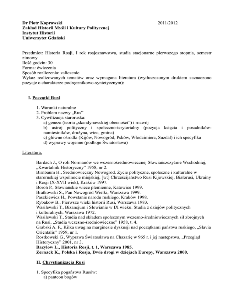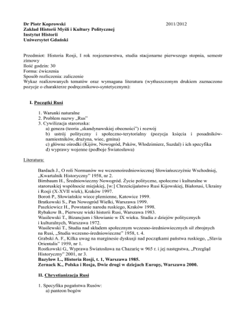Dr Piotr Koprowski Zakład Historii Myśli i Kultury Politycznej Instytut Historii Uniwersytet Gdański 2011/2012 Przedmiot: Historia Rosji, I rok rosjoznawstwa, studia stacjonarne pierwszego stopnia, semestr zimowy Ilość godzin: 30 Forma: ćwiczenia Sposób rozliczenia: zaliczenie Wykaz realizowanych tematów oraz wymagana literatura (wytłuszczonym drukiem zaznaczono pozycje o charakterze podręcznikowo-syntetycznym): I. Początki Rusi 1. Warunki naturalne 2. Problem nazwy „Rus” 3. Cywilizacja staroruska: a) geneza (teoria „skandynawskiej obecności”) i rozwój b) ustrój polityczny i społeczno-terytorialny (pozycja księcia i posadnikównamiestników, drużyna, wiec, gmina) c) główne ośrodki (Kijów, Nowogród, Psków, Włodzimierz, Suzdal) i ich specyfika d) wyprawy wojenne (podboje Światosława) Literatura: Bardach J., O roli Normanów we wczesnośredniowiecznej Słowiańszczyźnie Wschodniej, „Kwartalnik Historyczny” 1958, nr 2. Birnbaum H., Średniowieczny Nowogród. Życie polityczne, społeczne i kulturalne w staroruskiej wspólnocie miejskiej, [w:] Chrześcijaństwo Rusi Kijowskiej, Białorusi, Ukrainy i Rosji (X-XVII wiek), Kraków 1997. Boroń P., Słowiańskie wiece plemienne, Katowice 1999. Bratkowski S., Pan Nowogród Wielki, Warszawa 1999. Paszkiewicz H., Powstanie narodu ruskiego, Kraków 1998. Rybakow B., Pierwsze wieki historii Rusi, Warszawa 1983. Wasilewski T., Bizancjum i Słowianie w IX wieku. Studia z dziejów politycznych i kulturalnych, Warszawa 1972. Wasilewski T., Studia nad składem społecznym wczesno-średniowiecznych sił zbrojnych na Rusi, „Studia wczesno-średniowieczne” 1958, t. 4. Grabski A. F., Kilka uwag na marginesie dyskusji nad początkami państwa ruskiego, „Slavia Orientalis” 1959, nr 1. Rostkowski G., Wyprawa Światosława na Chazarię w 965 r. i jej następstwa, „Przegląd Historyczny” 2001, nr 3. Bazylow L., Historia Rosji, t. 1, Warszawa 1985. Zernack K., Polska i Rosja, Dwie drogi w dziejach Europy, Warszawa 2000. II. Chrystianizacja Rusi 1. Specyfika pogaństwa Rusów: a) panteon bogów b) kult c) rola religii pogańskiej w procesie konsolidacji państwa i poszczególnych grup społecznych 2. Początki chrześcijaństwa na Rusi 3. Chrzest i jego następstwa 4. Ruska Cerkiew: a) organizacja b) pozycja prawna c) relacje z państwem Literatura: Brückner A., Mitologia słowiańska i polska, Warszawa 1985. Gieysztor A., Słowiańskie wierzenia tradycyjne i chrystianizacja Rusi: Zmiana i kontynuacja, [w:] Chrześcijaństwo Rusi... Dzieło chrystianizacji Rusi Kijowskiej i jego konsekwencje w kulturze Europy, Lublin 1988. Paszkiewicz H., Początki Rusi, Kraków 1996. Chrystus zwyciężył. Wokół chrztu Rusi Kijowskiej, Warszawa 1989. Petelczyc R., Pierwsi ruscy święci Borys i Gleb w legendach staroruskich, „Przegląd Humanistyczny”1989, nr 10. Gumilow L., Od Rusi do Rosji, Warszawa 2004. III. Niewola mongolska 1. Rozdrobnienie feudalne na Rusi: a) geneza b) specyfika c) konsekwencje 2. Inwazja mongolska: a) przebieg b) specyfika c) następstwa 3. Ruś w okresie „jarzma mongolskiego”: a) polityka Ordy wobec Rusi i książąt ruskich b) życie codzienne ludności ruskiej 4. Cerkiew w czasach dominacji mongolsko-tatarskiej Literatura: Opowieść o tym, jak Batu-chan zburzył Riazań, [w:] Literatura staroruska. Wiek XI-XVII. Antologia, Warszawa 1971. Kałużyński S., Dawni Mongołowie, Warszawa 1983. Zientara B., Dawna Rosja. Despotyzm i demokracja, Warszawa 1995. Słowo o ruinie Ziemi Ruskiej po śmierci wielkiego księcia Jarosława, [w:] Literatura staroruska... Andrusiewicz A., Cywilizacja rosyjska, t. 1, Warszawa 2004. Heller M., Historia imperium rosyjskiego, Warszawa 2000. IV-V. Kultura staroruska 1. Kulturotwórcza rola Cerkwi 2. Klasztory – ośrodkami formowania „nowych ludzi” 3. Prawosławie a myśl filozoficzna 4. „Przepływy kulturowe” między Rusią a Bizancjum i Zachodem 5. Fenomen jurodstwa Literatura: Billington J. H., Ikona i topór. Historia kultury rosyjskiej, Kraków 2008. Lipatow A., Rosja i Polska: konfrontacja i grawitacja. Historia. Kultura. Literatura. Polityka, Toruń 2003. Małek E., Gest w kulturze i literaturze staroruskiej, [w:] Literatura rosyjska i jej kulturowe konteksty, Wrocław – Warszawa – Kraków – Gdańsk – Łódź 1990. Wójcicka U., Staroruska interpretacja rzeczywistości (Obrzęd pogrzebowy – mit – symbol), [w:] Literatura rosyjska... Kłoczowski J., Od pustelni do wspólnoty. Grupy zakonne w wielkich religiach świata , Warszawa 1987. Łotman J., Uspienski B., Rola modeli dualnych w dynamice kultury rosyjskiej (do końca XVIII w.), [w:] Semiotyka dziejów Rosji, Łódź 1993. Lichaczow D. S., Poetyka literatury staroruskiej, Warszawa 1981. Panczenko A., Staroruskie szaleństwo Chrystusowe jako widowisko, [w:] Semiotyka... Fiedotow G., Święci Rusi (X-XVII w.), Białystok – Bydgoszcz 2002. Wodziński C., Św. Idiota, Gdańsk 2003. Koprowski P., Szaleniec czy mędrzec? Szkic do portretu ruskiego jurodiwego, [w:] Zrozumieć szaleństwo. Szkice z zakresu humanistyki (w druku). Kowalska H., Kultura staroruska XI-XVI w. Tradycja i zmiany, Kraków 1998. Zielewska-Rudnicka B., Znaczenie średniowiecznego prawosławia dla filozofii rosyjskiej, „Humanistyka i przyrodoznawstwo” 2010, nr 16. VI. Narodziny silnej władzy centralnej (XIV-I poł. XV w.) 1. 2. 3. 4. 5. Ekspansja litewska Uwalnianie się spod mongolsko-tatarskiego nadzoru (znaczenie bitwy na Kulikowym Polu) Idea silnej władzy książęcej Rozszerzenie wpływów Kościoła łacińskiego Wzrost znaczenia politycznego, religijnego, ekonomicznego Wielkiego Księstwa Moskiewskiego Literatura: Dogońska J., Cywilizacyjna tożsamość Rosji, Toruń 1997. Kuczyński S. M., U podstaw rozwoju i potęgi Księstwa Moskiewskiego, Łódź 1955. Alexandrowicz S., Ruska świadomość narodowa w średniowieczu, [w:] Państwo, naród, stany w świadomości wieków średnich, Warszawa 1990. Heller M.,