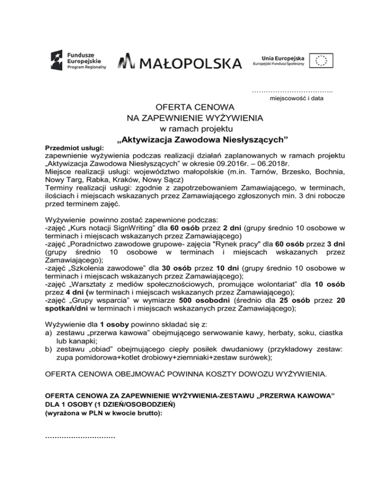…………………………….. miejscowość i data OFERTA CENOWA NA ZAPEWNIENIE WYŻYWIENIA w ramach projektu „Aktywizacja Zawodowa Niesłyszących” Przedmiot usługi: zapewnienie wyżywienia podczas realizacji działań zaplanowanych w ramach projektu „Aktywizacja Zawodowa Niesłyszących” w okresie 09.2016r. – 06.2018r. Miejsce realizacji usługi: województwo małopolskie (m.in. Tarnów, Brzesko, Bochnia, Nowy Targ, Rabka, Kraków, Nowy Sącz) Terminy realizacji usługi: zgodnie z zapotrzebowaniem Zamawiającego, w terminach, ilościach i miejscach wskazanych przez Zamawiającego zgłoszonych min. 3 dni robocze przed terminem zajęć. Wyżywienie powinno zostać zapewnione podczas: -zajęć „Kurs notacji SignWriting” dla 60 osób przez 2 dni (grupy średnio 10 osobowe w terminach i miejscach wskazanych przez Zamawiającego) -zajęć „Poradnictwo zawodowe grupowe- zajęcia "Rynek pracy" dla 60 osób przez 3 dni (grupy średnio 10 osobowe w terminach i miejscach wskazanych przez Zamawiającego); -zajęć „Szkolenia zawodowe” dla 30 osób przez 10 dni (grupy średnio 10 osobowe w terminach i miejscach wskazanych przez Zamawiającego); -zajęć „Warsztaty z mediów społecznościowych, promujące wolontariat” dla 10 osób przez 4 dni (w terminach i miejscach wskazanych przez Zamawiającego); -zajęć „Grupy wsparcia” w wymiarze 500 osobodni (średnio dla 25 osób przez 20 spotkań/dni w terminach i miejscach wskazanych przez Zamawiającego); Wyżywienie dla 1 osoby powinno składać się z: a) zestawu „przerwa kawowa” obejmującego serwowanie kawy, herbaty, soku, ciastka lub kanapki; b) zestawu „obiad” obejmującego ciepły posiłek dwudaniowy (przykładowy zestaw: zupa pomidorowa+kotlet drobiowy+ziemniaki+zestaw surówek); OFERTA CENOWA OBEJMOWAĆ POWINNA KOSZTY DOWOZU WYŻYWIENIA. OFERTA CENOWA ZA ZAPEWNIENIE WYŻYWIENIA-ZESTAWU „PRZERWA KAWOWA” DLA 1 OSOBY (1 DZIEŃ/OSOBODZIEŃ) (wyrażona w PLN w kwocie brutto): ………………………… OFERTA CENOWA ZA ZAPEWNIENIE WYŻYWIENIA-ZESTAWU „OBIAD” DLA 1 OSOBY (1 DZIEŃ/OSOBODZIEŃ) (wyrażona w PLN w kwocie brutto): ………………………… ………………………… Podpis i pieczątka Oferenta Oświadczenie Oferenta o braku powiązań kapitałowych lub osobowych Ja, niżej podpisana/y ……………………………………… zam…………………………..……. ……………………………………… PESEL:…………………………….. oświadczam, że nie jestem powiązana/y kapitałowo lub osobowo z Zamawiającym tj. Fundacją Rozwoju Regionalnego Viribus Unitis z siedzibą: ul. Myśliwska 4c/8, 33-300 Nowy Sącz lub osobami upoważnionymi do zaciągania zobowiązań w imieniu Zamawiającego lub osobami wykonującymi w imieniu Zamawiającego czynności związane z przygotowaniem i przeprowadzeniem procedury wyboru wykonawcy (Jadwiga Brożek zam. ul. Wolańska 3, 33-100 Tarnów, PESEL 67070600149), a wykonawcą (oferentem) które polegałoby w szczególności na: 1/ uczestniczeniu w spółce jak wspólnik spółki cywilnej lub osobowej, 2/ posiadaniu co najmniej 10% udziałów lub akcji, 3/ pełnieniu funkcji członka organu nadzorczego lub zarządzającego, prokurenta lub pełnomocnika, 4/ pozostawaniu w związku małżeńskim, w stosunku pokrewieństwa lub powinowactwa w linii prostej, pokrewieństwa drugiego stopnia lub powinowactwa drugiego stopnia w linii bocznej lub w stosunku przysposobienia, opieki lub kurateli. ………………………… Podpis Oferenta