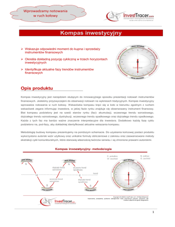 Wprowadzamy notowania w ruch kołowy Kompas inwestycyjny Wskazuje odpowiedni moment do kupna i sprzedaży instrumentów finansowych Określa dokładną pozycję cykliczną w trzech horyzontach inwestycyjnych Identyfikuje aktualne fazy trendów instrumentów finansowych Opis produktu Kompas inwestycyjny jest narzędziem służącym do innowacyjnego sposobu prezentacji notowań instrumentów finansowych. Jesteśmy przyzwyczajeni do obserwacji notowań na wykresach tradycyjnych. Kompas inwestycyjny wprowadza notowania w ruch kołowy. Wskazówka kompasu kręci się w koło w kierunku zgodnym z ruchem wskazówek zegara informując inwestora, w jakiej fazie rynku znajduje się obserwowany instrument finansowy. Blat kompasu podzielony jest na sześć stanów rynku (faz): akumulacji, wczesnego trendu wzrostowego, dojrzałego trendu wzrostowego, dystrybucji, wczesnego trendu spadkowego oraz dojrzałego trendu spadkowego. Każda z tych faz ma bardzo ważne znaczenie interpretacyjne dla inwestora. Dodatkowo każdą fazę cyklu podzielono na, pod-fazy, aby dokładniej identyfikować aktualne wskazania kompasu. Metodologię budowy kompasu prezentujemy na poniższym schemacie. Do uzyskania końcowej postaci produktu wykorzystano autorski wzór użytkowy oraz unikalne formuły obliczeniowe z zakresu oraz zaawansowane metody ekstrakcji cykli koniunkturalnych, które stanowią własnością twórców serwisu i są chronione prawami autorskimi. 1 Kompas inwestycyjny dostępny jest w trzech horyzontach inwestycyjnych: 1. krótkoterminowym (dane 15 minutowe) dla wybranych najbardziej popularnych serii notowań (indeksów, walut, surowców, najbardziej płynnych spółek). 2. średnioterminowym (dane dzienne) dla wszystkich instrumentów finansowych, dla których dostępne są notowania w czasie rzeczywistym oraz notowania dzienne. 3. długoterminowym (dane miesięczne na koniec miesiąca kalendarzowego). Dzięki wyznaczeniu trzech horyzontów inwestycyjnym możliwe jest ustalenie cyklu dominującego i wyznaczanie właściwego momentu otwarcia pozycji zgodnie z makroekonomicznym cyklem koniunkturalnym Kitchina w gospodarce trwającym średnio około 4 lata. Wysoka zbieżność przebiegu indeksu z barometrem koniunktury giełdowej WigTracer pozwala wnioskować, że jest to cykl dominujący również w odniesieniu notowanych na niej instrumentów finansowych. Cykle średnio i krótkoterminowy są odpowiednio cyklami niższego rzędu i znajdują zastosowanie w inwestowaniu w krótszym horyzoncie inwestycyjnym. Kompas inwestycyjny znajduje zastosowanie do obserwacji indeksów giełdowych, cen akcji, kursów walutowych, cen surowców, obligacji, instrumentów pochodnych, notowań jednostek uczestnictwa funduszy inwestycyjnych, a także w horyzoncie miesięcznym wybranych wskaźników makroekonomicznych. Kompas inwestycyjny dostępny jest z poziomu menu głównego Analiza Cykliczna/Kompas inwestycyjny. Po wybraniu instrumentu finansowego jesteśmy przenoszeni do widoku kompasu. Kompas inwestycyjny dostępny jest również z poziomu szczegółów instrumentu finansowego. Wyboru instrumentów finansowych dokonuje się za pomocą funkcji znajdź instrument na stronie głównej lub kontekstowo w dowolnym miejscu na portalu klikając na oznaczoną na czerwono i podkreśloną nazwę instrumentu. Wybór instrumentu przenosi nas do widoku szczegółowego gdzie na drugiej pozycji widoczna jest funkcja wyboru „Kompas inwestycyjny”. 2 Jak stosować? Kompas inwestycyjny może być stosowany na wiele sposobów: 1. Jako narzędzie pomocnicze będące wsparciem decyzji inwestycyjnych podejmowanych w oparciu o inne kryteria: analizy technicznej, fundamentalnej, portfelowej. 2. Jako wskazówka pozwalająca zorientować się, w jakiej fazie cyklu znajduje się instrument finansowy. 3. Jako niezależne narzędzie pomagające w wyborze momentu otwarcia i zamknięcia pozycji w trzech horyzontach inwestycyjnych: krótkoterminowym (dane 15 minutowe), średnioterminowym (dane dzienne), długoterminowym (dane miesięczne). 4. Jako element bardziej złożonej strategii top- down (od ogółu do szczegółu). W ramach tej strategii podstawą podejmowania decyzji w układzie dziennym jest cykl miesięczny. Jeżeli instrument finansowy w horyzoncie miesięcznym podąża na północ oraz w układzie dziennym również na północ otrzymujemy potwierdzenie, że inwestujemy w horyzoncie dziennym zgodnie z trendem dominującym, co zwiększa prawdopodobieństwo sukcesu. Podobną strategię można zastosować w odniesieniu do notowań 15 minutowych. Zajmowanie pozycji w tym horyzoncie powinno być zgodne z kierunkiem dominującym w układzie dziennym. Kompas inwestycyjny oparty jest na przyjętych, optymalizowanych formułach matematyczno- statystycznych, stąd zarówno postać trendu, jak również przebieg cyklu jest efektem wybranej metody dekompozycji serii statystycznych. Dlatego powinien być stosowany jako narzędzie pomocnicze w podejmowaniu decyzji inwestycyjnych służące do określenia orientacyjnego stanu rynku. Przed skorzystaniem z narzędzia należy zapoznać się z jego funkcjonowaniem wykorzystując do tego celu tester oraz należy zapoznać się z sekcją stany szczególne. 3 Podstawowa interpretacja odczytów kompasu w każdym z trzech horyzontów inwestycyjnych jest następująca: Faza cyklu Akumulacja Pod-faza cyklu E4-S-S1 Interpretacja To czas największych możliwości inwestycyjnych. Cykl notowań kończy spadki i przechodzi do fazy wzrostowej. Z uwagi na trudność dokładnego uchwycenia momentu przejścia z trendu wzrostowego do spadkowego wyznaczyliśmy orientacyjny obszar akumulacji. Charakterystyczne dla tej fazy działania to kupno, akumulacja, otwieranie pozycji długich, zamykanie pozycji krótkich. Wczesny trend wzrostowy S1-S2-S3-S4-W Cykl notowań wchodzi w fazę wczesnego trendu wzrostowego bezpośrednio po fazie akumulacji znajduje się jeszcze poniżej trendu. Charakterystyczne dla tej fazy notowań to trz