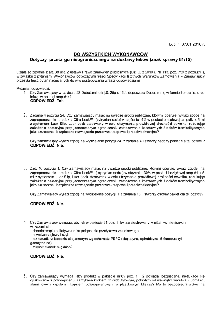 Lublin, 07.01.2016 r. DO WSZYSTKICH WYKONAWCÓW Dotyczy przetargu nieograniczonego na dostawy leków (znak sprawy 81/15) Działając zgodnie z art. 38 ust. 2 ustawy Prawo zamówień publicznych (Dz. U. z 2010 r. Nr 113, poz. 759 z późn.zm.), w związku z pytaniami Wykonawców dotyczącymi treści Specyfikacji Istotnych Warunków Zamówienia – Zamawiający przesyła treść pytań nadesłanych do w/w postępowania wraz z odpowiedziami. Pytania i odpowiedzi: 1. Czy Zamawiający w pakiecie 23 Dobutamine inj.0, 25g x 1fiol, dopuszcza Dobutaminę w formie koncentratu do infuzji w postaci ampułek? ODPOWIEDŹ: Tak. 2. Zadanie 4 pozycja 24. Czy Zamawiający mając na uwadze środki publiczne, którymi operuje, wyrazi zgodę na zaproponowanie produktu Citra-Lock™ (cytrynian sodu) w stężeniu 4% w postaci bezigłowej ampułki x 5 ml z systemem Luer Slip, Luer Lock stosowany w celu utrzymania prawidłowej drożności cewnika, redukując zakażenia bakteryjne przy jednoczesnym ograniczeniu zastosowania kosztownych środków trombolitycznych jako skuteczne i bezpieczne rozwiązanie przeciwzakrzepowe i przeciwbakteryjne? Czy zamawiający wyrazi zgodę na wydzielenie pozycji 24 z zadania 4 i stworzy osobny pakiet dla tej pozycji ? ODPOWIEDŹ: Nie. 3. Zad. 16 pozycja 1. Czy Zamawiający mając na uwadze środki publiczne, którymi operuje, wyrazi zgodę na zaproponowanie produktu Citra-Lock™ ( cytrynian sodu ) w stężeniu 30% w postaci bezigłowej ampułki x 5 ml z systemem Luer Slip, Luer Lock stosowany w celu utrzymania prawidłowej drożności cewnika, redukując zakażenia bakteryjne przy jednoczesnym ograniczeniu zastosowania kosztownych środków trombolitycznych jako skuteczne i bezpieczne rozwiązanie przeciwzakrzepowe i przeciwbakteryjne? Czy Zamawiający wyrazi zgodę na wydzielenie pozycji 1 z zadania 16 i stworzy osobny pakiet dla tej pozycji? ODPOWIEDŹ: Nie. 4. Czy Zamawiający wymaga, aby lek w pakiecie 61 poz. 1 był zarejestrowany w niżej wymienionych wskazaniach: - chemioterapia paliatywna raka połączenia przełykowo-żołądkowego - nowotwory głowy i szyi - rak trzustki w leczeniu skojarzonym wg schematu PEFG (cisplatyna, epirubicyna, 5-fluorouracyl i gemcytabina) - mięsaki tkanek miękkich? ODPOWIEDŹ: Nie. 5. Czy zamawiający wymaga, aby produkt w pakiecie nr.85 poz. 1 i 2 posiadał bezpieczne, nietłukące się opakowanie z polipropylenu, zamykane korkiem chlorobutylowym, pokrytym od wewnątrz warstwą FluoroTec, aluminiowym kapslem i kapslem polipropylenowym w plastikowym blistrze? Ma to bezpośredni wpływ na bezpieczeństwo osób zajmujących się przygotowywaniem leków w pracowni cytostatycznej, chroniąc zawartość fiolki po upuszczeniu. ODPOWIEDŹ: Tak. 6. Czy Zamawiający wymaga, aby produkt w pakiecie nr.85 poz 1 i 2 posiadał wskazanie w leczeniu w skojarzeniu z kapecytabiną z bewacyzumabem lub bez bewacyzumabu jako leczenie pierwszego rzutu u pacjentów z rozsianą postacią jelita grubego? ODPOWIEDŹ: Nie. 7. Czy Zamawiający w pakiecie nr.103 poz 1 (Linezolid) wymaga, aby opakowanie zawierało gotowe do użycia, jednorazowe worki do infuzji wykonane z wielowarstwowej powłoki poliolefinowej, pokryte folią laminowaną? Takie opakowanie ma szereg istotnych cech, ważnych z punktu widzenia bezpieczeństwa pacjenta, między innymi zewnętrzna torebka chroni Linezolid przed szkodliwym wpływem światła widzialnego, oraz ultrafioletu. W przypadku narażenia na światło widzialne oraz UV syntetycznych chemioterapeutyków, można się spodziewać osłabienia wiązań w miejscu docelowymi utrudnienia w powstawaniu aktywnego kompleksu, który jest odpowiedzialny za hamowanie produkcji białek bakteryjnych, tj. za właściwy mechanizm działania przeciwbakteryjnego? ODPOWIEDŹ: Nie. 8. Zadanie 93. Czy żel o właściwościach znieczulających powinien być sterylizowany najbezpieczniejszą metodą sterylizacji parą wodną? ODPOWIEDŹ: Nie. 9. Zadanie 93. W związku z tym, że żel stosowany jest na błony śluzowe, czy Zamawiający mając na uwadze bezpieczeństwo pacjenta, oczekuje przedstawienia badań na biokompatybilność chlorheksydyny? ODPOWIEDŹ: Nie. 10. Dot. zadania 101, poz. od 1 do 8. W związku z umieszczeniem w opisie przedmiotu zamówienia w poz. od 1 do 4 Zadania 101 nazwy własnej środków spożywczych specjalnego przeznaczenia medycznego będącej zastrzeżonym znakiem towarowym konkretnego producenta, co jednakże ograniczałoby konkurencję do wyrobów tegoż wytwórcy, uprzejmie prosimy o dopuszczenie możliwości złożenia oferty w postaci równoważnego preparatu probiotycznego będącego dietetycznym środkiem spożywczym specjalnego przeznaczenia medycznego przeznaczonym do stosowania u niemowląt, dzieci i osób dorosłych, zawierającym najlepiej przebadany pod względem klinicznym szczep bakterii probiotycznych Lactobacillus rhamnosus GG (działanie potwierdzone w kilkuset opublikowanych badaniach klinicznych)w stężeniu 6 mld CFU/kapsułkę, konfekcjonowanego w opakowaniach x 30 kapsułek – po przeliczeniu ilości kapsułek na odpowiednią liczbę opakowań. Oferowany preparat stanowi pod względem składu bakterii probiotycznych odpowiednik produktu o nazwie własnej wymienionej w poz. 3 Zadania 101. ODPOWIEDŹ: Tak, Zamawiający dopuszcza zaoferowanie preparatów równoważnych. 11. Dot. zadania nr 74. Czy Zamawiający wymaga, aby oferowany produkt posiadał potwierdzoną klinicznie skuteczność w redukcji czasu trwania oraz stopniu nasilenia zapalenia błony śluzowej jamy ustnej u pacjentów poddawanych przeszczepowi krwiotwórczych komórek macierzystych? ODPOWIEDŹ: Nie. 12. Dot. zadania nr 74. Czy Zamawiający mając na uwadze bezpieczeństwo pacjentów leczonych w klinice wymaga, aby oferowany preparat spełniał wymagania jałowości każdej dawki, oraz nie posiadała w składzie konserwantu, chlorku benzalkoniowego (BAC)? ODPOWIEDŹ: Tak, preparat spełniać wymóg jałowości każdej dawki, lecz może posiadać w