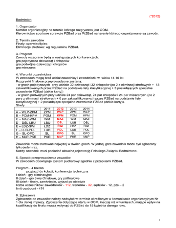 (*2012) Badminton 1. Organizator Komitet organizacyjny na terenie którego rozgrywana jest OOM. Kierownictwo sportowe sprawuje PZBad oraz WZBad na terenie którego organizowane są zawody. 2. Termin zawodów Finały: czerwiec/lipiec Eliminacje strefowe: wg regulaminu PZBad. 3. Program Zawody rozegrane będą w następujących konkurencjach: gra pojedyncza dziewcząt i chłopców gra podwójna dziewcząt i chłopców gra mieszana 4. Warunki uczestnictwa W zawodach mogą brać udział zawodnicy i zawodniczki w wieku 14-16 lat. Rozgrywki finałowe przeprowadzone zostaną: - w grach pojedynczych przy udziale 32 dziewcząt i 32 chłopców (po 2 z eliminacji strefowych + 13 zakwalifikowanych przez PZBad na podstawie listy klasyfikacyjnej + 3 posiadających specjalne zezwolenie PZBad (dzikie karty)) - w grach podwójnych przy udziale 24 par dziewcząt, 24 par chłopców i 24 par mieszanych (po 2 pary z eliminacji strefowych + 6 par zakwalifikowanych przez PZBad na podstawie listy klasyfikacyjnej + 2 posiadające specjalne zezwolenie PZBad (dzikie karty)). Strefy 2011 A – WLP-ZPM B – POM-KPM C – MAZ-WM D – DŚL-LBU E – ŁDZ-ŚWI F – LUB-PDL G – ŚL-OPO H – MŁP-PKR ZPM POM WM LBU ŁDZ LUB ŚL PKR 2012 WLP KPM MAZ DŚL ŚWI PDL OPO MŁP 2013 ZPM POM WM LUB ŁDZ LUB ŚL PKR 2014 WLP KPM MAZ DŚL ŚWI PDL OPO MŁP Zawodnik może startować najwyżej w dwóch grach. W jednej grze zawodnik może być zgłoszony tylko jeden raz. Każdy zawodnik musi posiadać aktualną rejestrację Polskiego Związku Badmintona. 5. Sposób przeprowadzenia zawodów W zawodach obowiązuje system pucharowy zgodnie z przepisami PZBad. Program - 4 boiska przyjazd do kolacji, konferencja techniczna I dzień - gry eliminacyjne II dzień - gry ćwierćfinałowe, gry półfinałowe III dzień - finały, zamknięcie, wyjazd po obiedzie liczba uczestników: zawodników - 112, trenerów - 32, sędziów - 12, pzs – 2 limit osobodni - 474 6. Zgłoszenia Zgłoszenie do zawodów należy nadsyłać w terminie określonym w komunikacie organizacyjnym Nr 1 dla danej imprezy. Zgłoszenia dotyczące startu w OOM, inaczej niż w turniejach, mające wpływ na kwalifikację do finału muszą wpłynąć do PZBad do 15 kwietnia danego roku. 1 PZBad opublikuje listę zakwalifikowanych przez PZBad do finałów przed eliminacjami strefowymi. Ewentualne niewykorzystane miejsca z eliminacji strefowych są uzupełniane przez PZBad z listy klasyfikacyjnej. 7. Punktacja gry pojedyncze Lok. 1 2 3-4 5-8 9-16 17-32 PKT 9 7 5 4 3 1 82 gry podwójne, gra mieszana Lok. 1 2 3-4 5-8 PKT 9 7 5 3 38 D. System ocen Badminton I. Młodzieżowe Mistrzostwa Polski K/M - 20-22 lat 1.Program zawodów. K/M - gra pojedyncza, gra podwójna oraz gra mieszana 2. Punktacja. Lok. 1 2 3-4 5-8 PKT 25 21 17 11 124 II. Mistrzostwa Polski Juniorów K/M - 17-19 lat 1.Program zawodów. K/M - gra pojedyncza, gra podwójna oraz gra mieszana 2. Punktacja. gry pojedyncze Lok. 1 2 3-4 5-8 9-16 PKT 15 12 9 4 2 77 gry podwójne, gra mieszana Lok. 1 2 3-4 5-8 PKT 15 12 9 4 61 III. Olimpiada Młodzieży - Mistrzostwa Polski Juniorów Młodszych - K/M - 14-16 lat 1.Program zawodów. K/M - gra pojedyncza, gra podwójna oraz gra mieszana 2. Punktacja. gry pojedyncze Lok. 1 2 3-4 5-8 9-16 17-32 PKT 9 7 5 4 3 1 82 gry podwójne, gra mieszana Lok. 1 2 3-4 5-8 PKT 9 7 5 3 38 2 Eliminacje do OOM – strefowe + lista PZBad Strefy 2012 2011 2013 WLP ZPM A – WLP-ZPM ZPM KPM POM B – POM-KPM POM MAZ WM C – MAZ-WM WM DŚL LUB D – DŚL-LBU LBU ŚWI ŁDZ E – ŁDZ-ŚWI ŁDZ PDL LUB F – LUB-PDL LUB OPO ŚL G – ŚL-OPO ŚL MŁP PKR H – MŁP-PKR PKR 2014 WLP KPM MAZ DŚL ŚWI PDL OPO MŁP IV. Międzywojewódzkie Mistrzostwa Młodzików - K/M - 10-13 lat 1.Program zawodów K/M - gra pojedyncza, gra podwójna, gra mieszana 2. Punktacja Lok. 1 2 3-8 PKT 3 2 1 11 Strefy A – WLP-ZPM B – POM-KPM C – MAZ-WM D – DŚL-LBU E – ŁDZ-ŚWI F – LUB-PDL G – ŚL-OPO H – MŁP-PKR E. Roczniki młodzieżowcy juniorzy juniorzy młodsi młodzicy 2011 WLP POM WM LBU ŚWI PDL OPO MŁP 2012 ZPM KPM MAZ DŚL ŁDZ LUB ŚL PKR 2013 WLP POM WM LBU ŚWI PDL OPO MŁP 2014 ZPM KPM MAZ DŚL ŁDZ LUB ŚL PKR 20-22 lat (w 2012 roku urodzeni 01.01.1990 – 31.12.1992) 17-19 lat (w 2012 roku urodzeni 01.01.1993 – 31.12.1995) 14-16 lat (w 2012 roku urodzeni 01.01.1996 – 31.12.1998) 10-13 lat (w 2012 roku urodzeni 01.01.1999 – 31.12.2002) Przypominamy: - w zawodach uczestniczą kluby aktualnie zarejestrowane w PZBad,, - zawodnicy muszą posiadać aktualną rejestrację wydaną przez PZBad, - w przypadku braku przynależności klubowej – punkty naliczane będą dla gminy, - komunikat z zawodów powinien zawierać rok urodzenia zawodnika, numer rejestracji oraz pełną nazwę klubu, wykaz członków komisji sędziowskiej wraz z ich nr licencji i być podpisany przez sędziego głównego z podaniem jego nr licencji - komunikat z zawodów należy przesłać na adres Polskiej Federacji Sportu Młodzieżowego w ciągu 14 dni po zawodach, - prosimy o zapoznanie się z częścią ogólną regulaminu współzawodnictwa, gdzie podane są zasady uczestnictwa i oceny wyników we wszystkich dyscyplinach systemu, - na stronie internetowej PFSM (www.sportmlodziezowy.pl) umieszczane są średnio co dwa tygodnie wyniki współzawodnictwa, - od 2010 roku w Młodzieżowych Mistrzostwach Polski w konkurencjach indywidualnych, gdzie liczba ostatecznie sklasyfikowanych zawodników jest mniejsza niż 8, zawodnicy będą otrzymywać połowę punktów. 3