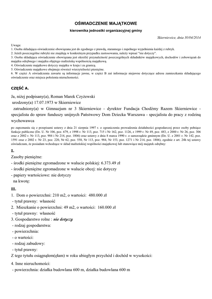 OŚWIADCZENIE MAJĄTKOWE kierownika jednostki organizacyjnej gminy Skierniewice, dnia 30/04/2014 Uwaga: 1. Osoba składająca oświadczenie obowiązana jest do zgodnego z prawdą, starannego i zupełnego wypełnienia każdej z rubryk. 2. Jeżeli poszczególne rubryki nie znajdują w konkretnym przypadku zastosowania, należy wpisać "nie dotyczy". 3. Osoba składająca oświadczenie obowiązana jest określić przynależność poszczególnych składników majątkowych, dochodów i zobowiązań do majątku odrębnego i majątku objętego małżeńską wspólnością majątkową. 4. Oświadczenie majątkowe dotyczy majątku w kraju i za granicą. 5. Oświadczenie majątkowe obejmuje również wierzytelności pieniężne. 6. W części A oświadczenia zawarte są informacje jawne, w części B zaś informacje niejawne dotyczące adresu zamieszkania składającego oświadczenie oraz miejsca położenia nieruchomości. CZĘŚĆ A. Ja, niżej podpisany(a), Roman Marek Czyżewski urodzony(a) 17.07.1973 w Skierniewice zatrudniony(a) w Gimnazjum nr 3 Skierniewice - dyrektor Fundacja Chodźmy Razem Skierniewice specjalista do spraw funduszy unijnych Państwowy Dom Dziecka Warszawa - specjalista do pracy z rodziną wychowawca po zapoznaniu się z przepisami ustawy z dnia 21 sierpnia 1997 r. o ograniczeniu prowadzenia działalności gospodarczej przez osoby pełniące funkcje publiczne (Dz. U. Nr 106, poz. 679, z 1998 r. Nr 113, poz. 715 i Nr 162, poz. 1126, z 1999 r. Nr 49, poz. 483, z 2000 r. Nr 26, poz. 306 oraz z 2002 r. Nr 113, poz. 984 i Nr 214, poz. 1806) oraz ustawy z dnia 8 marca 1990 r. o samorządzie gminnym (Dz. U. z 2001 r. Nr 142, poz. 1591 oraz z 2002 r. Nr 23, poz. 220, Nr 62, poz. 558, Nr 113, poz. 984, Nr 153, poz. 1271 i Nr 214, poz. 1806), zgodnie z art. 24h tej ustawy oświadczam, że posiadam wchodzące w skład małżeńskiej wspólności majątkowej lub stanowiące mój majątek odrębny: I. Zasoby pieniężne: - środki pieniężne zgromadzone w walucie polskiej: 6.373.49 zł - środki pieniężne zgromadzone w walucie obcej: nie dotyczy - papiery wartościowe: nie dotyczy na kwotę: II. 1. Dom o powierzchni: 210 m2, o wartości: 480.000 zł - tytuł prawny: własność 2. Mieszkanie o powierzchni: 49 m2, o wartości: 160.000 zł - tytuł prawny: własność 3. Gospodarstwo rolne : nie dotyczy - rodzaj gospodarstwa: - powierzchnia: - o wartości: - rodzaj zabudowy: - tytuł prawny: Z tego tytułu osiągnąłem(ęłam) w roku ubiegłym przychód i dochód w wysokości: 4. Inne nieruchomości: - powierzchnia: działka budowlana 600 m, działka budowlana 600 m - o wartości: 100.000 zł - tytuł prawny: własność III. Posiadam udziały w spółkach handlowych - należy podać liczbę i emitenta udziałów: nie dotyczy - liczba i emitent udziałów: - udziały te stanowią pakiet większy niż 10% udziałów w spółce: Z tego tytułu osiągnąłem(ęłam) w roku ubiegłym dochód w wysokości: IV. Posiadam akcje w spółkach handlowych - należy podać liczbę i emitenta akcji: - liczba i emitent akcji: - akcje te stanowią pakiet większy niż 10% akcji w spółce: Z tego tytułu osiągnąłem(ęłam) w roku ubiegłym dochód w wysokości: nie dotyczy V. Nabyłem(am) (nabył mój małżonek, z wyłączeniem mienia przynależnego do jego majątku odrębnego) od Skarbu Państwa, innej państwowej osoby prawnej, jednostek samorządu terytorialnego, ich związków lub od komunalnej osoby prawnej następujące mienie, które podlegało zbyciu w drodze przetargu - należy podać opis mienia i datę nabycia, od kogo: nie dotyczy VI. 1. Prowadzę działalność gospodarczą nie dotyczy forma prawna i przedmiot działalności: - osobiście: - wspólnie z innymi osobami: Z tego tytułu osiągnąłem(ęłam) w roku ubiegłym przychód i dochód w wysokości: 2. Zarządzam działalnością gospodarczą lub jestem przedstawicielem pełnomocnikiem takiej działalności: forma prawna i przedmiot działalności: nie dotyczy - osobiście: - wspólnie z innymi osobami: Z tego tytułu osiągnąłem(ęłam) w roku ubiegłym dochód w wysokości: VII. 1. W spółkach handlowych (nazwa, siedziba spółki): nie dotyczy - jestem członkiem zarządu (od kiedy): - jestem członkiem rady nadzorczej (od kiedy): - jestem członkiem komisji rewizyjnej (od kiedy): Z tego tytułu osiągnąłem(ęłam) w roku ubiegłym dochód w wysokości: 2. W spółdzielniach: nie dotyczy - jestem członkiem zarządu (od kiedy): - jestem członkiem rady nadzorczej (od kiedy): - jestem członkiem komisji rewizyjnej (od kiedy): Z tego tytułu osiągnąłem(ęłam) w roku ubiegłym dochód w wysokości: 3. W fundacjach prowadzących działalność gospodarczą: nie dotyczy - jestem członkiem zarządu (od kiedy): - jestem członkiem rady nadzorczej (od kiedy): - jestem członkiem komisji rewizyjnej (od kiedy): Z tego tytułu osiągnąłem(ęłam) w roku ubiegłym dochód w wysokości: VIII. Inne dochody osiągane z tytułu zatrudnienia lub innej działalności zarobkowej lub zajęć, z podaniem kwot uzyskiwanych z każdego tytułu: Łączny przychód ze stosunku pracy,umowy zlecenia - w Gimnazjum nr 3, Państwowy Dom Dziecka, Fundacja Chodźmy Razem, wynosi 137622,56 zł IX. Składniki mienia ruchomego o wartości powyżej 10.000 złotych (w przypadku pojazdów mechanicznych należy podać markę, model i rok produkcji): samochód Volkswagen Passat 1,9 TDI wartość 29.000 zł samochód Honda Civic 1.4 16V wartość 20.000 zł X. Zobowiązania pieniężne o wartości powyżej 10.000 złotych, w tym zaciągnięte kredyty i pożyczki oraz warunki, na jakich zostały udzielone (wobec kogo, w związku z jakim zdarzeniem, w jakiej wysokości): kredyt mieszkaniowy 9900,80 CHF CZĘŚĆ B. Dane niejawne - niepublikowane Powyższe oświadczenie składam świadomy(a), iż na podstawie art. 233 § 1 Kodeksu karnego za podanie nieprawdy lub zatajenie prawdy grozi kara pozbawienia wolności. Skierniewice, 30/04/2014 ....................