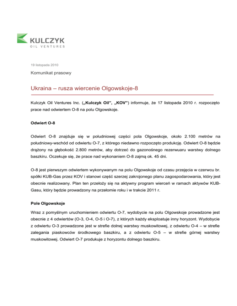 19 listopada 2010 Komunikat prasowy Ukraina – rusza wiercenie Olgowskoje-8 Kulczyk Oil Ventures Inc. („Kulczyk Oil”, „KOV”) informuje, że 17 listopada 2010 r. rozpoczęto prace nad odwiertem O-8 na polu Olgowskoje. Odwiert O-8 Odwiert O-8 znajduje się w południowej części pola Olgowskoje, około 2.100 metrów na południowy-wschód od odwiertu O-7, z którego niedawno rozpoczęto produkcję. Odwiert O-8 będzie drążony na głębokość 2.800 metrów, aby dotrzeć do gazonośnego rezerwuaru warstwy dolnego baszkiru. Oczekuje się, że prace nad wykonaniem O-8 zajmą ok. 45 dni. O-8 jest pierwszym odwiertem wykonywanym na polu Olgowskoje od czasu przejęcia w czerwcu br. spółki KUB-Gas przez KOV i stanowi część szerzej zakrojonego planu zagospodarowania, który jest obecnie realizowany. Plan ten przełoży się na aktywny program wierceń w ramach aktywów KUBGasu, który będzie prowadzony na przełomie roku i w trakcie 2011 r. Pole Olgowskoje Wraz z pomyślnym uruchomieniem odwiertu O-7, wydobycie na polu Olgowskoje prowadzone jest obecnie z 4 odwiertów (O-3, O-4, O-5 i O-7), z których każdy eksploatuje inny horyzont. Wydobycie z odwiertu O-3 prowadzone jest w strefie dolnej warstwy muskowitowej, z odwiertu O-4 – w strefie zalegania piaskowców środkowego baszkiru, a z odwiertu O-5 – w strefie górnej warstwy muskowitowej. Odwiert O-7 produkuje z horyzontu dolnego baszkiru. Kulczyk Oil jest bardzo zadowolona z wyników prac w obrębie aktywów KUB-Gas, prowadzonych od czasu przejęcia tej spółki w czerwcu br. Program prac na rok 2011, który będzie realizowany w ciągu najbliższych kilku miesięcy przez wspieraną przez pracowników KOV spółkę KUB-Gas, koncentruje się głównie na wszechstronnym i efektywnym wydobyciu z pól Olgowskoje i Makiejewskoje. Odbywać się to będzie poprzez wykonanie nowych odwiertów, wydobycie z nowych horyzontów poprzez istniejące odwierty, eksploatację z dwóch horyzontów, stymulację wydobycia z zastosowaniem nowoczesnych, zaawansowanych technicznie metod, stosowanych powszechnie w innych regionach świata, a także poprzez skuteczną realizację strategii kompresji. Aktywa Kulczyk Oil Kulczyk Oil to międzynarodowa spółka prowadząca poszukiwania ropy naftowej i gazu. Posiada zdywersyfikowane portfolio projektów w Brunei, Syrii i Ukrainie oraz profil ryzyka obejmujący działalność poszukiwawczą w Brunei i Syrii oraz działalność wydobywczą w Ukrainie. W Brunei KOV posiada udziały w prawie użytkowania górniczego, przyznanego mu zgodnie z dwoma umowami o podziale wpływów z wydobycia, uprawniającą do poszukiwania i wytwarzania ropy i gazu ziemnego z Bloku L i Bloku M. KOV posiada 40 proc. udział w Bloku L, obejmującym obszar lądowy i morski o powierzchni 2 220 km2 (550.000 akrów) w północnym Brunei oraz 36 proc. udział w Bloku M, obejmującym obszar lądowy o powierzchni 3.011 km2 (744.000 akrów) w południowym Brunei. Na Ukrainie KOV posiada faktyczny 70 proc. udział w KUB-Gas LLC. Aktywa KUB-Gas obejmują 100-procentowe udziały w czterech koncesjach zlokalizowanych w pobliżu Ługańska, miasta w północnowschodniej części Ukrainy. W Syrii KOV posiada, zgodnie z umową o podziale wpływów z wydobycia, 100 procentowy udział w Bloku 9 uprawniający do poszukiwania i wydobycia, po spełnieniu okreslonych warunków, ropy i gazu ziemnego w obszarze Bloku 9 o powierzchni 10.032 km2, położonego w północno-zachodniej Syrii. Spółka podpisała porozumienie, na podstawie którego przepisze łącznie 55 proc. udziałów na rzecz osoby trzeciej, pod warunkiem uzyskania zgody władz syryjskich. W przypadku uzyskania takiej zgody bezpośredni udział KOV w Bloku 9 zmieni się na 45 proc. Wiodący akcjonariusz spółki, Kulczyk Investments S.A., zwiększył swoje zaangażowanie poprzez udział w IPO spółki na Giełdzie Papierów Wartościowych w Warszawie w maju 2010 r. i konwersję skryptu dłużnego i posiada obecnie niemal 50 procent udziału w kapitale spółki. Kulczyk Investments S.A. jest międzynarodowym domem inwestycyjnym, założonym przez polskiego przedsiębiorcę dr. Jana Kulczyka. Więcej informacji można uzyskać odwiedzając witrynę internetową Kulczyk Oil (www.kulczykoilventures.com) lub kontaktując się z: Kulczyk Oil Ventures Inc. – Kanada Norman W. Holton Vice Chairman Tel: +1-403-264-8877 E-mail:[email protected] www.kulczykoilventures.com Kulczyk Oil Ventures Inc. –Polska Jakub Korczak Wiceprezes ds. Relacji Inwestorskich Dyrektor Operacji w Europie Środkowo-Wschodniej Tel.: +48 22 414 21 00 E-mail: [email protected] www.kulczykoil.com Tłumaczenie: Niniejszy tekst stanowi tłumaczenie informacji prasowej powstałej oryginalnie w języku angielskim. Stwierdzenia dotyczące przyszłości (Forward-looking Statements): Niniejsza informacja prasowa zawiera stwierdzenia dotyczące zdarzeń, które mają nastąpić po publikacji niniejszej informacji, odnoszące się do przyszłych działań spółki KUB-Gas oraz do jej czterech bloków koncesyjnych (Wiergunskoje, Krutogorowskoje, Makiejewskoje i Olgowskoje) na Ukrainie, które nie stanowią danych historycznych. Mimo że przedstawiciele Spółki uznają założenia zawarte w stwierdzeniach dotyczących przyszłości za racjonalne, potencjalne wyniki sugerowane w powyższych stwierdzeniach odznaczają się znacznym poziomem ryzyka i niepewności, i nie można stwierdzić, że faktyczne rezultaty okażą się zgodne z powyższymi stwierdzeniami dotyczącymi przyszłości. Do czynników, które mogą uniemożliwić bądź utrudnić ukończenie spodziewanych działań Spółki, zaliczają się: prawdopodobieństwo wystąpienia problemów technicznych i mechanicznych w trakcie realizacji projektów, zmiany cen produktów, nieuzyskanie wymaganych prawem zgód, sytuacja finansowa na rynku lokalnym i międzynarodowym, jak również ryzyka związane z ropą naftową i gazem, ryzyka finansowe, polityczne i gospodarcze oraz 