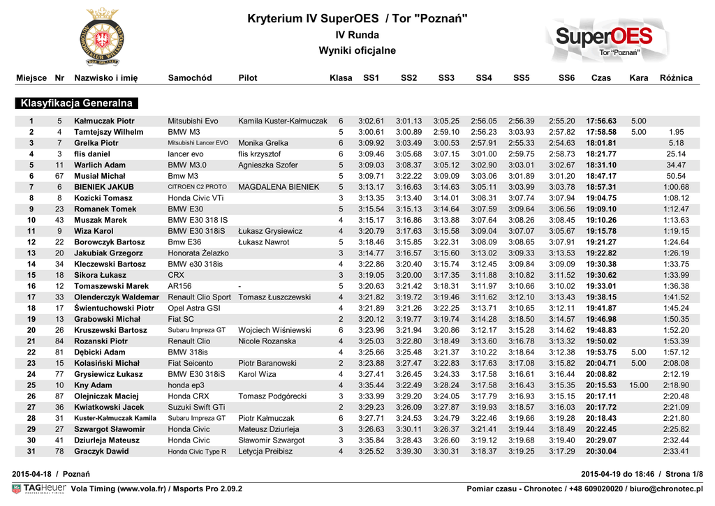 Kryterium IV SuperOES / Tor "Poznań" IV Runda Wyniki oficjalne Miejsce Nr Nazwisko i imię Samochód Pilot Kałmuczak Piotr Tamtejszy Wilhelm Grelka Piotr flis daniel Warlich Adam Musiał Michał BIENIEK JAKUB Kozicki Tomasz Romanek Tomek Muszak Marek Wiza Karol Borowczyk Bartosz Jakubiak Grzegorz Kleczewski Bartosz Sikora Łukasz Tomaszewski Marek Olenderczyk Waldemar Świentuchowski Piotr Grabowski Michał Kruszewski Bartosz Rozanski Piotr Dębicki Adam Kolasiński Michał Grysiewicz Łukasz Kny Adam Olejniczak Maciej Kwiatkowski Jacek Mitsubishi Evo BMW M3 Kamila Kuster-Kałmuczak Mitsubishi Lancer EVO Monika Grelka flis krzysztof Agnieszka Szofer Kuster-Kałmuczak Kamila Subaru Impreza GT Szwargot Sławomir Dziurleja Mateusz Graczyk Dawid Honda Civic Honda Civic Klasa SS1 SS2 SS3 SS4 SS5 6 5 6 6 5 5 5 3 5 4 4 5 3 4 3 5 4 4 2 6 4 4 2 4 4 3 2 6 3 3 4 3:02.61 3:00.61 3:09.92 3:09.46 3:09.03 3:09.71 3:13.17 3:13.35 3:15.54 3:15.17 3:20.79 3:18.46 3:14.77 3:22.86 3:19.05 3:20.63 3:21.82 3:21.89 3:20.12 3:23.96 3:25.03 3:25.66 3:23.88 3:27.41 3:35.44 3:33.99 3:29.23 3:27.71 3:26.63 3:35.84 3:25.52 3:01.13 3:00.89 3:03.49 3:05.68 3:08.37 3:22.22 3:16.63 3:13.40 3:15.13 3:16.86 3:17.63 3:15.85 3:16.57 3:20.40 3:20.00 3:21.42 3:19.72 3:21.26 3:19.77 3:21.94 3:22.80 3:25.48 3:27.47 3:26.45 3:22.49 3:29.20 3:26.09 3:24.53 3:30.11 3:28.43 3:39.30 3:05.25 2:59.10 3:00.53 3:07.15 3:05.12 3:09.09 3:14.63 3:14.01 3:14.64 3:13.88 3:15.58 3:22.31 3:15.60 3:15.74 3:17.35 3:18.31 3:19.46 3:22.25 3:19.74 3:20.86 3:18.49 3:21.37 3:22.83 3:24.33 3:28.24 3:24.05 3:27.87 3:24.79 3:26.37 3:26.60 3:30.31 2:56.05 2:56.23 2:57.91 3:01.00 3:02.90 3:03.06 3:05.11 3:08.31 3:07.59 3:07.64 3:09.04 3:08.09 3:13.02 3:12.45 3:11.88 3:11.97 3:11.62 3:13.71 3:14.28 3:12.17 3:13.60 3:10.22 3:17.63 3:17.58 3:17.58 3:17.79 3:19.93 3:22.46 3:21.41 3:19.12 3:18.37 2:56.39 3:03.93 2:55.33 2:59.75 3:03.01 3:01.89 3:03.99 3:07.74 3:09.64 3:08.26 3:07.07 3:08.65 3:09.33 3:09.84 3:10.82 3:10.66 3:12.10 3:10.65 3:18.50 3:15.28 3:16.78 3:18.64 3:17.08 3:16.61 3:16.43 3:16.93 3:18.57 3:19.66 3:19.44 3:19.68 3:19.25 SS6 Czas Kara 17:56.63 17:58.58 18:01.81 18:21.77 18:31.10 18:47.17 18:57.31 19:04.75 19:09.10 19:10.26 19:15.78 19:21.27 19:22.82 19:30.38 19:30.62 19:33.01 19:38.15 19:41.87 19:46.98 19:48.83 19:50.02 19:53.75 20:04.71 20:08.82 20:15.53 20:17.11 20:17.72 20:18.43 20:22.45 20:29.07 20:30.04 5.00 5.00 Różnica Klasyfikacja Generalna 1 2 3 4 5 6 7 8 9 10 11 12 13 14 15 16 17 18 19 20 21 22 23 24 25 26 27 28 29 30 31 5 4 7 3 11 67 6 8 23 43 9 22 20 34 18 12 33 17 13 26 84 81 15 77 10 87 36 31 27 41 78 lancer evo BMW M3.0 Bmw M3 CITROEN C2 PROTO Honda Civic VTi BMW E30 BMW E30 318 IS BMW E30 318iS Bmw E36 Honorata Żelazko BMW e30 318is CRX AR156 Renault Clio Sport Opel Astra GSI Fiat SC Subaru Impreza GT Renault Clio BMW 318is Fiat Seicento BMW E30 318iS honda ep3 Honda CRX Suzuki Swift GTi Honda Civic Type R MAGDALENA BIENIEK Łukasz Grysiewicz Łukasz Nawrot Tomasz Łuszczewski Wojciech Wiśniewski Nicole Rozanska Piotr Baranowski Karol Wiza Tomasz Podgórecki Piotr Kałmuczak Mateusz Dziurleja Sławomir Szwargot Letycja Preibisz 2015-04-18 / Poznań Vola Timing (www.vola.fr) / Msports Pro 2.09.2 2:55.20 2:57.82 2:54.63 2:58.73 3:02.67 3:01.20 3:03.78 3:07.94 3:06.56 3:08.45 3:05.67 3:07.91 3:13.53 3:09.09 3:11.52 3:10.02 3:13.43 3:12.11 3:14.57 3:14.62 3:13.32 3:12.38 3:15.82 3:16.44 3:15.35 3:15.15 3:16.03 3:19.28 3:18.49 3:19.40 3:17.29 5.00 5.00 15.00 1.95 5.18 25.14 34.47 50.54 1:00.68 1:08.12 1:12.47 1:13.63 1:19.15 1:24.64 1:26.19 1:33.75 1:33.99 1:36.38 1:41.52 1:45.24 1:50.35 1:52.20 1:53.39 1:57.12 2:08.08 2:12.19 2:18.90 2:20.48 2:21.09 2:21.80 2:25.82 2:32.44 2:33.41 2015-04-19 do 18:46 / Strona 1/8 Pomiar czasu - Chronotec / +48 609020020 / VolaSoftControlPdf [email protected] Kryterium IV SuperOES / Tor "Poznań" IV Runda Wyniki oficjalne Miejsce Nr 32 33 34 35 36 37 38 39 40 41 42 43 44 45 46 47 48 49 50 51 52 53 54 55 56 57 58 59 60 61 62 63 64 65 69 32 40 93 35 25 46 94 89 29 68 85 75 79 45 51 74 91 52 70 53 49 61 95 58 88 38 50 63 59 57 60 64 65 Nazwisko i imię Samochód Kaczmarek Bartosz Wójtowicz Jarek Wojciechowski Tomasz Krzyś Grzegorz Nykowski Maciej Naspiński Krystian Gradys Agata Kaczmarek Łukasz Grzelka Bartosz Wojtas Sergiusz Gorlak Jacek Borzyński Damian Rozanska Nicole Hańćkowiak Maciej Chojnacki Jakub Śmiglak Marek kulikowski roman Kędzierawski Remigiusz Schedler Tomasz Plenzler Grzegorz Mróz Mikołaj Kęsy Kamil Czajka Jakub Matys Bartosz Żukow Lucjan Radziemski Maciej Nowicki Darek Grześkowiak Łukasz Sosnowski Michał Bocheński Krzysztof Szumiłowski Sebastian Hornung Piotr Szkarapata Wiktor Nowak Damian Subaru Impreza WRX Bartosz Jerzy BMW e36 Fiat SC Suzuki Swift Fiat Seicento BMW e36 BMW e36 Honda Civic Honda CRX Opel Astra GSI Subaru Impreza Suzuki Swift Renault Clio Honda CRX Fiat SC Fiat SC honda type r Fiat Seicento Fiat UNO Alfa Romeo 147 Fiat Uno Pilot Magdalena Gradys Andrzej Borowski Damian Borzyński Łukasz Karło Magdalena Gradys Maciej Hańćkowiak Bartosz Kaczmarek Piotr Rozanski Bartek Grzelka Anna Śmiglak Bartłomiej Łuczak Michał Sosnowski Karol Karwacki Łukasz Grześkowiak Opel Corsa Traktorek Michał Rogaczewski Fiat SC Mateusz Łuczak Kia Picanto Darek Nowicki BMW E36 318is Adam Piechociński Mitsubishi Colt Michał Wajer Kia Picanto Bartek Matys Fiat Seicento Mikołaj Mróz Fiat UNO Tomasz Schedler Ford KA Piotr Wawrzyniak Lexus IS200 Paulina Rękoś Peugeot 205 Junior Kinga Lihs Suzuki Swift Oskar Sadowski Bmw 320i Maciej Szkudlarek 2015-04-18 / Poznań Vola Timing (www.vola.fr) / Msports Pro 2.09.2 Klasa SS1 SS2 SS3 SS4 SS5 6 5 2 2 2 5 5 3 3 4 6 2 4 3 2 2 4 2 3 5 3 5 2 1 4 3 1 2 3 2 4 1 1 4 3:34.40 3:27.70 3:32.88 3:32.06 3:35.15 3:31.39 3:35.09 3:53.16 3:40.68 3:38.50 3:42.75 3:52.45 3:45.36 3:48.78 3:26.87 3:44.10 3:54.72 3:44.69 3:46.16 3:46.10 3:52.46 4:02.39 3:47.26 3:55.42 3:42.21 3:55.46 3:58.85 3:54.60 3:52.19 3:51.10 3:49.24 3:54.85 3:56.