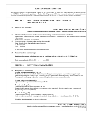 KARTA CHARAKTERYSTYKI Sporządzona zgodnie z Rozporządzeniem Komisji nr 453/2010 z dnia 20 maja 2010 roku zmieniającym Rozporządzenie nr 1907/2006 Parlamentu Europejskiego i Rady z dnia 18 grudnia 2006 roku w sprawie rejestracji, oceny, udzielania zezwoleń i stosowanych ograniczeń w zakresie chemikaliów (REACH) (DU UE seria L nr 133 z 31maja 2010 roku) SEKCJA 1: IDENTYFIKACJA MIESZANINY I IDENTYFIKACJA PRZEDSIĘBIORSTWA ___________________________________________________________________________________________________ 1.1 Identyfikator produktu NOVI PRO PIANKA MONTAŻOWA Zawiera: Polimetylenopolifenyloizocyjanian, izomery i homologi, polimer - nr CAS 9016-87-9 1.2 Istotne zidentyfikowane zastosowania mieszaniny oraz zastosowania odradzane Zastosowania zidentyfikowane: Produkt stosowany do uszczelnień i wygłuszania np. przy montażu stolarki okiennej i drzwiowej.. Zastosowania odradzane: nie określono. 1.3 Dane dotyczące dostawcy karty charakterystyki Saint Gobain Dystrybucja Budowlana Sp. z o.o. ul. Avicenny 14, 54-611 Wrocław E- mail osoby odpowiedzialnej za kartę charakterystyki: 1.4 Numer telefonu alarmowego Telefon alarmowy w Polsce (czynny w godzinach 9:00 – 16:00): + 48 71 334 63 00 Data sporządzenia: 25.05.2011 r. rev. 001 __________________________________________________________________________________________________ SEKCJA 2: IDENTYFIKACJA ZAGROŻEŃ __________________________________________________________________________________________________ 2.1 Klasyfikacja mieszaniny Produkt skrajnie łatwo palny (F+, R 12). Produkt może akumulować ładunki elektrostatyczne. Pary produktu są cięższe od powietrza, mogą tworzyć mieszaniny wybuchowe z powietrzem. Gromadzą się przy powierzchni ziemi i w dolnych partiach pomieszczeń. Przy ogrzaniu zamkniętego pojemnika istnieje niebezpieczeństwo rozerwania opakowania. Produkt rakotwórczy kategorii 3. Ograniczone dowody działania rakotwórczego (R 40). Produkt szkodliwy (Xn). Działa szkodliwie przez drogi oddechowe (R 20). Działa szkodliwie przez drogi oddechowe; stwarza poważne zagrożenie dla zdrowia człowieka w następstwie długotrwałego narażenia (R 48/20) Produkt drażniący (Xi). Działa drażniąco na oczy, drogi oddechowe i skórę (R 36/37/38). Może powodować uczulenie w następstwie narażenia drogą oddechową i w kontakcie ze skórą (R 42/43). Szkodliwe skutki działania na zdrowie człowieka: ___________________________________________________________________________________________________ NOVI PRO PIANKA MONTAŻOWA Zawiera: Polimetylenopolifenyloizocyjanian, izomery i homologi, polimer - nr CAS 9016-87-9 Strona 1 z 12 KARTA CHARAKTERYSTYKI Sporządzona zgodnie z Rozporządzeniem Komisji nr 453/2010 z dnia 20 maja 2010 roku zmieniającym Rozporządzenie nr 1907/2006 Parlamentu Europejskiego i Rady z dnia 18 grudnia 2006 roku w sprawie rejestracji, oceny, udzielania zezwoleń i stosowanych ograniczeń w zakresie chemikaliów (REACH) (DU UE seria L nr 133 z 31maja 2010 roku) Przy znacznych stężeniach par lub bezpośrednim dostaniu się produktu do oczu może wystąpić podrażnienie, zaczerwienienie, łzawienie, pieczenie, zapalenie spojówek. Skażenie skóry dużą ilością produktu może powodować zaczerwienienie, swędzenie i wysuszanie skóry. U osób uczulonych może wystąpić silna reakcja alergiczna nawet na bardzo małe ilości produktu. Wdychanie par o dużym stężeniu może spowodować uczucie zmęczenia, osłabienie, senność, nudności, bóle i zawroty głowy, ból gardła. Powtarzający się kontakt z parami produktu może powodować reakcje uczuleniowe dróg oddechowych (obrzęk, chrypka, uczucie duszenia się, kaszel). Po spożyciu może dojść do uszkodzenia śluzówki przewodu pokarmowego, nudności, wymiotów i biegunki. Skutki działania na środowisko: Nie stwarza zagrożenia dla środowiska wodnego (patrz sekcja 12). Skutki działania związane z właściwościami fizykochemicznymi: Pary produktu są cięższe od powietrza, mogą tworzyć mieszaniny wybuchowe z powietrzem. Gromadzą się przy powierzchni ziemi i w dolnych partiach pomieszczeń. Zbiorniki narażone na działanie ognia lub wysokiej temperatury mogą eksplodować. 2.2 Elementy oznakowania ZNAK F+ Xn skrajnie łatwo palny szkodliwy Zwroty wskazujące rodzaj zagrożenia: R 40 R 20 R 42/43 R 48/20 R 36/37/38 Zwroty określające warunki bezpiecznego stosowania: S 23 S 36/37 S 45 S 51 S 63 Ograniczone dowody działania rakotwórczego; Działa szkodliwie przez drogi oddechowe. Może powodować uczulenie w następstwie narażenia drogą oddechową i w kontakcie ze skórą; Działa szkodliwie przez drogi oddechowe; stwarza poważne zagrożenie dla zdrowia człowieka w następstwie długotrwałego narażenia Działa drażniąco na oczy, drogi oddechowe i skórę. Nie wdychać pary/rozpylonej cieczy. Nosić odpowiednią odzież ochronną i odpowiednie rękawice ochronne. W przypadku awarii lub jeżeli źle się poczujesz, niezwłocznie zasięgnij porady lekarza – jeżeli to możliwe, pokaż etykietę; Stosować wyłącznie w dobrze wentylowanych pomieszczeniach; W przypadku zatrucia drogą oddechową wyprowadzić lub wynieść poszkodowanego na świeże powietrze i zapewnić warunki do odpoczynku. Zawiera: Polimetylenopolifenyloizocyjanian, izomery i homologi ___________________________________________________________________________________________________ NOVI PRO PIANKA MONTAŻOWA Zawiera: Polimetylenopolifenyloizocyjanian, izomery i homologi, polimer - nr CAS 9016-87-9 Strona 2 z 12 KARTA CHARAKTERYSTYKI Sporządzona zgodnie z Rozporządzeniem Komisji nr 453/2010 z dnia 20 maja 2010 roku zmieniającym Rozporządzenie nr 1907/2006 Parlamentu Europejskiego i Rady z dnia 18 grudnia 2006 roku w sprawie rejestracji, oceny, udzielania zezwoleń i stosowanych ograniczeń w zakresie chemikaliów (REACH) (DU UE seria L nr 133 z 31maja 2010 roku) Zawiera izocyjaniany. Zapoznaj się z instrukcją dostarczoną pr