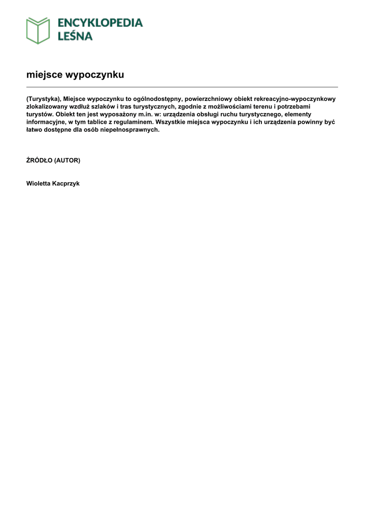miejsce wypoczynku (Turystyka), Miejsce wypoczynku to ogólnodostępny, powierzchniowy obiekt rekreacyjno-wypoczynkowy zlokalizowany wzdłuż szlaków i tras turystycznych, zgodnie z możliwościami terenu i potrzebami turystów. Obiekt ten jest wyposażony m.in. w: urządzenia obsługi ruchu turystycznego, elementy informacyjne, w tym tablice z regulaminem. Wszystkie miejsca wypoczynku i ich urządzenia powinny być łatwo dostępne dla osób niepełnosprawnych. ŹRÓDŁO (AUTOR) Wioletta Kacprzyk