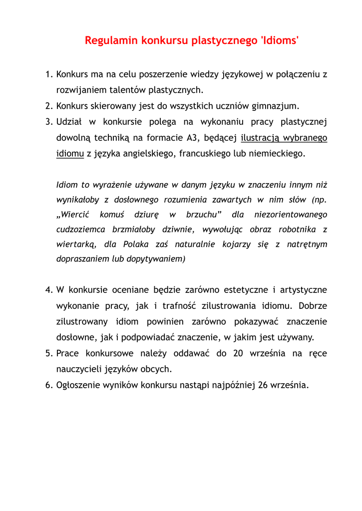 Regulamin konkursu plastycznego 'Idioms' 1. Konkurs ma na celu poszerzenie wiedzy językowej w połączeniu z rozwijaniem talentów plastycznych. 2. Konkurs skierowany jest do wszystkich uczniów gimnazjum. 3. Udział w konkursie polega na wykonaniu pracy plastycznej dowolną techniką na formacie A3, będącej ilustracją wybranego idiomu z języka angielskiego, francuskiego lub niemieckiego. Idiom to wyrażenie używane w danym języku w znaczeniu innym niż wynikałoby z dosłownego rozumienia zawartych w nim słów (np. „Wiercić komuś dziurę w brzuchu” dla niezorientowanego cudzoziemca brzmiałoby dziwnie, wywołując obraz robotnika z wiertarką, dla Polaka zaś naturalnie kojarzy się z natrętnym dopraszaniem lub dopytywaniem) 4. W konkursie oceniane będzie zarówno estetyczne i artystyczne wykonanie pracy, jak i trafność zilustrowania idiomu. Dobrze zilustrowany idiom powinien zarówno pokazywać znaczenie dosłowne, jak i podpowiadać znaczenie, w jakim jest używany. 5. Prace konkursowe należy oddawać do 20 września na ręce nauczycieli języków obcych. 6. Ogłoszenie wyników konkursu nastąpi najpóźniej 26 września. Regulamin konkursu na film reklamowy 1. Konkurs ma na celu promocję języków obcych oraz pobudzenie kreatywności uczniów. 2. Konkurs skierowany jest do wszystkich uczniów gimnazjum. 3. Udział w konkursie polega na przygotowaniu 3-minutowego filmu reklamującego naukę lub/i znajomość języków obcych. 4. Technika filmowa jest dowolna. Praca konkursowa może być filmem animowanym. 5. Uczestnikiem konkursu może być pojedynczy uczeń lub zespół aktorsko-reżyserski liczący maksymalnie 10 osób. 6. Jury oceniać będzie artystyczną i techniczną wartość filmu oraz skuteczność przekazu reklamowego. 7. Prace konkursowe należy oddawać do 20 września na ręce nauczycieli języków obcych na nośnikach cyfrowych takich jak pendrive lub CD. Można też udostępnić pracę konkursową nauczycielowi języka obcego na dysku Google. 8. Ogłoszenie wyników konkursu nastąpi nie później niż 26 września. W tym dniu również zostaną zaprezentowane zwycięskie prace. Quiz wiedzy o krajach anglo-, niemiecko- i francuskojęzycznych Quiz odbędzie się dnia 26 września 2016 r. na Sali Teatralnej w Gimnazjum, przy udziale wszystkich klas. Daną klasę może reprezentować 3-osobowa drużyna.