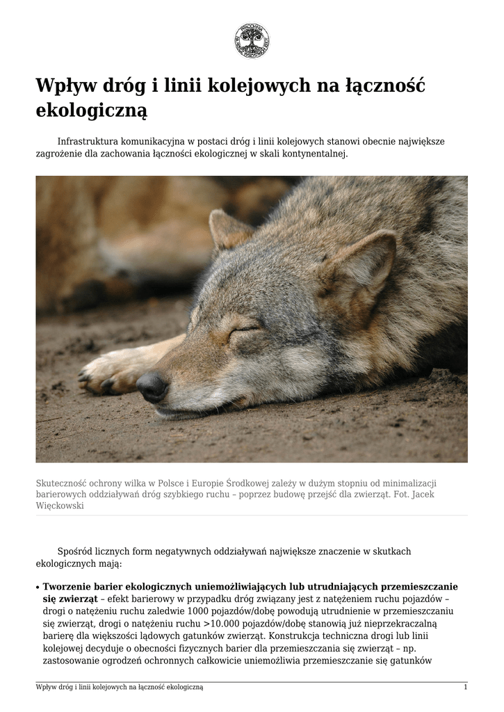 Wpływ dróg i linii kolejowych na łączność ekologiczną Infrastruktura komunikacyjna w postaci dróg i linii kolejowych stanowi obecnie największe zagrożenie dla zachowania łączności ekologicznej w skali kontynentalnej. Skuteczność ochrony wilka w Polsce i Europie Środkowej zależy w dużym stopniu od minimalizacji barierowych oddziaływań dróg szybkiego ruchu – poprzez budowę przejść dla zwierząt. Fot. Jacek Więckowski Spośród licznych form negatywnych oddziaływań największe znaczenie w skutkach ekologicznych mają: ● Tworzenie barier ekologicznych uniemożliwiających lub utrudniających przemieszczanie się zwierząt – efekt barierowy w przypadku dróg związany jest z natężeniem ruchu pojazdów – drogi o natężeniu ruchu zaledwie 1000 pojazdów/dobę powodują utrudnienie w przemieszczaniu się zwierząt, drogi o natężeniu ruchu >10.000 pojazdów/dobę stanowią już nieprzekraczalną barierę dla większości lądowych gatunków zwierząt. Konstrukcja techniczna drogi lub linii kolejowej decyduje o obecności fizycznych barier dla przemieszczania się zwierząt – np. zastosowanie ogrodzeń ochronnych całkowicie uniemożliwia przemieszczanie się gatunków Wpływ dróg i linii kolejowych na łączność ekologiczną 1 ● ● naziemnych, a prowadzenie dróg/linii kolejowych w nasypach i wykopach znacznie je utrudnia. W efekcie istnienia barier ekologicznych następuje izolacja populacji i siedlisk, ograniczenie możliwości wykorzystania areałów osobniczych (do zdobywania pożywienia, szukania schronienia, dostępu do miejsc rozrodu). Z powodu zahamowania lub ograniczenia migracji i wędrówek gatunki nie mogą kolonizować nowych siedlisk, ograniczony zostaje zasięg przepływu genów, obniżeniu ulega zmienność genetyczna lokalnych populacji, co prowadzi do ich osłabienia i stopniowego wymierania. Utrata i degradacja siedlisk – siedliska przyrodnicze ulegają całkowitemu zniszczeniu w obszarze przebiegu dróg i linii kolejowych oraz w miejscach lokalizacji towarzyszącej im infrastruktury i instalacji. Ze względu na wysoki poziom emisji fizykochemicznych związanych z ruchem pojazdów zasięg oddziaływania infrastruktury znacząco wykracza poza obszar zajęty przez drogę lub linię kolejową. Emisje akustyczne, świetlne, chemiczne oraz zmiany stosunków wodnych powodują degradacje siedlisk flory i fauny nawet w odległości > 500 m od źródła. Budowa dróg powoduje dodatkowo szereg negatywnych oddziaływań na siedliska przyrodnicze o charakterze wtórnym, takich jak: rozwój zabudowy kubaturowej (przemysłowej, usługowo-handlowej) wzdłuż nowych traktów, poprawa dostępności terenu i wzrost penetracji obszarów cennych przyrodniczo przez ludzi. Zabijanie zwierząt gatunków dzikich i domowych w wyniku wypadków i kolizji – śmiertelność zwierząt na drogach zależy przede wszystkim od obecności ogrodzeń ochronnych i ich parametrów, natężenia ruchu pojazdów oraz charakteru obszarów przecinanych przez drogę. W przypadku linii kolejowych, oprócz prędkości i natężenia ruchu pociągów, wpływ na liczbę kolizji ma dodatkowo rodzaj użytkowanego taboru – lekkie pojazdy szynowe są przez zwierzęta zwykle trudniej i później dostrzegane. Najczęstsze ofiary kolizji to płazy, ptaki, małe i średnie ssaki leśne i polno-leśne, rzadziej giną duże ssaki kopytne i drapieżne. Śmiertelność zwierząt zmienia się sezonowo – najwyższa jest zwykle w okresie nasilonych migracji wiosennych i jesiennych oraz dobowo – większość wypadków zdarza się przy zapadającym zmroku i w nocy. Wpływ dróg i linii kolejowych na łączność ekologiczną 2