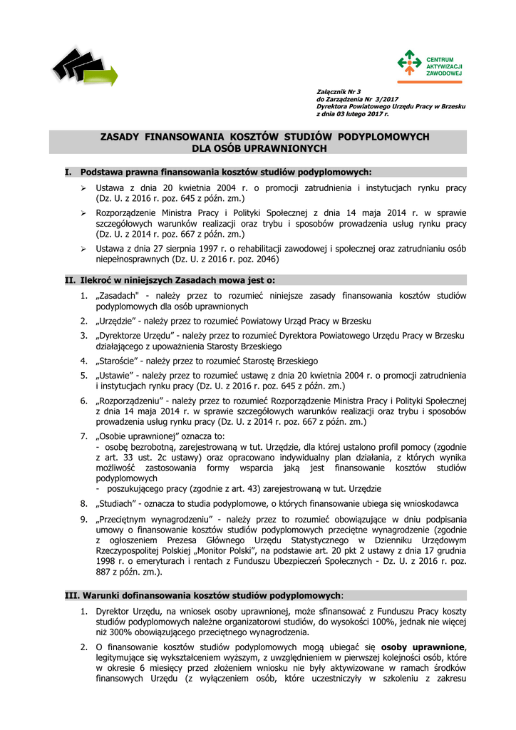 Załącznik Nr 3 do Zarządzenia Nr 3/2017 Dyrektora Powiatowego Urzędu Pracy w Brzesku z dnia 03 lutego 2017 r. ZASADY FINANSOWANIA KOSZTÓW STUDIÓW PODYPLOMOWYCH DLA OSÓB UPRAWNIONYCH I. Podstawa prawna finansowania kosztów studiów podyplomowych: ➢ Ustawa z dnia 20 kwietnia 2004 r. o promocji zatrudnienia i instytucjach rynku pracy (Dz. U. z 2016 r. poz. 645 z późn. zm.) ➢ Rozporządzenie Ministra Pracy i Polityki Społecznej z dnia 14 maja 2014 r. w sprawie szczegółowych warunków realizacji oraz trybu i sposobów prowadzenia usług rynku pracy (Dz. U. z 2014 r. poz. 667 z późn. zm.) ➢ Ustawa z dnia 27 sierpnia 1997 r. o rehabilitacji zawodowej i społecznej oraz zatrudnianiu osób niepełnosprawnych (Dz. U. z 2016 r. poz. 2046) II. Ilekroć w niniejszych Zasadach mowa jest o: 1. „Zasadach" - należy przez to rozumieć niniejsze zasady finansowania kosztów studiów podyplomowych dla osób uprawnionych 2. „Urzędzie” - należy przez to rozumieć Powiatowy Urząd Pracy w Brzesku 3. „Dyrektorze Urzędu” - należy przez to rozumieć Dyrektora Powiatowego Urzędu Pracy w Brzesku działającego z upoważnienia Starosty Brzeskiego 4. „Staroście” - należy przez to rozumieć Starostę Brzeskiego 5. „Ustawie” - należy przez to rozumieć ustawę z dnia 20 kwietnia 2004 r. o promocji zatrudnienia i instytucjach rynku pracy (Dz. U. z 2016 r. poz. 645 z późn. zm.) 6. „Rozporządzeniu” - należy przez to rozumieć Rozporządzenie Ministra Pracy i Polityki Społecznej z dnia 14 maja 2014 r. w sprawie szczegółowych warunków realizacji oraz trybu i sposobów prowadzenia usług rynku pracy (Dz. U. z 2014 r. poz. 667 z późn. zm.) 7. „Osobie uprawnionej” oznacza to: - osobę bezrobotną, zarejestrowaną w tut. Urzędzie, dla której ustalono profil pomocy (zgodnie z art. 33 ust. 2c ustawy) oraz opracowano indywidualny plan działania, z których wynika możliwość zastosowania formy wsparcia jaką jest finansowanie kosztów studiów podyplomowych - poszukującego pracy (zgodnie z art. 43) zarejestrowaną w tut. Urzędzie 8. „Studiach” - oznacza to studia podyplomowe, o których finansowanie ubiega się wnioskodawca 9. „Przeciętnym wynagrodzeniu” - należy przez to rozumieć obowiązujące w dniu podpisania umowy o finansowanie kosztów studiów podyplomowych przeciętne wynagrodzenie (zgodnie z ogłoszeniem Prezesa Głównego Urzędu Statystycznego w Dzienniku Urzędowym Rzeczypospolitej Polskiej „Monitor Polski”, na podstawie art. 20 pkt 2 ustawy z dnia 17 grudnia 1998 r. o emeryturach i rentach z Funduszu Ubezpieczeń Społecznych - Dz. U. z 2016 r. poz. 887 z późn. zm.). III. Warunki dofinansowania kosztów studiów podyplomowych: 1. Dyrektor Urzędu, na wniosek osoby uprawnionej, może sfinansować z Funduszu Pracy koszty studiów podyplomowych należne organizatorowi studiów, do wysokości 100%, jednak nie więcej niż 300% obowiązującego przeciętnego wynagrodzenia. 2. O finansowanie kosztów studiów podyplomowych mogą ubiegać się osoby uprawnione, legitymujące się wykształceniem wyższym, z uwzględnieniem w pierwszej kolejności osób, które w okresie 6 miesięcy przed złożeniem wniosku nie były aktywizowane w ramach środków finansowych Urzędu (z wyłączeniem osób, które uczestniczyły w szkoleniu z zakresu umiejętności poszukiwania pracy), które: • • planują rozpoczęcie studiów lub są w ich trakcie wystąpią z wnioskiem co najmniej miesiąc przed terminem płatności za studia. 3. Wyklucza się możliwość: • • • finansowania kosztów studiów na więcej niż jednym kierunku finansowania zaległych kosztów należnych za studia refundacji kosztów już poniesionych przez wnioskodawcę. IV. Tryb składania i rozpatrywania wniosków: 1. Osoba uprawniona ubiegająca się o sfinansowanie kosztów studiów podyplomowych składa stosowny wniosek wraz z wymaganym załącznikiem. 2. Obowiązujący druk wniosku o sfinansowanie kosztów studiów podyplomowych dostępny jest u specjalistów ds. rozwoju zawodowego oraz na stronie internetowej Urzędu: www.pup-brzesko.pl, w zakładce „Szkolenia” pn. „Studia podyplomowe”. Wnioski przygotowane przy użyciu innego formularza pozostaną bez rozpatrzenia. 3. Przed przystąpieniem do wypełniania wniosku należy dokładnie zapoznać się z jego treścią, niniejszymi zasadami oraz aktami prawnymi regulującymi finansowanie kosztów studiów podyplomowych ze środków Funduszu Pracy. 4. Wniosek należy wypełnić w sposób czytelny wpisując treść w każde miejsce przeznaczone do uzupełnienia, nie zostawiając pustych pól. Jeżeli poszczególne rubryki nie znajdą w konkretnym przypadku zastosowania, należy wpisać „nie dotyczy”. Wszelkich poprawek należy dokonywać poprzez skreślenie i zaparafowanie. 5. Dla celów ustalenia kwalifikacji i doświadczenia zawodowego Urząd dokona analizy informacji zawartych w "Karcie Rejestracyjnej Osoby Bezrobotnej". W razie braku istotnych informacji w karcie, osoba jest zobowiązana do ich niezwłocznego przedłożenia. 6. Wnioski należy składać w podanych na stronie internetowej oraz w siedzibie Urzędu wyznaczonych terminach, w Sekretariacie Urzędu - pokój Nr 23, II piętro lub przesyłać pocztą tradycyjną (decyduje data wpływu wniosku do Urzędu). Wnioski składane poza wyznaczonymi terminami nie będą podlegały rozpatrzeniu. Fakt terminowego złożenia wniosku oraz kolejność jego złożenia, nie decydują o pozytywnym rozpatrzeniu. 7. Celem uzasadnienia potrzeby sfinansowania kosztów studiów podyplomowych wnioskodawca dodatkowo może do wniosku dołączyć: • uzasadnienie potrzeby ukończenia studiów sporządzone przez pracodawcę • lub uzasadnienie potrzeby ukończenia studiów w związku z planowanym rozpoczęciem działalności gospodarczej. 8. Składany wniosek wraz z załącznikami powinien być trwale spięty. 9. Pracownicy Urzędu, a w szczególności specjaliści ds. rozwo