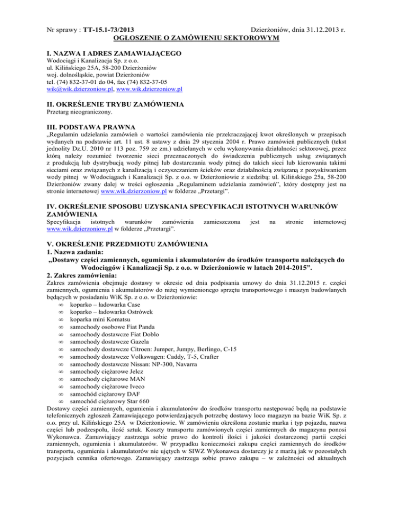 Nr sprawy : TT-15.1-73/2013 Dzierżoniów, dnia 31.12.2013 r. OGŁOSZENIE O ZAMÓWIENIU SEKTOROWYM I. NAZWA I ADRES ZAMAWIAJĄCEGO Wodociągi i Kanalizacja Sp. z o.o. ul. Kilińskiego 25A, 58-200 Dzierżoniów woj. dolnośląskie, powiat Dzierżoniów tel. (74) 832-37-01 do 04, fax (74) 832-37-05 [email protected], www.wik.dzierzoniow.pl II. OKREŚLENIE TRYBU ZAMÓWIENIA Przetarg nieograniczony. III. PODSTAWA PRAWNA „Regulamin udzielania zamówień o wartości zamówienia nie przekraczającej kwot określonych w przepisach wydanych na podstawie art. 11 ust. 8 ustawy z dnia 29 stycznia 2004 r. Prawo zamówień publicznych (tekst jednolity Dz.U. 2010 nr 113 poz. 759 ze zm.) udzielanych w celu wykonywania działalności sektorowej, przez którą należy rozumieć tworzenie sieci przeznaczonych do świadczenia publicznych usług związanych z produkcją lub dystrybucją wody pitnej lub dostarczania wody pitnej do takich sieci lub kierowania takimi sieciami oraz związanych z kanalizacją i oczyszczaniem ścieków oraz działalnością związaną z pozyskiwaniem wody pitnej w Wodociągach i Kanalizacji Sp. z o.o. w Dzierżoniowie z siedzibą: ul. Kilińskiego 25a, 58-200 Dzierżoniów zwany dalej w treści ogłoszenia „Regulaminem udzielania zamówień”, który dostępny jest na stronie internetowej www.wik.dzierzoniow.pl w folderze „Przetargi”. IV. OKREŚLENIE SPOSOBU UZYSKANIA SPECYFIKACJI ISTOTNYCH WARUNKÓW ZAMÓWIENIA Specyfikacja istotnych warunków zamówienia www.wik.dzierzoniow.pl w folderze „Przetargi”. zamieszczona jest na stronie internetowej V. OKREŚLENIE PRZEDMIOTU ZAMÓWIENIA 1. Nazwa zadania: „Dostawy części zamiennych, ogumienia i akumulatorów do środków transportu należących do Wodociągów i Kanalizacji Sp. z o.o. w Dzierżoniowie w latach 2014-2015”. 2. Zakres zamówienia: Zakres zamówienia obejmuje dostawy w okresie od dnia podpisania umowy do dnia 31.12.2015 r. części zamiennych, ogumienia i akumulatorów do niżej wymienionego sprzętu transportowego i maszyn budowlanych będących w posiadaniu WiK Sp. z o.o. w Dzierżoniowie: • koparko – ładowarka Case • koparko – ładowarka Ostrówek • koparka mini Komatsu • samochody osobowe Fiat Panda • samochody dostawcze Fiat Doblo • samochody dostawcze Gazela • samochody dostawcze Citroen: Jumper, Jumpy, Berlingo, C-15 • samochody dostawcze Volkswagen: Caddy, T-5, Crafter • samochody dostawcze Nissan: NP-300, Navarra • samochody ciężarowe Jelcz • samochody ciężarowe MAN • samochody ciężarowe Iveco • samochód ciężarowy DAF • samochód ciężarowy Star 660 Dostawy części zamiennych, ogumienia i akumulatorów do środków transportu następować będą na podstawie telefonicznych zgłoszeń Zamawiającego potwierdzających potrzebę dostawy loco magazyn na bazie WiK Sp. z o.o. przy ul. Kilińskiego 25A w Dzierżoniowie. W zamówieniu określona zostanie marka i typ pojazdu, nazwa części lub podzespołu, ilość sztuk. Koszty transportu zamówionych części zamiennych do magazynu ponosi Wykonawca. Zamawiający zastrzega sobie prawo do kontroli ilości i jakości dostarczonej partii części zamiennych, ogumienia i akumulatorów. W przypadku konieczności zakupu części zamiennych do środków transportu, ogumienia i akumulatorów nie ujętych w SIWZ Wykonawca dostarczy je z marżą jak w pozostałych pozycjach cennika ofertowego. Zamawiający zastrzega sobie prawo zakupu – w zależności od aktualnych potrzeb - większej lub mniejszej ilości części zamiennych do środków transportu po cenach jednostkowych ustalonych w wyniku przetargu. Wyszczególnienie niektórych części zamiennych, ogumienia i akumulatorów do środków transportu i urządzeń wraz z orientacyjną ilością zapotrzebowania zawarte jest w SIWZ. VI. OPIS CZĘŚCI ZAMÓWIENIA, JEŻELI ZAMAWIAJĄCY DOPUSZCZA SKŁADANIE OFERT CZĘŚCIOWYCH. Zamawiający nie dopuszcza składania ofert częściowych. VII. INFORMACJA O MOŻLIWOŚCI ZŁOŻENIA OFERTY WARIANTOWEJ Zamawiający nie dopuszcza składania ofert wariantowych. Oferta alternatywna (wariantowa) nie będzie brana pod uwagę i zostanie odrzucona wraz z ofertą podstawową. VIII. TERMIN WYKONANIA ZAMÓWIENIA Wymagany termin realizacji zamówienia: sukcesywne (w miarę potrzeb) dostawy części zamiennych, ogumienia i akumulatorów w okresie od dnia podpisania umowy do dnia 31.12.2015 r. Wymagany termin dostawy zamówionej partii części zamiennych, ogumienia i akumulatorów: do 2 dni licząc od daty telefonicznego zgłoszenia zapotrzebowania przez Zamawiającego. IX. OPIS WARUNKÓW UDZIAŁU W POSTĘPOWANIU DOKONYWANIA OCENY SPEŁNIANIA TYCH WARUNKÓW ORAZ SPOSOBU W przetargu mogą wziąć udział Wykonawcy uprawnieni do występowania w obrocie prawnym, spełniający warunki zawarte w rozdziale IV ust. 4.1 „Regulaminu udzielania zamówień” oraz inne warunki określone w Specyfikacji istotnych warunków zamówienia. X. WYMAGANIA DOTYCZĄCE WADIUM Warunkiem udziału w postępowaniu jest wpłacenie wadium o wartości 1 500,00 zł (słownie: tysiąc pięćset zł). XI. KRYTERIA OCENY OFERT I ICH ZNACZENIE • Cena – 100% XII. MIEJSCE I TERMIN SKŁADANIA I OTWARCIA OFERT Oferty w zamkniętej kopercie z napisem: „Wodociągi i Kanalizacja Spółka z o.o., ul. Kilińskiego 25A, 58-200 Dzierżoniów. Oferta przetargowa – „Dostawy części zamiennych, ogumienia i akumulatorów do środków transportu należących do Wodociągów i Kanalizacji Sp. z o.o. w Dzierżoniowie w latach 2014-2015”. Nie otwierać przed dniem 15.01.2014 r. godz. 1000” należy składać w Sekretariacie WiK Spółki z o.o. przy ul. Kilińskiego 25A w Dzierżoniowie w terminie do dnia 15.01.2014 r. do godz.930. Otwarcie ofert nastąpi w dniu 15.01.2014 r. o godz. 1000 w siedzibie WiK Sp. z o.o. przy ul. Kilińskiego 25A w Dzierżoniowie (sala posiedzeń na I piętrze). XIII. TERMIN ZWIĄZANIA OFERTĄ 30 dni od upływu terminu składania ofert. XIV. OSOBY UPRA