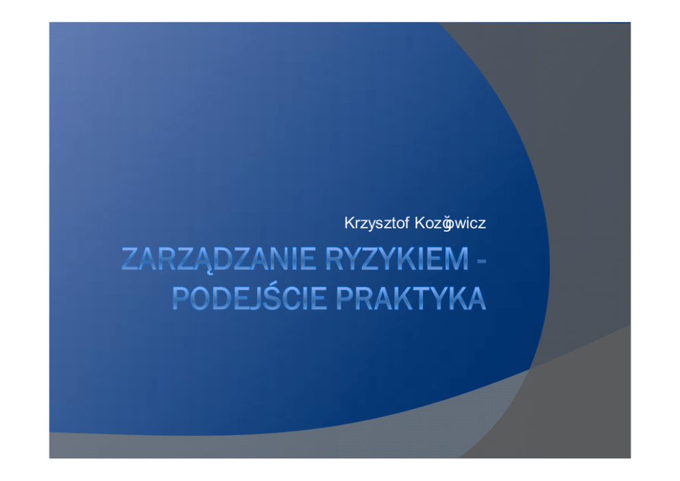 Krzysztof Kozłowicz Plan prezentacji Ryzyko – czym się zajmujemy ž Techniki pomiaru ryzyka – zdrowy rozsądek ž Podejście do zarządzania ryzykiem – pomoc w rozwoju organizacji ž Plan prezentacji Ryzyko – czym się zajmujemy ž Techniki pomiaru ryzyka – zdrowy rozsądek ž Podejście do zarządzania ryzykiem – pomoc w rozwoju organizacji ž Przedsięwzięcie, którego wynik jest nieznany, zależny od przypadku; też: większe prawdopodobie ństwo, że coś się nie uda niż że się uda; też: odważenie się na taką ewentualno ść Słownik języka polskiego PW N, Warszawa 2008 Definicje ryzyka dla celów zarządzania organizacją Skutek zdarzenia który niekorzys tnie wpłynie na realizacj ę celów organizacji (czyste ryzyko) ž Skutek zdarzenia który korzys tnie wpłynie na realizacj ę celów organizacji (ryzyko spekulacyjne) ž Zdarzenie czy skutek ž ž ž ž ž Ilość otaczających nas zdarzeń jest bardzo dużą Ocena wpływu zdarzenia na organizacj ę wymaga określenia skutku tego zdarzenia Zdarzenia: deszcz i roztopy Skutek: podniesienie stanu wód, podtopienia Skutek dla organizacji: utrudnienia w dostępie do siedziby lub zalanie siedziby Zdarzenie czy skutek ž ž ž ž ž Ilość otaczających nas zdarzeń jest bardzo dużą Ocena wpływu zdarzenia na organizacj ę wymaga określenia skutku tego zdarzenia Zdarzenia: deszcz i roztopy Skutek: podniesienie stanu wód, podtopienia Skutek dla organizacji: utrudnienia w dostępie do siedziby lub zalanie siedziby Powiązanie z celami ž ž ž Zdarzenie: sztorm w Zatoce Meksykańskiej Skutek: uszkodzenie plat form Wpływ na Szpital Powiatowy (Polska): brak Ryzyka indywidualne dla danej organizacji Powiązanie z celami ž ž ž Zdarzenie: zerwanie linii energetycznych w powiecie Skutek: zatrzymanie funkcjonowania aparatury medycznej Wpływ na Szpital Powiatowy: występuje Ryzyka indywidualne dla danej organizacji Plan prezentacji Ryzyko – czym się zajmujemy ž Techniki pomiaru ryzyka – zdrowy rozsądek ž Podejście do zarządzania ryzykiem – pomoc w rozwoju organizacji ž Miary ryzyka ž Zdarzenie może wystąpić z określonym prawdopodobie ństwem i wywołać skutek z określonym wpływem Miary ryzyka Ryzyko wywodzi się z faktu, iż ludzie podejmują decyzje przy braku pewności o przyszłości ž Zarządzanie ryzykiem ma na celu ograniczyć tą niepewność poprzez jej nazwanie (identyfikacj a ryzyka) oraz pomiar (ocena/wycena ryzyka) ž Wpływ W długim horyzoncie czasu wszystko można wyrazić w pieniądzu ž Długi horyzont czasowy nie pozwala na operacyjne zarządzanie organizacj ą (poza sektorem finansowy) ž Dodatkowe miary wpływu uzależnione od zakresu działalności jednostki ž Miary wpływu PLN ž Zatrzymanie świadczenia usług (czas) ž Zatrzymanie produkcji (czas) ž Reputacja (media) ž Środowisko naturalne (zakres katastrofy) ž Zdrowie ludzi (stopień uszczerbku na zdrowiu) ž Prawdopodobieństwo W matematyce liczbowe wyrażenie oceny możliwości zajścia zdarzenia losowego w określonych warunkach ž W praktyce stosuje się podejście matematyczne (ilościowe) lub eksperckie (jakościowe) ž Horyzont czasu ž Pojedyncze zdarzenie lub suma zdarze ń w horyzoncie czasu ž Zależność zdarzeń ž Rozkład ryzyka – wypadek samochodowy – zdarzenie E NI TA K 100% 90% 80% 70% 60% 50% 40% 30% 20% 10% 0% Rozkład ryzyka – wypadek samochodowy - wpływ na pasażerów 40% 30% 20% 10% ę w ia en ż ra ob za gr o ew n ła z ia yc ż trz ż ne en ie ie an m ze łu c st be z ur az ni a ów 0% ra ob en ia an ie ż ia yc ę trz ż ne en ie n w ew za gr o ż ła m ia en cz ów az ur łu z st z be Rozkład ryzyka – wypadek samochodowy 0,80% 0,60% 0,40% 0,20% 0,00% Metody oceny ryzyka ž Metody ilościowe — Bazując na znanym z historii zachowaniu zjawiska określamy przewidywaną przyszłość z wykorzystaniem metod statystycznych ž Metody jakościowe — W oparciu o znane z historii zachowanie zjawiska a także wiedzę i doświadczenie określamy przewidywaną przyszłość według spójnej metodologii ž Metody ilościowo - jakościowe Metody oceny ryzyka ž Metody ilościowe — Wartość oczekiwana (najczęściej występujący wynik wpływu wystąpienia danego ryzyka) — Zmienność (jak dalece wyniki wystąpienia danego ryzyka odchylają się od średniej) — Typ rozkładu (w jakich kierunkach wyniki wystąpienia danego ryzyka) — Brak identyfikacji ryzyk które nie wystąpiły wcześniej ale możliwych (czarne łabędzie) Metody oceny ryzyka ž Metoda ilościowa – rozkład normalny — Posiadamy dane z 24 poprzednich kwartałów (6 lat) — Kwartalne straty z tytułu braku energii elektrycznej – średnio 40 tys. PLN — Średnie odchylenie strat od wartości 40 tys. PLN wynosi 10 tys. PLN — Stwierdzamy rozkład normalny tego ryzyka — Akceptujemy poziom błędu związany z wielkością próby i odchyleniem standardowy Metody oceny ryzyka ž Wycena tego ryzyka to 50 tys. PLN przy akceptacji przekroczenia tego poziomu raz na 68 kwartałów, 60 tys. PLN przy akceptacji przekroczenia tego poziomu raz na 95 kwartałów i 70 tys. PLN przy akceptacji przekroczenia tego poziomu raz na 100 kwartałów Metody oceny ryzyka ž Metody jakościowe — Opisowe określenie kategorii prawdopodobie ństwa i wpływu - metodyka — Warsztaty w grupach eksperckich — Ankiety — Analiza scenariszy zdarzeń Metody oceny ryzyka ž Metody ilościowo - jakościowe — Pierwsze oceny oparte na analizie jakościowej — Uzupełnianie ocen jakościowych wskaźnikami — Obserwowanie zachowania wskaźników — Stopniowe przechodzenie na wskaźniki z możliwością korekty eksperckiej Poziom 5 Przykłady l Finansowe – strata/utracona korzyść powyżej 100 mln PLN Katastrofic l Usługa/działanie – brak świadczeni a usług podstawowych powy żej14 dni zne l Podsumowani e – jest mało prawdopodobne, żeby organizacja przetrwała l Finansowe – strata/utracona korzyść pomiędzy 50 mln PLN