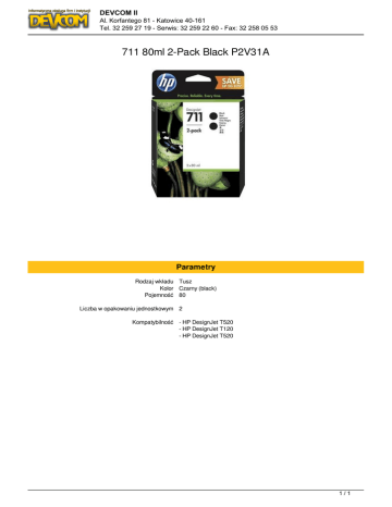 DEVCOM II Al. Korfantego 81 - Katowice 40-161 Tel. 32 259 27 19 - Serwis: 32 259 22 60 - Fax: 32 258 05 53 711 80ml 2-Pack Black P2V31A Parametry Rodzaj wkładu Tusz Kolor Czarny (black) Pojemność 80 Liczba w opakowaniu jednostkowym 2 Kompatybilność - HP DesignJet T520 - HP DesignJet T120 - HP DesignJet T520 1/1 Powered by TCPDF (www.tcpdf.org)