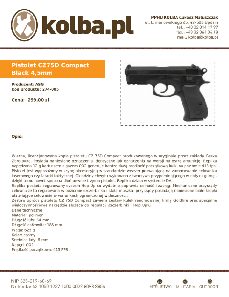 Pistolet CZ75D Compact Black 4,5mm Producent: ASG Kod produktu: 274-005 Cena: 299,00 zł Opis: Wierna, licencjonowana kopia pistoletu CZ 75D Compact produkowanego w oryginale przez zakłady Česka Zbrojovka. Posiada naniesione oznaczenia identyczne jak oznaczenia na wersji na ostrą amunicję. Replika napędzana 12 g kartuszem z gazem CO2 generuje bardzo dużą prędkość początkową kulki na poziomie 413 fps! Pistolet jest wyposażony w szynę akcesoryjną w standardzie weaver pozwalającą na zamocowanie celownika laserowego czy latarki taktycznej. Okładziny chwytu wykonano z tworzywa przypominającego w dotyku gumę dzięki temu nawet spocona dłoń pewnie trzyma pistolet. Replika działa w systemie DA. Replika posiada regulowany system Hop Up co wydatnie poprawia celność i zasięg. Mechaniczne przyrządy celownicze to regulowana w poziomie szczerbinka i stała muszka, przyrządy posiadają naniesione białe kropki ułatwiające celowanie w warunkach ograniczonej widoczności. Zestaw oprócz pistoletu CZ 75D Compact zawiera zestaw kulek renomowanej firmy Goldfire oraz specjalne wieloczynnościowe narzędzie służące do regulacji szczerbinki i Hop Up'u. Dane techniczne Materiał: polimer Długość lufy: 64 mm Długość całkowita: 185 mm Waga: 625 g Kolor: czarny Średnica lufy: 6 mm Napęd: CO2 Prędkość początkowa: 413 FPS Gearbox: standardowy Rodzaj magazynka: rzędowy Pojemność magazynka: 15 kulek Producent: Česká Zbrojovka Uherský Brod, Czechy/ Action Sport Games, Dania Wierna, licencjonowana kopia pistoletu CZ 75D Compact produkowanego w oryginale przez zakłady Česka Zbrojovka. Posiada naniesione oznaczenia identyczne jak oznaczenia na wersji na ostrą amunicję. Replika napędzana 12 g kartuszem z gazem CO2 generuje bardzo dużą prędkość początkową kulki na poziomie 413 fps! Pistolet jest wyposażony w szynę akcesoryjną w standardzie weaver pozwalającą na zamocowanie celownika laserowego czy latarki taktycznej. Okładziny chwytu wykonano z tworzywa przypominającego w dotyku gumę dzięki temu nawet spocona dłoń pewnie trzyma pistolet. Replika działa w systemie DA. Replika posiada regulowany system Hop Up co wydatnie poprawia celność i zasięg. Mechaniczne przyrządy celownicze to regulowana w poziomie szczerbinka i stała muszka, przyrządy posiadają naniesione białe kropki ułatwiające celowanie w warunkach ograniczonej widoczności. Zestaw oprócz pistoletu CZ 75D Compact zawiera zestaw kulek renomowanej firmy Goldfire oraz specjalne wieloczynnościowe narzędzie służące do regulacji szczerbinki i Hop Up'u. Dane techniczne: ● ● ● ● ● ● ● ● ● ● materiał: polimer długość lufy: 64 mm długość całkowita: 185 mm waga: 625 g kolor: czarny średnica lufy: 6 mm napęd: CO2 prędkość początkowa: 413 FPS gearbox: standardowy rodzaj magazynka: rzędowy ● ● pojemność magazynka: 15 kulek producent: Česká Zbrojovka Uherský Brod, Czechy/ Action Sport Games, Dania