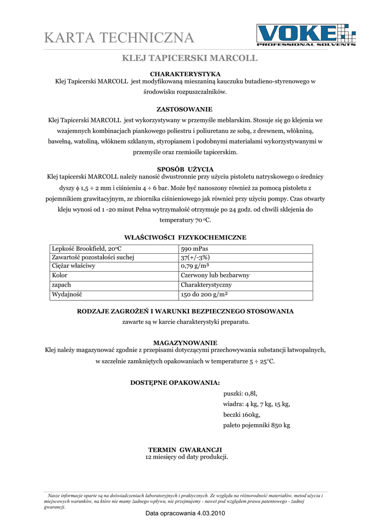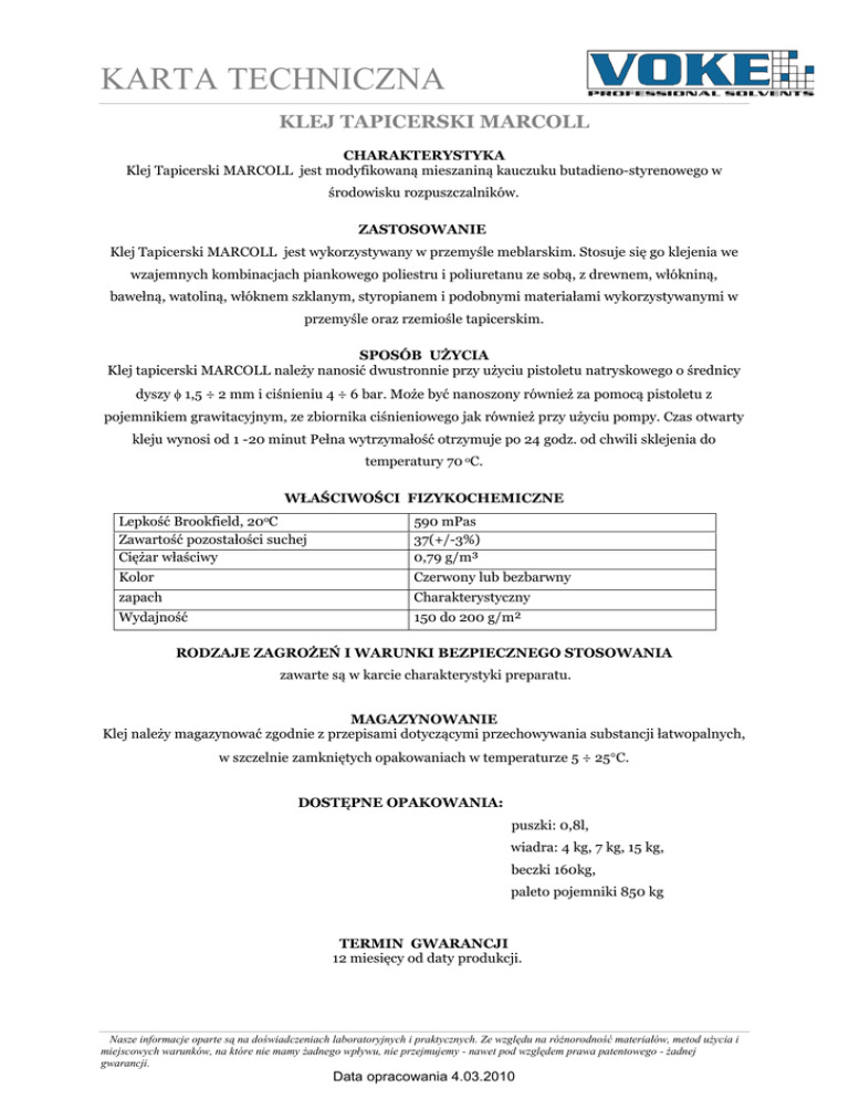KARTA TECHNICZNA KLEJ TAPICERSKI MARCOLL CHARAKTERYSTYKA Klej Tapicerski MARCOLL jest modyfikowaną mieszaniną kauczuku butadieno-styrenowego w środowisku rozpuszczalników. ZASTOSOWANIE Klej Tapicerski MARCOLL jest wykorzystywany w przemyśle meblarskim. Stosuje się go klejenia we wzajemnych kombinacjach piankowego poliestru i poliuretanu ze sobą, z drewnem, włókniną, bawełną, watoliną, włóknem szklanym, styropianem i podobnymi materiałami wykorzystywanymi w przemyśle oraz rzemiośle tapicerskim. SPOSÓB UŻYCIA Klej tapicerski MARCOLL należy nanosić dwustronnie przy użyciu pistoletu natryskowego o średnicy dyszy φ 1,5 ÷ 2 mm i ciśnieniu 4 ÷ 6 bar. Może być nanoszony również za pomocą pistoletu z pojemnikiem grawitacyjnym, ze zbiornika ciśnieniowego jak również przy użyciu pompy. Czas otwarty kleju wynosi od 1 -20 minut Pełna wytrzymałość otrzymuje po 24 godz. od chwili sklejenia do temperatury 70 oC. WŁAŚCIWOŚCI FIZYKOCHEMICZNE Lepkość Brookfield, 20oC Zawartość pozostałości suchej Ciężar właściwy 590 mPas 37(+/-3%) 0,79 g/m³ Kolor Czerwony lub bezbarwny zapach Charakterystyczny Wydajność 150 do 200 g/m² RODZAJE ZAGROŻEŃ I WARUNKI BEZPIECZNEGO STOSOWANIA zawarte są w karcie charakterystyki preparatu. MAGAZYNOWANIE Klej należy magazynować zgodnie z przepisami dotyczącymi przechowywania substancji łatwopalnych, w szczelnie zamkniętych opakowaniach w temperaturze 5 ÷ 25°C. DOSTĘPNE OPAKOWANIA: puszki: 0,8l, wiadra: 4 kg, 7 kg, 15 kg, beczki 160kg, paleto pojemniki 850 kg TERMIN GWARANCJI 12 miesięcy od daty produkcji. Nasze informacje oparte są na doświadczeniach laboratoryjnych i praktycznych. Ze względu na różnorodność materiałów, metod użycia i miejscowych warunków, na które nie mamy żadnego wpływu, nie przejmujemy - nawet pod względem prawa patentowego - żadnej gwarancji. Data opracowania 4.03.2010