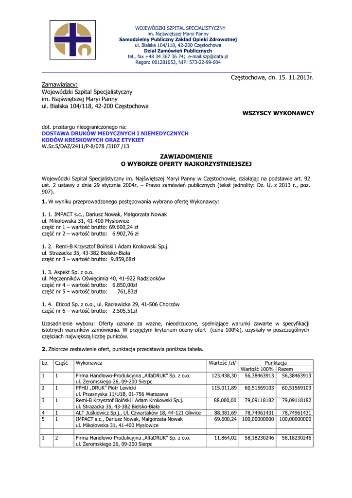 WOJEWÓDZKI SZPITAL SPECJALISTYCZNY im. Najświętszej Maryi Panny Samodzielny Publiczny Zakład Opieki Zdrowotnej ul. Bialska 104/118, 42-200 Częstochowa Dział Zamówień Publicznych tel., fax +48 34 367 36 74; e-mail:[email protected] Regon: 001281053, NIP: 573-22-99-604 ____________________________________________________________________________ Częstochowa, dn. 15. 11.2013r. Zamawiający: Wojewódzki Szpital Specjalistyczny im. Najświętszej Maryi Panny ul. Bialska 104/118, 42-200 Częstochowa WSZYSCY WYKONAWCY dot. przetargu nieograniczonego na: DOSTAWA DRUKÓW MEDYCZNYCH I NIEMEDYCZNYCH KODÓW KRESKOWYCH ORAZ ETYKIET W.Sz.S/DAZ/2411/P-8/078 /3107 /13 ZAWIADOMIENIE O WYBORZE OFERTY NAJKORZYSTNIEJSZEJ Wojewódzki Szpital Specjalistyczny im. Najświętszej Maryi Panny w Częstochowie, działając na podstawie art. 92 ust. 2 ustawy z dnia 29 stycznia 2004r. – Prawo zamówień publicznych (tekst jednolity: Dz. U. z 2013 r., poz. 907). 1. W wyniku przeprowadzonego postępowania wybrano ofertę Wykonawcy: 1. 1. IMPACT s.c., Dariusz Nowak, Małgorzata Nowak ul. Mikołowska 31, 41-400 Mysłowice część nr 1 – wartość brutto: 69.600,24 zł część nr 2 – wartość brutto: 6.902,76 zł 1. 2. Remi-B Krzysztof Boiński i Adam Krokowski Sp.j. ul. Strażacka 35, 43-382 Bielsko-Biała część nr 3 – wartość brutto: 9.859,68zł 1. 3. Aspekt Sp. z o.o. ul. Męczenników Oświęcimia 40, 41-922 Radzionków część nr 4 – wartość brutto: 6.850,00zł część nr 5 – wartość brutto: 761,83zł 1. 4. Eticod Sp. z o.o., ul. Racławicka 29, 41-506 Chorzów część nr 6 – wartość brutto: 2.505,51zł Uzasadnienie wyboru: Oferty uznane za ważne, nieodrzucone, spełniające warunki zawarte w specyfikacji istotnych warunków zamówienia. W przyjętym kryterium oceny ofert (cena 100%), uzyskały w poszczególnych częściach największą liczbę punktów. 2. Zbiorcze zestawienie ofert, punktacja przedstawia poniższa tabela. Lp. Część Wykonawca 1 1 2 1 3 1 4 5 1 1 Firma Handlowo-Produkcyjna „AlfaDRUK” Sp. z o.o. ul. Żeromskiego 26, 09-200 Sierpc PPHU „DRUK” Piotr Lewicki ul. Przasnyska 11/U1B, 01-756 Warszawa Remi-B Krzysztof Boiński i Adam Krokowski Sp.j. ul. Strażacka 35, 43-382 Bielsko-Biała ALT Juśkiewicz Sp.j., Ul. Czwartaków 18, 44-121 Gliwice IMPACT s.c., Dariusz Nowak, Małgorzata Nowak ul. Mikołowska 31, 41-400 Mysłowice 1 2 Firma Handlowo-Produkcyjna „AlfaDRUK” Sp. z o.o. ul. Żeromskiego 26, 09-200 Sierpc Wartość /zł/ Punktacja Wartość 100% Razem 123.438,30 56,38463913 56,38463913 115.011,89 60,51569103 60,51569103 88.000,00 79,09118182 79,09118182 88.381,69 69.600,24 78,74961431 100,00000000 78,74961431 100,00000000 11.864,02 58,18230246 58,18230246 2 2 3 2 4 5 2 2 1 3 2 3 3 3 4 3 5 3 6 3 7 3 1 2 4 4 3 4 4 4 5 4 6 4 7 4 8 4 1 5 2 5 3 5 4 5 5 5 6 5 7 5 8 5 9 5 1 6 2 6 3 6 4 6 5 6 PPHU „DRUK” Piotr Lewicki ul. Przasnyska 11/U1B, 01-756 Warszawa Remi-B Krzysztof Boiński i Adam Krokowski Sp.j. ul. Strażacka 35, 43-382 Bielsko-Biała ALT Juśkiewicz Sp.j., Ul. Czwartaków 18, 44-121 Gliwice IMPACT s.c., Dariusz Nowak, Małgorzata Nowak ul. Mikołowska 31, 41-400 Mysłowice 16.157,28 42,72228989 42,72228989 12.733,58 54,20910694 54,20910694 11.143,60 6.902,76 61,94371657 100,00000000 61,94371657 100,00000000 Drukarnia „LIPKA” ul. Mickiewicza 9A, 14-200 Iława Firma Handlowo-Produkcyjna „AlfaDRUK” Sp. z o.o. ul. Żeromskiego 26, 09-200 Sierpc Remi-B Krzysztof Boiński i Adam Krokowski Sp.j. ul. Strażacka 35, 43-382 Bielsko-Biała Laser Polska ul. Złotno 173, 94-411 Łódź ETIMARK Tomasz Zawada, ul. Frankowskiego 22/2, 20736 Lublin Przedsiębiorstwo Virgo ul. Warszawska 320, 42-200 Częstochowa IMPACT s.c., Dariusz Nowak, Małgorzata Nowak ul. Mikołowska 31, 41-400 Mysłowice 10.332,00 95,42857143 95,42857143 14.760,00 66,80000000 66,80000000 9.859,68 100,00000000 100,00000000 11.808,00 83,50000000 83,50000000 10 744,80 91,76234085 91,76234085 14.760,00 66,80000000 66,80000000 19.483,20 50,60606061 50,60606061 Eticod Sp. z o.o., ul. Racławicka 29, 41-506 Chorzów Aspekt Sp. z o.o. ul. Męczenników Oświęcimia 40, 41-922 Radzionków Remi-B Krzysztof Boiński i Adam Krokowski Sp.j. ul. Strażacka 35, 43-382 Bielsko-Biała Laser Polska ul. Złotno 173, 94-411 Łódź ETIMARK Tomasz Zawada ul. Frankowskiego 22/2, 20-736 Lublin INFODRUK Zakład Poligraficzny A.Przybylski, A.Rodak, W. Ziółkowski Ul. Studzienna 14, 61-006 Poznań Przedsiębiorstwo Virgo ul. Warszawska 320, 42-200 Częstochowa Stanpol Łukasz Janicki ul. Dworcowa 8, 44-145 Stanica 14.464,80 6.850,00 47,35634091 100,00000000 47,35634091 100,00000000 20.664,00 33,14943864 33,14943864 8.610,00 79,55865273 79,55865273 12.742,80 53,75584644 53,75584644 6.880,00 99,56395349 99,56395349 13.776,00 49,72415796 49,72415796 12.742,80 53,75584644 53,75584644 Eticod Sp. z o.o. ul. Racławicka 29, 41-506 Chorzów Drukarnia „LIPKA” ul. Mickiewicza 9A, 14-200 Iława Firma Handlowo-Produkcyjna „AlfaDRUK” Sp. z o.o. ul. Żeromskiego 26, 09-200 Sierpc Aspekt Sp. z o.o. ul. Męczenników Oświęcimia 40, 41-922 Radzionków Remi-B Krzysztof Boiński i Adam Krokowski Sp.j. ul. Strażacka 35, 43-382 Bielsko-Biała Laser Polska ul. Złotno 173, 94-411 Łódź ETIMARK Tomasz Zawada ul. Frankowskiego 22/2, 20-736 Lublin INFODRUK Zakład Poligraficzny A.Przybylski, A.Rodak, W. Ziółkowski, Ul. Studzienna 14, 61-006 Poznań Stanpol Łukasz Janicki ul. Dworcowa 8, 44-145 Stanica 2.542,41 29,96487585 29,96487585 1.463,70 52,04823393 52,04823393 2.779,80 27,40592848 27,40592848 761,83 100,00000000 100,00000000 4.428,00 17,20483288 17,20483288 3.813,00 19,97980593 19,97980593 1.740,45 43,77201299 43,77201299 3.485,00 21.86025825 21.86025825 3.972,90 19,17566513 19,17566513 Eticod Sp. z o.o. ul. Racławicka 29, 41-506 Chorzów Dia Hem Diagnostic Products Sp. z o.o. Al. Słowackiego 64, 30-004 Kraków Aspekt Sp. z o.o. ul. Męczenników Oświęcimia 40, 41-922 Radzionków Remi-B Krzysztof B