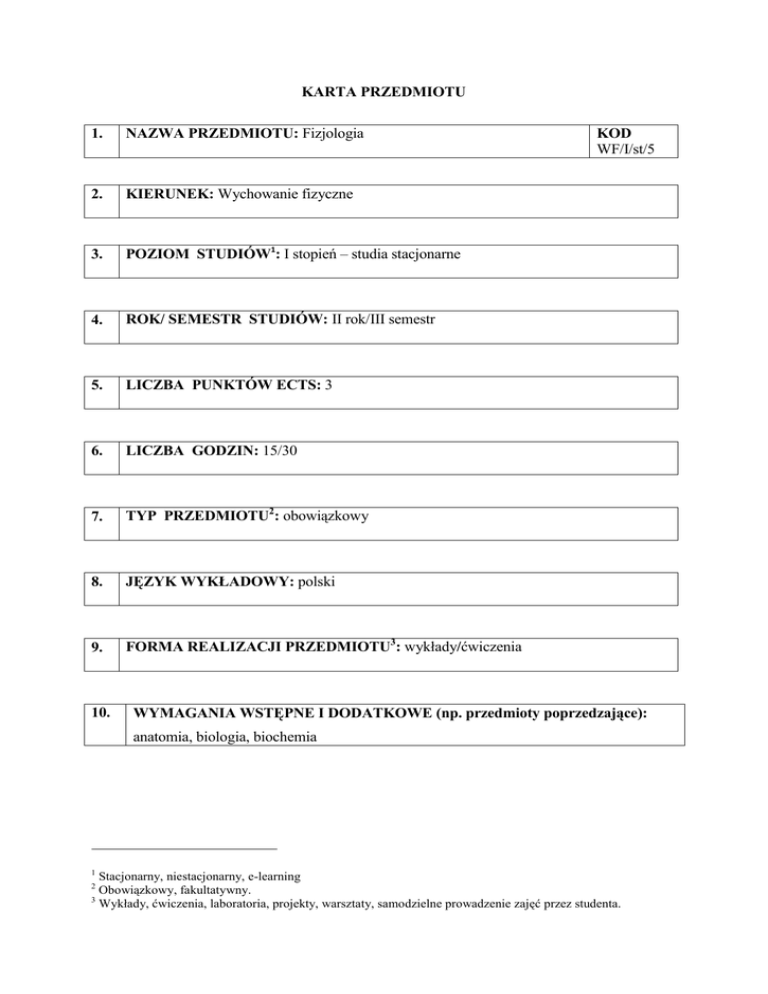 KARTA PRZEDMIOTU 1. NAZWA PRZEDMIOTU: Fizjologia 2. KIERUNEK: Wychowanie fizyczne 3. POZIOM STUDIÓW1: I stopień – studia stacjonarne 4. ROK/ SEMESTR STUDIÓW: II rok/III semestr 5. LICZBA PUNKTÓW ECTS: 3 6. LICZBA GODZIN: 15/30 7. TYP PRZEDMIOTU2: obowiązkowy 8. JĘZYK WYKŁADOWY: polski 9. FORMA REALIZACJI PRZEDMIOTU3: wykłady/ćwiczenia 10. KOD WF/I/st/5 WYMAGANIA WSTĘPNE I DODATKOWE (np. przedmioty poprzedzające): anatomia, biologia, biochemia 1 Stacjonarny, niestacjonarny, e-learning Obowiązkowy, fakultatywny. 3 Wykłady, ćwiczenia, laboratoria, projekty, warsztaty, samodzielne prowadzenie zajęć przez studenta. 2 11. CEL PRZEDMIOTU: Celem przedmiotu jest wprowadzenie studentów w podstawową problematykę teorii stanowiących zbiór praw fizjologicznych jakim podlega cały organizm oraz poszczególne jego układy, tkanki i komórki w warunkach spoczynkowych. 12. PRZEDMIOTOWE EFEKTY KSZTAŁCENIA4 P_W01. Zna i funkcjonowania i rozumie podstawy czynności układów Odniesienie do kierunkowych efektów kształcenia (symbol) Odniesienie do obszarowych efektów kształcenia i standardów kształcenia nauczycieli (symbol) K_W01 M1_W01 M1_W02 SN_Wa K_W02 M1_W01 M1_W02 SN_Wa K_W04 M1_W01 M1_W04 SN_Wa SN_Wc M1_U08 M1_U13 fizjologicznych i narządów człowieka oraz podstawowe procesy zachodzące w organizmie człowieka w ontogenezie. P_W02. Zna i rozumie mechanizmy fizjologiczne, które decydują o prawidłowym przebiegu procesów życiowych oraz warunkach utrzymania homeostazy P_W03. Zna podstawowe metody pomiarów parametrów fizjologicznych i ich normy. P_U01. Potrafi wskazać i nazwać elementy K_U01 składowe układów fizjologicznych oraz potrafi wyjaśnić zależności i związki występujące pomiędzy nimi. P_U02. Potrafi korzystać z aparatury i sprzętu do K_U02 pomiarów parametrów fizjologicznych oraz interpretować wyniki uzyskanych pomiarów. P_U03. Umie postępować zgodnie z zasadami bezpieczeństwa obowiązującymi w pracowni fizjologicznej 4 K_U17 M1_U02 M1_U05 M1_U06 M1_U12 SN_Ua M1_U03 M1_U07 M1_U09 M1_U10 M1_U12 Efekty kształcenia w zakresie wiedzy (P_W), umiejętności (P_U) i kompetencji społecznych (P_K). P_K01. Samodzielnie i w zespołach uczestniczy K_K02 w realizacji stawianych przed nim zadań w pracowni fizjologicznej. P_K02. Aktywnie uczestniczy w ćwiczeniach i postępuje zgodnie z regulaminem pracowni fizjologicznej. 13. METODY OCENY EFEKTÓW KSZTAŁCENIA Metody (sposoby) oceny5 Typ oceny6 Symbol przedmiotowego efektu kształcenia P_W01 zaliczenie pisemne podsumowująca praca pisemna P_W02 zaliczenie pisemne podsumowująca praca pisemna P_W03 praca pisemna P_U02 ocenianie ciągłe oraz zaliczenie formująca, pisemne podsumowująca ocenianie ciągłe oraz zaliczenie formująca, pisemne podsumowująca ocenianie ciągłe formująca P_U03 ocenianie ciągłe formująca P_K01 ocenianie ciągłe formująca P_K02 ocenianie ciągłe formująca P_U01 5 K_K08 SN_Ue SN_Ug M1_K01 M1_K02 M1_K03 M1_K04 M1_K05 M1_K06 M1_K08 SN_Ke M1_K02 M1_K04 M1_K07 M1_K08 Forma dokumentacji praca pisemna protokół z wykonanych obserwacji regulamin pracowni protokół z wykonanych pomiarów fizjologicznych regulamin pracowni Ocenianie ciągłe (bieżące przygotowanie do zajęć), śródsemestralne zaliczenie pisemne, śródsemestralne zaliczenie ustne, końcowe zaliczenia pisemne, końcowe zaliczenia ustne, egzamin pisemny, egzamin ustny, praca semestralna, ocena umiejętności ruchowych, praca dyplomowa, projekt, kontrola obecności 6 Formująca, podsumowująca. 14. TREŚCI PROGRAMOWE Treść zajęć Forma zajęć7 1. Wprowadzenie - miejsce fizjologii w naukach biologicznych i jej znaczenie dla nauk o kulturze fizycznej. Zakres eksperymentu Fizjologiczny i pojęcie fizjologii (doświadczenia). margines – (liczba godz.) wykład (1) Symbol przedmiotowych efektów kształcenia P_W01, P_W02 P_U01 rola Homeostaza. bezpieczeństwa. Bodziec fizjologiczny i reakcja. Czucie i percepcja. 2. Układ nerwowy – podstawowe funkcje i znaczenie dla zachowania życia. Podział układu nerwowego wykład (1) P_W01, P_W02 wykład (1) P_W01, P_W02 wykład (1) P_W01, P_W02 P_U01 wykład (1) P_W01, P_W02 P_U01 pod względem topograficznym i czynnościowym. Potencjał błonowy – potencjał spoczynkowy i potencjał czynnościowy. Rola pompy jonowej – „pompa sodowo-potasowa”. Pobudliwość, bodziec, pobudzenie. Jednostki pobudliwości - chronaksja i reobaza. 3. Układ nerwowy c.d. Przekazywanie informacji w układzie nerwowym. Podział włókien Transmisja nerwowych synaptyczna. – różnice czynnościowe. Sumowanie czasowe i przestrzenne. Funkcja układu autonomicznego. Czucie i narządy zmysłów. 4. Układ wydzielania wewnętrznego. Mechanizmy działania hormonów. Rola hormonów w utrzymaniu homeostazy i stanu równowagi czynnościowej. Interakcja hormon – receptor. Osie podwzgórzowoprzysadkowe. Sprzężenie zwrotne. Udział hormonów w reakcji stresowej. 5. Układ mięśniowy. Czynność komórki mięśniowej. Jednostka 7 motoryczna. Sprzężenie Wykłady, ćwiczenia, laboratoria, samodzielne prowadzenie zajęć przez studenta. elektromechaniczne. Skurcz mięśnia szkieletowego – mechanizm. Czynność mięśni szkieletowych w ustroju. Zjawiska bioelektryczne w mięśniu – zastosowanie elektromiografii (EMG) do badania czynności mięśni. 6. Układ mięśniowy c.d. Regulacja napięcia mięśniowego. Spoczynkowy tonus mięśniowy. Skurcz wykład (1) P_W01, P_W02 P_U01 wykład (1) P_W01, P_W02 P_U01 wykład (1) P_W01, P_W02 P_U01 wykład (1) P_W01, P_W02 P_U01, pojedynczy, tężcowy niezupełny i zupełny. Rodzaje skurczów mięśniowych: izotoniczny, izometryczny, auksotoniczny. Metabolizm energetyczny mięśni szkieletowych. Zmęczenie mięśni. 7. Fizjologia układu krążenia i mięśnia sercowego. Budowa i właściwości elektryczne mięśnia sercowego. „Prawo wszystko albo nic”. Układ bodźcotwórczy i przewodzący serca. Elektrokardiografia (EKG). Mechanika i hemody