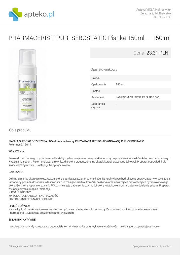 Apteka VIOLA Halina wiluk Żelazna 9/14, Białystok 85 742 27 35 PHARMACERIS T PURI-SEBOSTATIC Pianka 150ml - - 150 ml Cena: 23,31 PLN Opis słownikowy Dawka - Opakowanie 150 ml Postać - Producent LAB.KOSM.DR IRENA ERIS SP.Z O.O. Substancja czynna - Opis produktu PIANKA GŁĘBOKO OCZYSZCZAJĄCA do mycia twarzy PRZYWRACA HYDRO–RÓWNOWAGĘ PURI-SEBOSTATIC. Pojemność: 150ml. WSKAZANIA: Pianka do codziennego mycia twarzy dla skóry trądzikowej i mieszanej ze skłonnością do powstawania zaskórników oraz nadmiernego wydzielania sebum. Rekomendowana również dla skóry przesuszonej na skutek kuracji przeciwtrądzikowej. Preparat odpowiedni dla skóry w każdym wieku. Zastępuje tradycyjne mydło. DZIAŁANIE: Delikatna pianka skutecznie oczyszcza skórę z zanieczyszczeń oraz makijażu. Naturalny kwas hydroksycytrynowy zawarty w wyciągu z tamaryndy posiada doskonałe właściwości złuszczające martwe komórki naskórka oraz nawilżające przywracające hydro-równowagę skóry. Ekstrakt z łopianu oraz cynk PCA zmniejszają zaburzenia czynności skóry łojotokowej normalizując wydzielanie sebum. Preparat wykazuje wysoki stopień tolerancji. HIPOALERGICZNY WYSOKA TOLERANCJA I SKUTECZNOŚĆ PRZEBADANO DERMATOLOGICZNIE SPOSÓB UŻYCIA: Niewielką ilość pianki wydozować na dłoń i umyć twarz. Następnie spłukać wodą. Zastosować tonik i odpowiedni krem z serii Pharmaceris T. Stosować codziennie rano i wieczorem. SKŁADNIKI AKTYWNE: Wyciąg z tamaryndy - złuszcza zrogowaciałe komórki naskórka oraz wykazuje właściwości nawilżające, przywracające hydro- Plik wygenerowano: 04-03-2017 Oprogramowanie sklepu: AptusShop Apteka VIOLA Halina wiluk Żelazna 9/14, Białystok 85 742 27 35 równowagę skóry. Wyciąg z łopianu - skutecznie reguluje florę bakteryjną oraz nadmierne przetłuszczanie się skóry. Posiada właściwości przeciwbakteryjne. Cynk PCA - normalizuje nadmierną aktywność gruczołów łojowych, zmniejszając wydzielenie sebum. Plik wygenerowano: 04-03-2017 Powered by TCPDF (www.tcpdf.org) Oprogramowanie sklepu: AptusShop