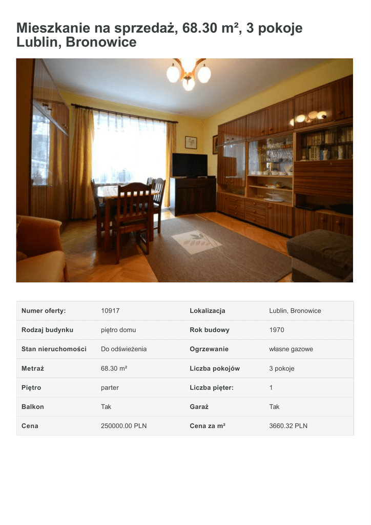 Mieszkanie na sprzedaż, 68.30 m², 3 pokoje Lublin, Bronowice Numer oferty: 10917 Lokalizacja Lublin, Bronowice Rodzaj budynku piętro domu Rok budowy 1970 Stan nieruchomości Do odświeżenia Ogrzewanie własne gazowe Metraż 68.30 m² Liczba pokojów 3 pokoje Piętro parter Liczba pięter: 1 Balkon Tak Garaż Tak Cena 250000.00 PLN Cena za m² 3660.32 PLN NA SPRZEDAŻ NIERUCHOMOŚĆ NA BRONOWICACH, UL. GRABSKIEGO Składa się z bez czynszowego mieszkania położonego na parterze domu w zabudowie bliźniaczej oraz budynku garażowego - warsztatu. Dom był ocieplony i jest zadbany. Mieszkanie to lokal o rozkładowych pokojach z tarasem (20 mkw) i ogródkiem oraz przynależnym strychem (36 mkw) i piwnicą (25 mkw). Wymieniono w nim okna oraz instalacje elektryczne. Nadaje się do zamieszkania w aktualnej postaci. Budynek garażowy to wolno stojący warsztat o pow. 84 mkw. Ocieplony, z wymienionymi oknami, dwoma kanałami, pomieszczeniem socjalnym, wc, kanalizacją, oddzielnym licznikami i wyciągiem powietrza. Idealnie sprawdzi się pod wynajem jako warsztat samochodowy, lakiernia, usługi blacharskie czy inne. Szacunkowy zysk z wynajmu to ok. 1200-1400 zł/mc. Całość jest wyodrębniona i posiada księgę wieczystą. Nieruchomość znajduje się przy ul. Grabskiego - ruchliwej ulicy z punktami usługowymi przy domach dlatego jest ciekawą opcją dla każdego, kto planuje własny biznes przy miejscu zamieszkania. Uwaga: cena w komplecie mieszkanie+warsztat to 370.000 zł. POLECAM!!! Opiekun oferty Michał Drzymała Kom.: 531990187 [email protected] Jestśmy do Państwa dyspozycji 7 dni w tygodniu, w godz. 8:00-22:00.