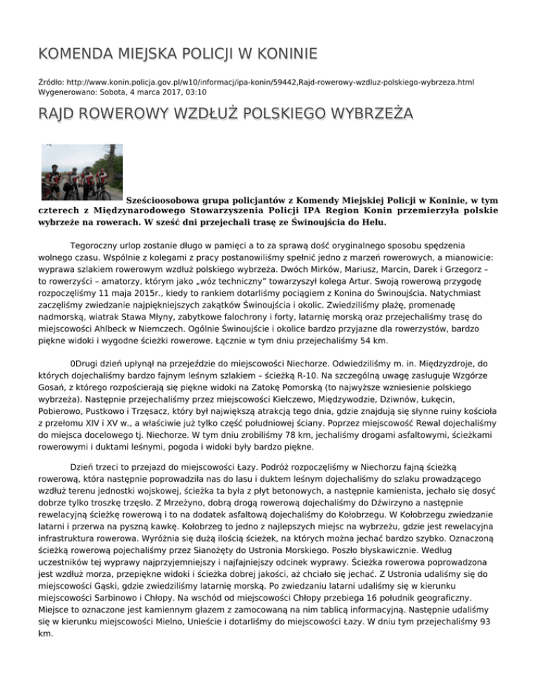 KOMENDA MIEJSKA POLICJI W KONINIE Źródło: http://www.konin.policja.gov.pl/w10/informacj/ipa-konin/59442,Rajd-rowerowy-wzdluz-polskiego-wybrzeza.html Wygenerowano: Sobota, 4 marca 2017, 03:10 RAJD ROWEROWY WZDŁUŻ POLSKIEGO WYBRZEŻA Sześcioosobowa grupa policjantów z Komendy Miejskiej Policji w Koninie, w tym czterech z Międzynarodowego Stowarzyszenia Policji IPA Region Konin przemierzyła polskie wybrzeże na rowerach. W sześć dni przejechali trasę ze Świnoujścia do Helu. Tegoroczny urlop zostanie długo w pamięci a to za sprawą dość oryginalnego sposobu spędzenia wolnego czasu. Wspólnie z kolegami z pracy postanowiliśmy spełnić jedno z marzeń rowerowych, a mianowicie: wyprawa szlakiem rowerowym wzdłuż polskiego wybrzeża. Dwóch Mirków, Mariusz, Marcin, Darek i Grzegorz – to rowerzyści – amatorzy, którym jako „wóz techniczny” towarzyszył kolega Artur. Swoją rowerową przygodę rozpoczęliśmy 11 maja 2015r., kiedy to rankiem dotarliśmy pociągiem z Konina do Świnoujścia. Natychmiast zaczęliśmy zwiedzanie najpiękniejszych zakątków Świnoujścia i okolic. Zwiedziliśmy plażę, promenadę nadmorską, wiatrak Stawa Młyny, zabytkowe falochrony i forty, latarnię morską oraz przejechaliśmy trasę do miejscowości Ahlbeck w Niemczech. Ogólnie Świnoujście i okolice bardzo przyjazne dla rowerzystów, bardzo piękne widoki i wygodne ścieżki rowerowe. Łącznie w tym dniu przejechaliśmy 54 km. 0Drugi dzień upłynął na przejeździe do miejscowości Niechorze. Odwiedziliśmy m. in. Międzyzdroje, do których dojechaliśmy bardzo fajnym leśnym szlakiem – ścieżką R-10. Na szczególną uwagę zasługuje Wzgórze Gosań, z którego rozpościerają się piękne widoki na Zatokę Pomorską (to najwyższe wzniesienie polskiego wybrzeża). Następnie przejechaliśmy przez miejscowości Kiełczewo, Międzywodzie, Dziwnów, Łukęcin, Pobierowo, Pustkowo i Trzęsacz, który był największą atrakcją tego dnia, gdzie znajdują się słynne ruiny kościoła z przełomu XIV i XV w., a właściwie już tylko część południowej ściany. Poprzez miejscowość Rewal dojechaliśmy do miejsca docelowego tj. Niechorze. W tym dniu zrobiliśmy 78 km, jechaliśmy drogami asfaltowymi, ścieżkami rowerowymi i duktami leśnymi, pogoda i widoki były bardzo piękne. Dzień trzeci to przejazd do miejscowości Łazy. Podróż rozpoczęliśmy w Niechorzu fajną ścieżką rowerową, która następnie poprowadziła nas do lasu i duktem leśnym dojechaliśmy do szlaku prowadzącego wzdłuż terenu jednostki wojskowej, ścieżka ta była z płyt betonowych, a następnie kamienista, jechało się dosyć dobrze tylko troszkę trzęsło. Z Mrzeżyno, dobrą drogą rowerową dojechaliśmy do Dźwirzyno a następnie rewelacyjną ścieżkę rowerową i to na dodatek asfaltową dojechaliśmy do Kołobrzegu. W Kołobrzegu zwiedzanie latarni i przerwa na pyszną kawkę. Kołobrzeg to jedno z najlepszych miejsc na wybrzeżu, gdzie jest rewelacyjna infrastruktura rowerowa. Wyróżnia się dużą ilością ścieżek, na których można jechać bardzo szybko. Oznaczoną ścieżką rowerową pojechaliśmy przez Sianożęty do Ustronia Morskiego. Poszło błyskawicznie. Według uczestników tej wyprawy najprzyjemniejszy i najfajniejszy odcinek wyprawy. Ścieżka rowerowa poprowadzona jest wzdłuż morza, przepiękne widoki i ścieżka dobrej jakości, aż chciało się jechać. Z Ustronia udaliśmy się do miejscowości Gąski, gdzie zwiedziliśmy latarnię morską. Po zwiedzaniu latarni udaliśmy się w kierunku miejscowości Sarbinowo i Chłopy. Na wschód od miejscowości Chłopy przebiega 16 południk geograficzny. Miejsce to oznaczone jest kamiennym głazem z zamocowaną na nim tablicą informacyjną. Następnie udaliśmy się w kierunku miejscowości Mielno, Unieście i dotarliśmy do miejscowości Łazy. W dniu tym przejechaliśmy 93 km. Dzień czwarty to przejazd do miejscowości Rowy. Z Łazów pojechaliśmy w kierunku miejsc. Osieki, m inęliśmy jezioro Jamno i udaliśmy się w kierunku Rzepkowo, Iwięcino, Bielkowo, Gleźnowo do Bukowa Morskiego drogą 203, jednak byliśmy pod wielkim wrażeniem, gdyż wzdłuż drogi 203 były położone nowe ścieżki rowerowe i to na dodatek asfaltowe. Szkoda, że w pewnym momencie droga dla rowerów się urwała i dalej trzeba było jechać jezdnią drogi 203 i to nie najlepszej jakości, tak dotarliśmy do Dąbek i do Darłówka. Pojechaliśmy dalej ścieżką rowerową, równie fajną jak w okolicach Kołobrzegu. Wzdłuż morza, blisko plaży, tylko zamiast asfaltu – betonowe kostki ale lepsze to niż krajową drogą. Droga wiodła obok jeziora Kopań. Rewelacyjne widoki, po lewej stronie morze, z kolei po prawej znajdowało się jezioro. Taki przedsmak Półwyspu Helskiego. Przejechaliśmy przez Wicie, tak dotarliśmy do Jarosławca. W miejscowości tej kolejna jednostka wojskowa, chcieliśmy skrótem wjechać na teren wojskowy przez Wicko Morskie do Ustki, lecz ochrona nas nie wpuściła i zmuszeni byliśmy ominąć ten teren oraz jezioro Wicko od strony południowej przez Łącko, Korlino, Zaleskie i Duninowo, drogą 203 dotarliśmy do Ustki. W Ustce zrobiliśmy dłuższy postój na obiad. Do Rowów kontynuowaliśmy jazdę asfaltem przez miejscowości Zapadłe, Wytowno, Poddąbie i Dębina. W dniu tym przejechaliśmy 108 km. Dzień piąty to przejazd do miejscowości Białogóra. Za Rowami wjechaliśmy na teren parku, po przejechaniu około 10 km drogą leśną, gdzie było trochę błota, skręciliśmy w prawo na Smołdzino a następnie na Żelazo i Wierzchocino. Za namową miejscowych pojechaliśmy wskazanym przez nich szlakiem, droga gruntowa, początkowo dość dobra ale z czasem piaszczysta, i trudno było przejechać rowerami. Po kilkunastu minutach dojeżdżamy do jeziorka i widzimy przepiękne, małe ale bardzo urokliwe jeziorko, dla tego widoku było warto właśnie tą ścieżką pojechać, obligatoryjnie przer