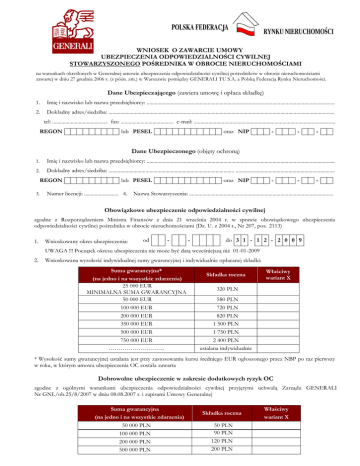 WNIOSEK O ZAWARCIE UMOWY UBEZPIECZENIA ODPOWIEDZIALNOŚCI CYWILNEJ STOWARZYSZONEGO POŚREDNIKA W OBROCIE NIERUCHOMOŚCIAMI na warunkach określonych w Generalnej umowie ubezpieczenia odpowiedzialności cywilnej pośredników w obrocie nieruchomościami zawartej w dniu 27 grudnia 2006 r. (z późn. zm.) w Warszawie pomiędzy GENERALI TU S.A. a Polską Federacją Rynku Nieruchomości. Dane Ubezpieczającego (zawiera umowę i opłaca składkę) 1. Imię i nazwisko lub nazwa przedsiębiorcy: .............................................................................................................................................. 2. Dokładny adres/siedziba: ........................................................................................................................................................................... tel: .......................................... fax: ........................................ e-mail: ........................................................................................................... REGON lub PESEL oraz NIP - - - Dane Ubezpieczonego (objęty ochroną) 1. Imię i nazwisko lub nazwa przedsiębiorcy: .............................................................................................................................................. 2. Dokładny adres/siedziba: ............................................................................................... ........................................................................... REGON 3. lub PESEL Numer licencji: .......................... 4. oraz NIP - - - Nazwa Stowarzyszenia: ............................................................................................................. Obowiązkowe ubezpieczenie odpowiedzialności cywilnej zgodne z Rozporządzeniem Ministra Finansów z dnia 21 września 2004 r. w sprawie obowiązkowego ubezpieczenia odpowiedzialności cywilnej pośrednika w obrocie nieruchomościami (Dz. U. z 2004 r., Nr 207, poz. 2113) 1. Wnioskowany okres ubezpieczenia: od - - do 3 1 - 1 2 - 2 0 0 9 UWAGA !!! Początek okresu ubezpieczenia nie może być datą wcześniejszą niż 01-01-2009 2. Wnioskowana wysokość indywidualnej sumy gwarancyjnej i indywidualnie opłacanej składki: Suma gwarancyjna* (na jedno i na wszystkie zdarzenia) 25 000 EUR MINIMALNA SUMA GWARANCYJNA 50 000 EUR 100 000 EUR 200 000 EUR 350 000 EUR 500 000 EUR 750 000 EUR ………………………. Składka roczna Właściwy wariant X 320 PLN 580 PLN 720 PLN 820 PLN 1 500 PLN 1 750 PLN 2 400 PLN ustalana indywidualnie * Wysokość sumy gwarancyjnej ustalana jest przy zastosowaniu kursu średniego EUR ogłoszonego przez NBP po raz pierwszy w roku, w którym umowa ubezpieczenia OC została zawarta Dobrowolne ubezpieczenie w zakresie dodatkowych ryzyk OC zgodne z ogólnymi warunkami ubezpieczenia odpowiedzialności cywilnej przyjętymi uchwałą Zarządu GENERALI Nr GNL/ob.25/8/2007 w dniu 08.08.2007 r. i zapisami Umowy Generalnej Suma gwarancyjna (na jedno i na wszystkie zdarzenia) 50 000 PLN 100 000 PLN 200 000 PLN 500 000 PLN Składka roczna 50 PLN 90 PLN 120 PLN 200 PLN Właściwy wariant X Przebieg dotychczasowego ubezpieczenia 1. Proszę podać informację na temat dotychczasowych umów obowiązkowego ubezpieczenia odpowiedzialności cywilnej pośrednika w obrocie nieruchomościami (niezależnie od zmiany ubezpieczyciela): Rok Ubezpieczyciel Okres ubezpieczenia Liczba szkód Przedmiot roszczenia Wysokość wypłaconego odszkodowania 2008 2007 2006 2005 2004 2003 2. Jeśli ubezpieczenie jest kontynuacją ubezpieczenia w GENERALI TU S.A., proszę podać numer dotychczasowego dokumentu ubezpieczenia: .......................................................................................................................................................................... Na podstawie art. 815 kodeksu cywilnego podanie informacji wymaganych do zawarcia umowy ubezpieczenia jest obowiązkowe. Oświadczenia (wyrażenie zgody jest niezbędne do zawarcia umowy ubezpieczenia) A. Oświadczam, że wszystkie informacje i oświadczenia podane w niniejszym wniosku o ubezpieczenie są prawdziwe, kompletne i zostały przekazane GENERALI TU S.A. w dobrej wierze zgodnie z posiadaną przeze mnie wiedzą i stanowią podstawę do zawarcia umowy ubezpieczenia. B. Upoważniam brokera ubezpieczeniowego Pierwszy Polski Dom Brokerski SAGA Brokers Sp. z o.o. z siedzibą w Poznaniu, działającego na podstawie zezwolenia KNUiFE (Nr 1405/06) do pośredniczenia w zawarciu wnioskowanej przeze mnie umowy ubezpieczenia. C. Wyrażam zgodę na przetwarzanie przez Generali TU S.A. oraz SAGA Brokers Sp. z o.o., zgodnie z przepisami ustawy z dnia 29 sierpnia 1997 roku o ochronie danych osobowych (Dz. U. Nr 133, poz. 883, z późn. zm.), danych osobowych podanych dobrowolnie, dla celów związanych z zawarciem i wykonywaniem umowy ubezpieczenia. D. Oświadczam, że zapoznałem/am się i akceptuję warunki określone w Generalnej umowie ubezpieczenia odpowiedzialności cywilnej pośredników w obrocie nieruchomościami z dnia 27 grudnia 2006 r. (z późn. zm.) zawartej w Warszawie pomiędzy Generali TU S.A. a Polską Federacją Rynku Nieruchomości. .............................………………………. (miejscowość, data) ....................................................................... (p odpis Ubezpieczającego) Wyrażam zgodę/Nie wyrażam zgody* na przetwarzanie danych osobowych, podanych przeze mnie dla celów związanych z zawarciem i wykonywaniem niniejszej umowy, w celach promocyjno-reklamowych przez podmioty należące do Grupy Generali w Polsce, rozumianej jako grupa spółek obejmująca Generali Finance Sp. z o.o., Generali TU S.A., Generali Życie TU S.A., Generali Powszechne Towarzystwo Emerytalne S.A. oraz podmioty polskie powiązane kapitałowo oraz dominujące i zależne w rozumieniu przepisów kodeksu spółek handlowych w stosunku do wyżej wymienionych spółek. Generali TU S.A. z siedzibą w Warszaw