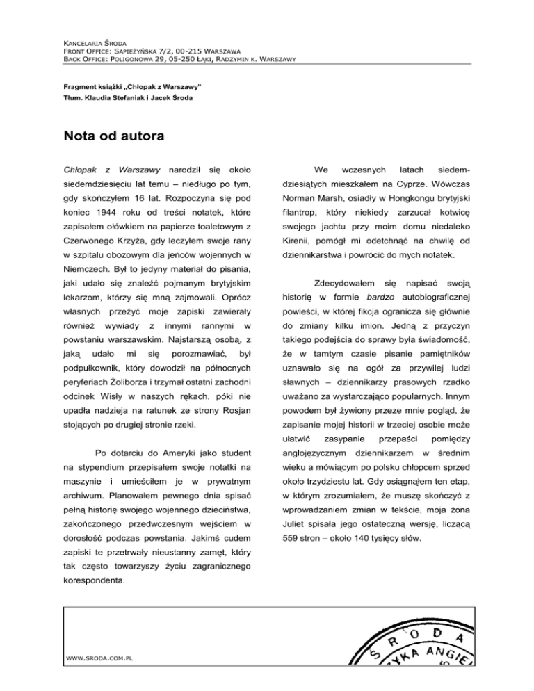 KANCELARIA ŚRODA FRONT OFFICE: SAPIEŻYŃSKA 7/2, 00-215 WARSZAWA BACK OFFICE: POLIGONOWA 29, 05-250 ŁĄKI, RADZYMIN K. WARSZAWY Fragment książki „Chłopak z Warszawy” Tłum. Klaudia Stefaniak i Jacek Środa Nota od autora Chłopak z Warszawy narodził się około We wczesnych latach siedem- siedemdziesięciu lat temu – niedługo po tym, dziesiątych mieszkałem na Cyprze. Wówczas gdy skończyłem 16 lat. Rozpoczyna się pod Norman Marsh, osiadły w Hongkongu brytyjski koniec 1944 roku od treści notatek, które filantrop, zapisałem ołówkiem na papierze toaletowym z swojego jachtu przy moim domu niedaleko Czerwonego Krzyża, gdy leczyłem swoje rany Kirenii, pomógł mi odetchnąć na chwilę od w szpitalu obozowym dla jeńców wojennych w dziennikarstwa i powrócić do mych notatek. który niekiedy zarzucał kotwicę Niemczech. Był to jedyny materiał do pisania, jaki udało się znaleźć pojmanym brytyjskim Zdecydowałem się napisać swoją lekarzom, którzy się mną zajmowali. Oprócz historię w formie bardzo autobiograficznej własnych przeżyć moje zapiski zawierały powieści, w której fikcja ogranicza się głównie również z w do zmiany kilku imion. Jedną z przyczyn powstaniu warszawskim. Najstarszą osobą, z takiego podejścia do sprawy była świadomość, jaką był że w tamtym czasie pisanie pamiętników podpułkownik, który dowodził na północnych uznawało się na ogół za przywilej ludzi peryferiach Żoliborza i trzymał ostatni zachodni sławnych – dziennikarzy prasowych rzadko odcinek Wisły w naszych rękach, póki nie uważano za wystarczająco popularnych. Innym upadła nadzieja na ratunek ze strony Rosjan powodem był żywiony przeze mnie pogląd, że stojących po drugiej stronie rzeki. zapisanie mojej historii w trzeciej osobie może wywiady udało mi innymi się rannymi porozmawiać, ułatwić Po dotarciu do Ameryki jako student zasypanie anglojęzycznym przepaści dziennikarzem pomiędzy w średnim na stypendium przepisałem swoje notatki na wieku a mówiącym po polsku chłopcem sprzed maszynie prywatnym około trzydziestu lat. Gdy osiągnąłem ten etap, archiwum. Planowałem pewnego dnia spisać w którym zrozumiałem, że muszę skończyć z pełną historię swojego wojennego dzieciństwa, wprowadzaniem zmian w tekście, moja żona zakończonego przedwczesnym wejściem w Juliet spisała jego ostateczną wersję, liczącą dorosłość podczas powstania. Jakimś cudem 559 stron – około 140 tysięcy słów. i umieściłem je w zapiski te przetrwały nieustanny zamęt, który tak często towarzyszy życiu zagranicznego korespondenta. WWW.SRODA.COM.PL KANCELARIA ŚRODA FRONT OFFICE: SAPIEŻYŃSKA 7/2, 00-215 WARSZAWA BACK OFFICE: POLIGONOWA 29, 05-250 ŁĄKI, RADZYMIN K. WARSZAWY Ta jednak nigdy nie została w pamiętnik, który powinienem był pisać od opublikowana. Agenci i wydawcy sugerowali samego początku. Niektóre strony pierwotnego zmiany, których nie byłem gotów wprowadzić. skryptu zaginęły, lecz – jak wielu osiemdzie- Latem 1974 roku niemalże zupełnie straciłem sięciolatków, którzy nie pamiętają, co spotkało ów manuskrypt, kiedy musieliśmy tymczasowo ich tydzień temu – często z zaskakującą opuścić dom w Kirenii podczas trwającej dokładnością przypominam sobie sytuacje, wówczas tureckiej inwazji. Odłożyłem go na które przydarzyły mi się w latach czter- bok i pomiędzy pisaniem raportów dotyczących dziestych. konfliktów na Bliskim Wschodzie i Bałkanach – większość z nich była bardziej godna zapa- ostatni raz znalazłem się na linii ognia w miętania. Trzeba jednak przyznać, że Chorwacji w wieku 63 lat – napisałem sześć książek z dziedziny literatury faktu, które Kilka lat temu pokazałem niektóre z spotkały się z uznaniem czytelników, w tym tych poprawek swojemu przyjacielowi Colinowi także historie polityczne Jugosławii i Cypru. Smithowi, pisarzowi i byłemu korespondentowi Później, amerykańskie zagranicznemu magazynu Observer, który, wydawnictwo akademickie Praeger wydało mówiąc słowami jednego z recenzentów jego moją Hitler’s pracy, „zbudował sobie imponującą reputację Punishment and Stalin’s Revenge, stanowiącą jako historyk wojskowości”. Colin zaś pokazał historyczny przegląd powstania warszawskie- je Eleo Gordon, dyrektor redakcji wydawnictwa go. Penguin UK, której tak spodobało się to, co w 2001 książkę roku, Destroy Warsaw!: zobaczyła, że zaproponowała mi pomoc w Niektórzy recenzenci – w szcze- opracowaniu mojej historii. gólności historyk i były oficer amerykański Robert Forczyk – żałowali, że przekazałem W efekcie powstała ta książka. jedynie „najistotniejsze informacje” z własnych doświadczeń z powstania. Zaostrzyło to mój apetyt na powrót do sprawozdania z mojej pełnej historii wojennej, od czasu do czasu próbowałem więc przekształcić części powieści Andrzej Borowiec Nikozja, listopad 2013 r. WWW.SRODA.COM.PL