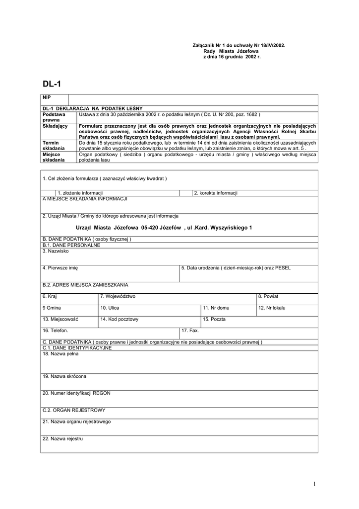 Załącznik Nr 1 do uchwały Nr 18/IV/2002. Rady Miasta Józefowa z dnia 16 grudnia 2002 r. DL-1 NIP DL-1 DEKLARACJA NA PODATEK LEŚNY Podstawa Ustawa z dnia 30 października 2002 r. o podatku leśnym ( Dz. U. Nr 200, poz. 1682 ) prawna Składający Formularz przeznaczony jest dla osób prawnych oraz jednostek organizacyjnych nie posiadających osobowości prawnej, nadleśnictw, jednostek organizacyjnych Agencji Własności Rolnej Skarbu Państwa oraz osób fizycznych będących współwłaścicielami lasu z osobami prawnymi. Termin Do dnia 15 stycznia roku podatkowego, lub w terminie 14 dni od dnia zaistnienia okoliczności uzasadniających składania powstanie albo wygaśnięcie obowiązku w podatku leśnym, lub zaistnienie zmian, o których mowa w art. 5 . Miejsce Organ podatkowy ( siedziba ) organu podatkowego - urzędu miasta / gminy ) właściwego według miejsca składania położenia lasu 1. Cel złożenia formularza ( zaznaczyć właściwy kwadrat ) 1. złożenie informacji A MIEJSCE SKŁADANIA INFORMACJI 2. korekta informacji 2. Urząd Miasta / Gminy do którego adresowana jest informacja Urząd Miasta Józefowa 05-420 Józefów , ul .Kard. Wyszyńskiego 1 B. DANE PODATNIKA ( osoby fizycznej ) B.1. DANE PERSONALNE 3. Nazwisko 4. Pierwsze imię 5. Data urodzenia ( dzień-miesiąc-rok) oraz PESEL B.2. ADRES MIEJSCA ZAMIESZKANIA 6. Kraj 7. Województwo 9 Gmina 10. Ulica 11. Nr domu 13. Miejscowość 14. Kod pocztowy 15. Poczta 16. Telefon. 8. Powiat 12. Nr lokalu 17. Fax. C. DANE PODATNIKA ( osoby prawne i jednostki organizacyjne nie posiadające osobowości prawnej ) C.1. DANE IDENTYFIKACYJNE 18. Nazwa pełna 19. Nazwa skrócona 20. Numer identyfikacji REGON C.2. ORGAN REJESTROWY 21. Nazwa organu rejestrowego 22. Nazwa rejestru 1 23. Data rejestracji 24. Numer w rejestrze 25. Klasa rodzaju działalności ( PKD ) zgodnie z rozporządzeniem Rady Ministrów z dnia 7 października 1997 r. w sprawie Polskiej Klasyfikacji Działalności ( PKD ) – ( Dz. U. Nr 128, poz. 829 z pózn. zmianami ). 26. Forma prawna przedsiębiorstwa. 27. Wielkość przedsiębiorcy – podać wg. ustawy z dnia 19 listopada 1999 r. Prawo działalności gospodarczej ( Dz. U. 101, poz. 1178 z pózn. zmianami ) C.3. ADRES SIEDZIBY. 28. Kraj 31. Gmina 29. Województwo 32. Ulica 35. Miejscowość 30. Powiat 33. Nr domu 36. Kod pocztowy 38. Telefon 34. Nr lokalu 37. Poczta 39. Fax. C. DANE DOTYCZĄCE PRZEDMIOTU OPODATKOWANIA Przedmiot opodatkowania Powierzchnia lasów w hektarach fizycznych Stawka podatku Kwota podatku Grunty sklasyfikowane w ewidencji gruntów jako las 40. 41. 42. Grunty leśne 43. 44. 45. Inne lasy 46. 47. 48. RAZEM 49. Xxxx Xxxxx E. ULGI W PODATKU LEŚNYM. Przedmiot opodatkowania Powierzchnia lasów w hektarach fizycznych Stawka podatku Kwota podatku Lasy ochronne 50. 51. 52. Rezerwaty przyrody 53. 54. 55. Parki narodowe 56. 57. 58. RAZEM 59. XXXX XXXX ŁĄCZNIE KWOTA PODATKU ( do kwoty z pozycji 49 należy dodać kwotę z pozycji 59 ). F. ZWOLNIENIA Z PODATKU LEŚNEGO. F.1. zwolnienia z podatku leśnego ( art. 7 ust. 1 pkt 1 - 3 ) Lasy z drzewostanem w wieku do 40 lat 60. Lasy wpisane indywidualnie do rejestru zabytków 61. Użytki ekologiczne 62. 2 KWOTA ZWOLNIENIA 63. Podatek leśny po odliczeniu zwolnień ( od kwoty w pozycji 56 należy odjąć kwotę z pozycji 60 ). F. 2. Zwolnienia na podstawie art. 7 ust. 2 ustawy 64. 65. Razem zwolnienia 66. PODATEK PO ODLICZENIU ZWOLNIEŃ ( od kwoty z pozycji 64 odjąć kwotę z pozycji 66 ). 67. G. INFORMACJE O LASACH BĘDĄCYCH WE WSPÓŁWŁASNOŚCI ( WSPÓŁPOSIADANIU ) Przedmiot opodatkowania Miejsce położenia lasu Imię i nazwisko współwłaściciela ( współposiadacza ) Adres i miejsce zamieszkania Współwłaściciela ( współposiadacza ) Grunty sklasyfikowane w 68. ewidencji gruntów jako las Grunty leśne 71. 69. 70. 72. 73. Grunty leśne zabudowane 74. 75. 76. Grunty zadrzewione i zakrzaczone 77. 78. 79. Lasy z drzewostanem w wieku do 40 lat 80. 81. 82. Lasy wpisane 83. indywidualnie do rejestru zabytków Lasy ochronne 86. 84. 85. 87. 88 Rezerwaty przyrody 89. 90. 91. Użytki ekologiczne 92. 93. 94. H. ADRES DO KORESPONDENCJI 95. Kraj 96. Województwo 98. Gmina 99. Ulica 102. Telefon 97. Powiat 100. Nr domu 101. Nr lokalu 103. Fax 104. Numer rachunku bankowego i nazwa banku I. II. OŚWIADCZENIE I PODPIS PODATNIKA I.1. OŚWIADCZENIE I PODPIS SKŁADAJĄCEGO */ OSOBY REPREZENTUJĄCEJ SKŁADAJĄCEGO* ( niepotrzebne Skreślić). Oświadczam, że znana jest mi odpowiedzialność karna skarbowa za podanie danych niezgodnych z rzeczywistością. 105. Imię 106. Nazwisko 107. Data wypełnienia deklaracji. 108. Podpis ( pieczęć ) składającego* / osoby reprezentującej składającego * ( niepotrzebne skreślić ) 3 J. ADNOTACJE ORGANU PODATKOWEGO J.1. Uwagi organu podatkowego Pouczenie: W wypadku nie wpłacenia w obowiązującym terminie kwoty z pozycji 64 lub wpłacenia jej w niepełnej wysokości, niniejsza deklaracja stanowi podstawę do wystawienia tytułu wykonawczego, zgodnie z art. 3a ustawy z dnia 17 czerwca 1966 r. o postępowaniu egzekucyjnym w administracji ( Dz. U. z 2005 r. Nr229, poz.1954 ) 4