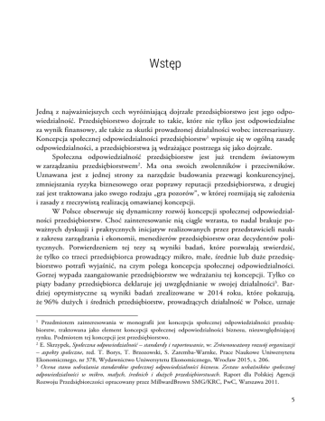 Wstęp Jedną z najważniejszych cech wyróżniającą dojrzałe przedsiębiorstwo jest jego odpowiedzialność. Przedsiębiorstwo dojrzałe to takie, które nie tylko jest odpowiedzialne za wynik finansowy, ale także za skutki prowadzonej działalności wobec interesariuszy. Koncepcja społecznej odpowiedzialności przedsiębiorstw1 wpisuje się w ogólną zasadę odpowiedzialności, a przedsiębiorstwa ją wdrażające postrzega się jako dojrzałe. Społeczna odpowiedzialność przedsiębiorstw jest już trendem światowym w zarządzaniu przedsiębiorstwem2. Ma ona swoich zwolenników i przeciwników. Uznawana jest z jednej strony za narzędzie budowania przewagi konkurencyjnej, zmniejszania ryzyka biznesowego oraz poprawy reputacji przedsiębiorstwa, z drugiej zaś jest traktowana jako swego rodzaju „gra pozorów”, w której rozmijają się założenia i zasady z rzeczywistą realizacją omawianej koncepcji. W Polsce obserwuje się dynamiczny rozwój koncepcji społecznej odpowiedzialności przedsiębiorstw. Choć zainteresowanie nią ciągle wzrasta, to nadal brakuje poważnych dyskusji i praktycznych inicjatyw realizowanych przez przedstawicieli nauki z zakresu zarządzania i ekonomii, menedżerów przedsiębiorstw oraz decydentów politycznych. Potwierdzeniem tej tezy są wyniki badań, które pozwalają stwierdzić, że tylko co trzeci przedsiębiorca prowadzący mikro, małe, średnie lub duże przedsiębiorstwo potrafi wyjaśnić, na czym polega koncepcja społecznej odpowiedzialności. Gorzej wypada zaangażowanie przedsiębiorstw we wdrażaniu tej koncepcji. Tylko co piąty badany przedsiębiorca deklaruje jej uwzględnianie w swojej działalności3. Bardziej optymistyczne są wyniki badań zrealizowane w 2014 roku, które pokazują, że 96% dużych i średnich przedsiębiorstw, prowadzących działalność w Polsce, uznaje 1 Przedmiotem zainteresowania w monografii jest koncepcja społecznej odpowiedzialności przedsiębiorstw, traktowana jako element koncepcji społecznej odpowiedzialności biznesu, nieuwzględniającej rynku. Podmiotem tej koncepcji jest przedsiębiorstwo. 2 E. Skrzypek, Społeczna odpowiedzialność – standardy i raportowanie, w: Zrównoważony rozwój organizacji – aspekty społeczne, red. T. Borys, T. Brzozowski, S. Zaremba-Warnke, Prace Naukowe Uniwersytetu Ekonomicznego, nr 378, Wydawnictwo Uniwersytetu Ekonomicznego, Wrocław 2015, s. 206. 3 Ocena stanu wdrażania standardów społecznej odpowiedzialności biznesu. Zestaw wskaźników społecznej odpowiedzialności w mikro, małych, średnich i dużych przedsiębiorstwach. Raport dla Polskiej Agencji Rozwoju Przedsiębiorczości opracowany przez MillwardBrown SMG/KRC, PwC, Warszawa 2011. 5 za swój obowiązek odpowiadanie na wyzwania społeczne i ekologiczne. Pomimo jednak wyraźnych deklaracji przedsiębiorstw, w swojej strategii działania społecznie odpowiedzialne uwzględnia 45% przedsiębiorstw, a kolejne 15% z nich rozważa podjęcie takich działań w przyszłości4. Kontekst pomiarowy związany z prowadzoną przez przedsiębiorstwa działalnością społecznie odpowiedzialną5 jest ważny, jednak słabo rozpoznany w literaturze przedmiotu i praktyce gospodarczej. Ma on fundamentalne znaczenie, gdyż dzięki zastosowaniu narzędzi pomiarowych możliwe jest pokazanie wagi i efektów podejmowanych w ramach tej koncepcji działań. Większość teoretyków i praktyków zarządzania jest zgodna, że jeśli nie można czegoś zmierzyć, nie można tym zarządzać6, a tym samym doskonalić działań realizowanych w ramach analizowanej koncepcji. W literaturze przedmiotu są opisane różnorodne podejścia do mierzenia działalności społecznie odpowiedzialnej. Pomimo jednak względnej liczebności metod, technik i wskaźników wykorzystywanych w procesie pomiaru, nadal wskazać można jego niedoskonałości. Za najważniejsze z nich należy uznać: niespójne rozumienie przez przedsiębiorców koncepcji społecznej odpowiedzialności, fragmentaryczny pomiar działań realizowanych w ramach koncepcji, trudności w prowadzeniu pomiaru na różnych etapach wdrażania koncepcji, niejednoznaczność ujęć pomiaru działalności społecznie odpowiedzialnej (stosowanie różnorodnych metod pomiarowych, technik badawczych i wskaźników). Uzasadniając podjęcie tematu można wskazać następujące niedostatki zidentyfikowane w opracowaniach teoretycznych oraz badaniach empirycznych: • luka teoretyczna, wynikająca z niedostatecznego rozpoznania problematyki związanej z pomiarem działań społecznie odpowiedzialnych; • luka empiryczna, wynikająca z niepełnych, fragmentarycznych wyników badań w zakresie pomiaru prowadzonej przez przedsiębiorstwa działalności społecznie odpowiedzialnej; • luka metodyczna, wynikająca z braku jednej, powszechnie wykorzystywanej metodyki służącej do pomiaru działań społecznie odpowiedzialnych. 4 Społeczna odpowiedzialność biznesu: fakty a opinie, KPMG, Forum Odpowiedzialnego Biznesu, Warszawa 2014. 5 W niniejszej monografii zamiennie będą stosowane terminy społeczna odpowiedzialność przedsiębiorstw, działania społecznie odpowiedzialne i działalność społecznie odpowiedzialna. Na działalność społecznie odpowiedzialną składają się działania społecznie odpowiedzialne. 6 R.S. Kaplan, D.P. Norton, Strategiczna karta wyników. Jak przełożyć strategię na działania, PWN, Warszawa 2002. 6 Biorąc pod uwagę niedoskonałości stosowanych podejść do pomiaru działalności społecznie odpowiedzialnej, zaproponowano wykorzystanie ewaluacji do analizy tej koncepcji. Spośród wielu możliwych do zastosowania form analizy i oceny koncepcji społecznej odpowiedzialności przedsiębiorstw na szczególną uwagę, zdaniem autorki monografii, zasługuje ewaluacja, ponieważ wyróżnia się: • analitycznym i usystematyzowanym charakterem badań; • łączeniem empirii z charakterem normatywnym; • możliwością wyjścia poza kano