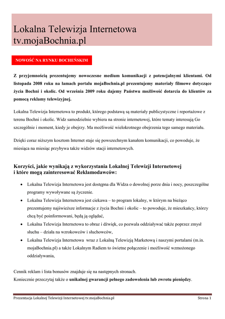 Lokalna Telewizja Internetowa tv.mojaBochnia.pl OWOŚĆ A RYKU BOCHEŃSKIM Z przyjemnością prezentujemy nowoczesne medium komunikacji z potencjalnymi klientami. Od listopada 2008 roku na łamach portalu mojaBochnia.pl prezentujemy materiały filmowe dotyczące życia Bochni i okolic. Od września 2009 roku dajemy Państwu możliwość dotarcia do klientów za pomocą reklamy telewizyjnej. Lokalna Telewizja Internetowa to produkt, którego podstawą są materiały publicystyczne i reportażowe z terenu Bochni i okolic. Widz samodzielnie wybiera na stronie internetowej, które tematy interesują Go szczególnie i moment, kiedy je obejrzy. Ma możliwość wielokrotnego obejrzenia tego samego materiału. Dzięki coraz niższym kosztom Internet staje się powszechnym kanałem komunikacji, co powoduje, że miesiąca na miesiąc przybywa także widzów stacji internetowych. Korzyści, jakie wynikają z wykorzystania Lokalnej Telewizji Internetowej i które mogą zainteresować Reklamodawców: • Lokalna Telewizja Internetowa jest dostępna dla Widza o dowolnej porze dnia i nocy, poszczególne programy wywoływane są życzenie. • Lokalna Telewizja Internetowa jest ciekawa – to program lokalny, w którym na bieżąco prezentujemy najświeższe informacje z życia Bochni i okolic – to powoduje, że mieszkańcy, którzy chcą być poinformowani, będą ją oglądać, • Lokalna Telewizja Internetowa to obraz i dźwięk, co pozwala oddziaływać także poprzez zmysł słuchu – działa na wzrokowców i słuchowców, • Lokalna Telewizja Internetowa wraz z Lokalną Telewizją Marketową i naszymi portalami (m.in. mojaBochnia.pl) a także Lokalnym Radiem to świetne połączenie i możliwość wzmożonego oddziaływania, Cennik reklam i lista bonusów znajduje się na następnych stronach. Koniecznie przeczytaj także o unikalnej gwarancji pełnego zadowolenia lub zwrotu pieniędzy. Prezentacja Lokalnej Telewizji Internetowej tv.mojaBochnia.pl Strona 1 Cennik reklam w Lokalnej Telewizji Internetowej Obowiązujący od 1 września 2009 do 30 listopada 2009 – ceny netto PROMOCJA „MIODOWY MIESIĄC” REKLAMA ZA GROSZE 1 tydzień 2 tyg. 3 tyg. 1m-c Reklama telewizyjna 15 sekund 109 zł 169 zł 229 zł 279 zł Reklama telewizyjna 30 sekund 129 zł 199 zł 259 zł 319 zł 199 zł 289 zł 389 zł 479 zł 169 zł 199 zł Format reklamy / czas emisji Reklama telewizyjna 1 minuta Pakiet 2x więcej w tym samym czasie + 30 % Pakiet 3x więcej w tym samym czasie + 65 % Pakiet 4x więcej w tym samym czasie + 100 % Pasek informacyjno-reklamowy Treść reklamy prezentowana jest, jako co dziesiąta wiadomość, 89 zł 129 zł maksymalna długość nie może przekroczyć 250 znaków od 100 zł – reklama planszowa, Przygotowanie reklamy od 200 zł – reklama telewizyjna, cena do uzgodnienia w zależności m.in. od długości, scenariusza, ilości ujęć i zaangażowania osób trzecich Zmiana w gotowym projekcie do uzgodnienia Błyskawicznie publikujemy reklamy Publikację reklamy rozpoczynamy w momencie wpłynięcia na nasze konto uzgodnionej kwoty za pierwszy okres emisji reklamy. Na nasze usługi wystawiamy faktury VAT płatne przelewem. Przygotowujemy spełniające oczekiwania projekty reklamy Na Państwa potrzeby możemy zlecić przygotowanie reklamy współpracującym z nami filmowcami i grafikami. Prosimy wtedy o przygotowanie zawartości (treści, znaków graficznych, zdjęć), które Państwo chcecie wyeksponować. Przygotowany projekt przedstawiamy do podglądu i ew. ostatnich poprawek. W przypadku reklamy mniej skomplikowanej cały proces najczęściej trwa ok. 1 tygodnia, natomiast przy bardziej rozbudowanych scenariuszach ok. 2-3 tygodnie. Prezentacja Lokalnej Telewizji Internetowej tv.mojaBochnia.pl Strona 2 Jakie dodatkowe bonusy może zyskać Reklamodawca? Jeśli posiadasz swoją stronę internetową (jeśli nie – my możemy ją zrobimy dla Ciebie), dostaniesz od nas zupełnie bez opłat wpis do rubryki „Koniecznie tu zajrzyj” prezentowanej na łamach portalu www.mojaBochnia.pl i na wszystkich nośnikach Lokalnej Telewizji Marketowej, a także w Lokalnej Telewizji Internetowej i Lokalnym Radiu mojaBochnia. Bez dodatkowych opłat - wartość rynkowa: 299 zł netto miesięcznie, Roczny wpis do lokalnego informatora internetowego: www.infoBochnia.pl lub www.infoBrzesko.pl lub www.infoWieliczka.pl, Bez dodatkowych opłat - wartość rynkowa: 169 zł netto miesięcznie, Tekst sponsorowany na portalu www.mojaBochnia.pl lub www.mojeBrzesko.pl lub www.mojaWieliczka.pl (przez okres jednego roku od momentu publikacji) a także Lokalnym Radio mojaBochnia (przez okres jednego tygodnia) Bez dodatkowych opłat - wartość rynkowa: 239 zł netto miesięcznie, Do 25% upustu przy umowach długoterminowych 3 miesiące: 10% 6 miesięcy: 15% 9 miesięcy: 20% 12 miesięcy: 25% Wartość rynkowa: do kilkuset złotych miesięcznie, Do 40% zniżki na reklamę w serwisach: www.mojaBochnia.pl, www.mojeBrzesko.pl, www.mojaWieliczka.pl Wartość rynkowa: do kilkuset złotych miesięcznie, Do 40% zniżki na reklamę w Lokalnej Telewizji Marketowej i Lokalnej Telewizji Internetowej, a także w Lokalnym Radiu mojaBochnia Wartość rynkowa: do kilkuset złotych miesięcznie, Do 90% zniżki na reklamę w serwisach :www.infoBochnia.pl, www.infoBrzesko.pl, www.infoWieliczka.pl, Wartość rynkowa: do kilkuset złotych miesięcznie, Możliwość bezpłatnego wydłużenia czasu emisji reklamy telewizyjnej nawet do trzech miesięcy Wartość rynkowa: do kilkuset złotych miesięcznie, Łączna wartość dodatkowego wsparcia reklamowego, które może uzyskać Reklamodawca sięga wartości od 707 zł aż do kilku tysięcy złotych miesięcznie. Prezentacja Lokalnej Telewizji Internetowej tv.mojaBochnia.pl Strona 3 Gwarancja: pełne zadowolenie albo zwrot pieniędzy Reklamodawca dostaje od nas także unikalną gwarancję pełnego zwrotu wpłaconych pieniędzy. Jeśli w ciągu tygodnia stwierdzisz, że nie chcesz z jakiego